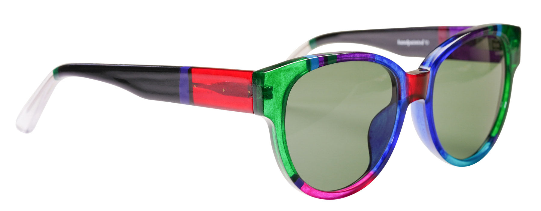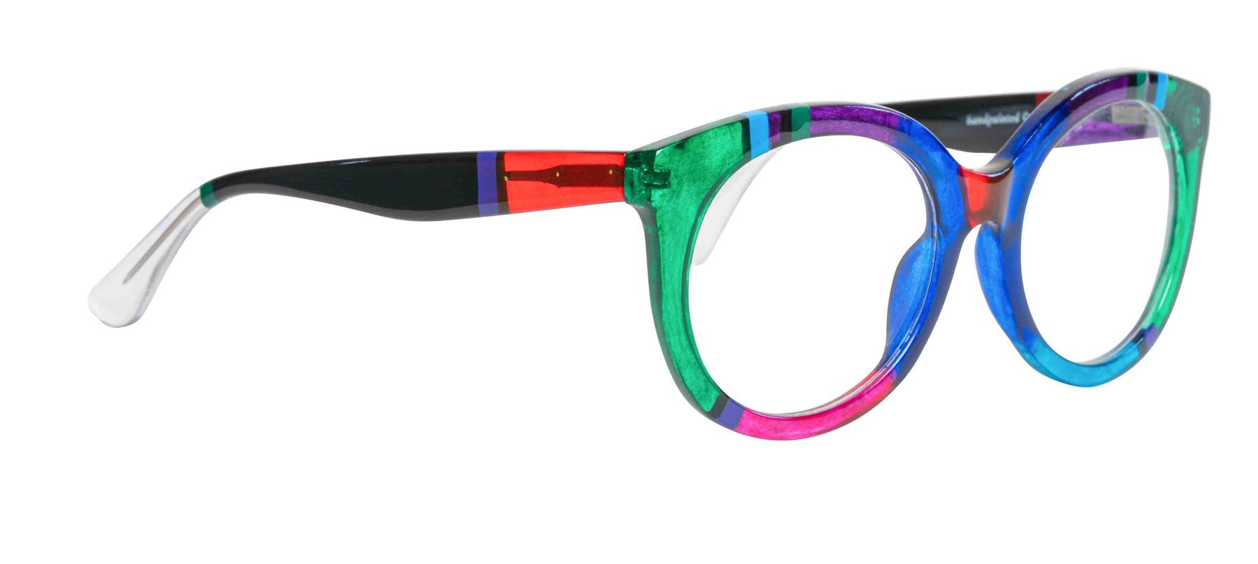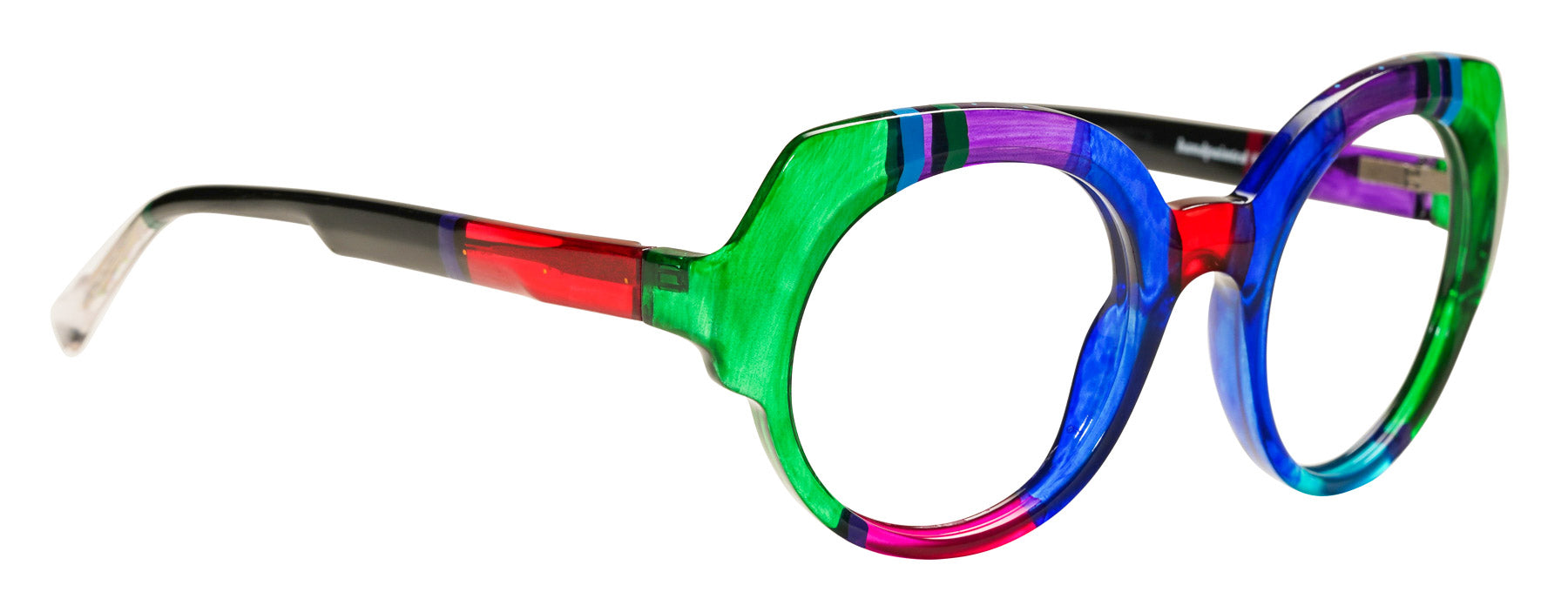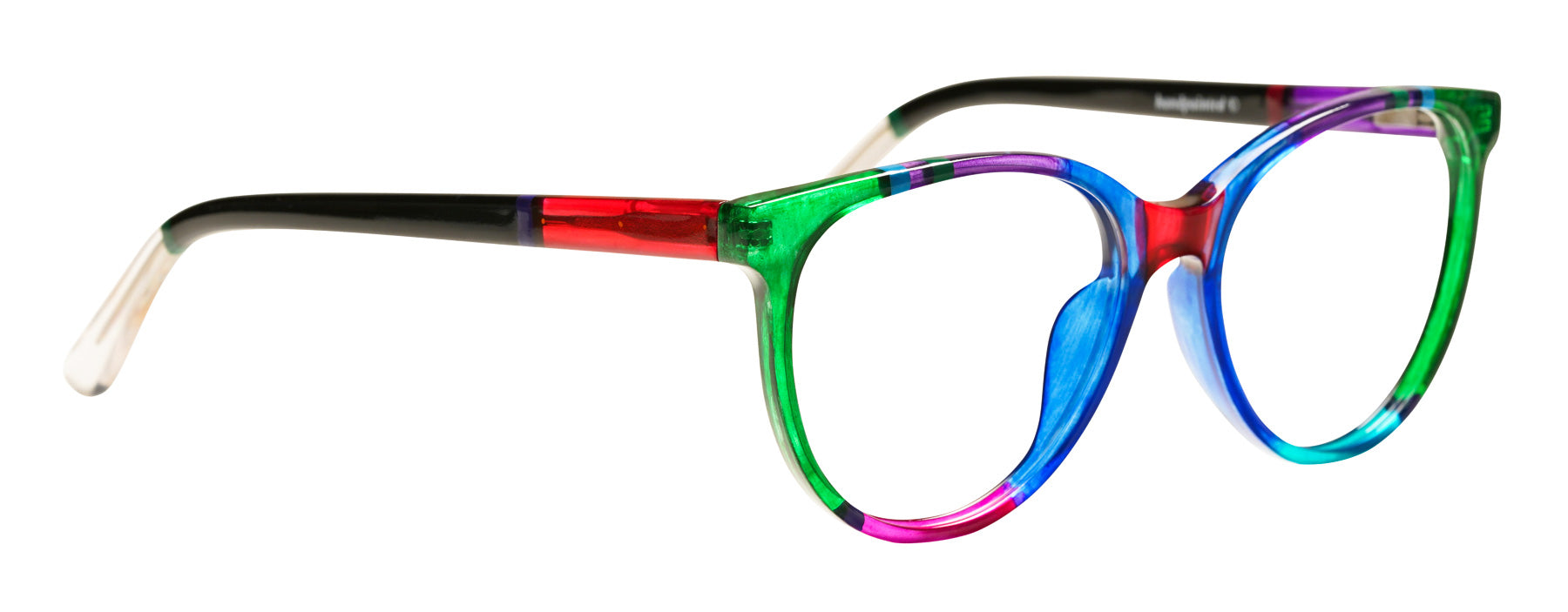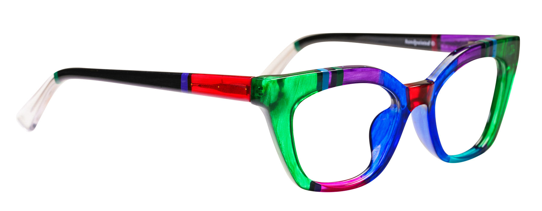 Multicolor Transparent Green, Blue and Purple front with Opaque banding and micro dot detailing. Temples in Opaque Black and Transparent Purple and Red with Opaque stripes.