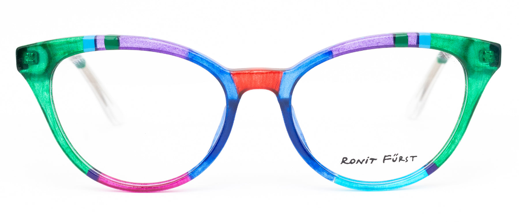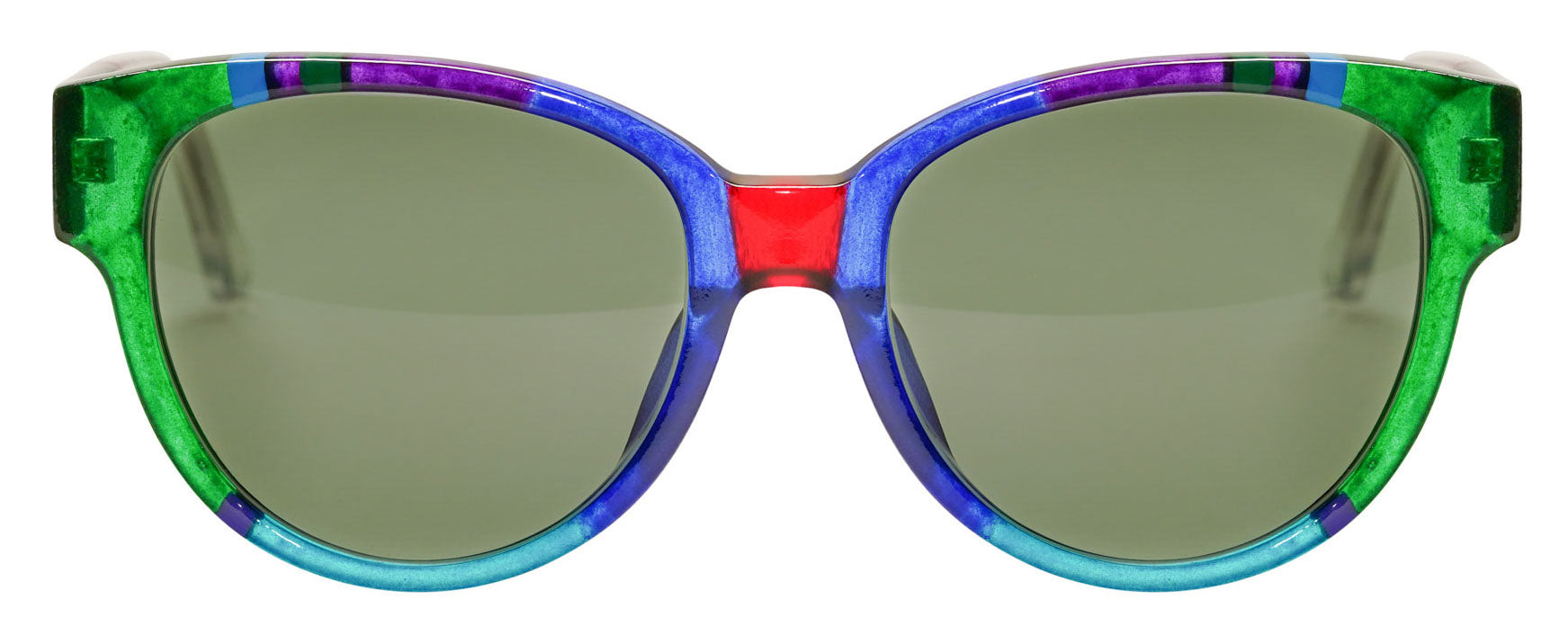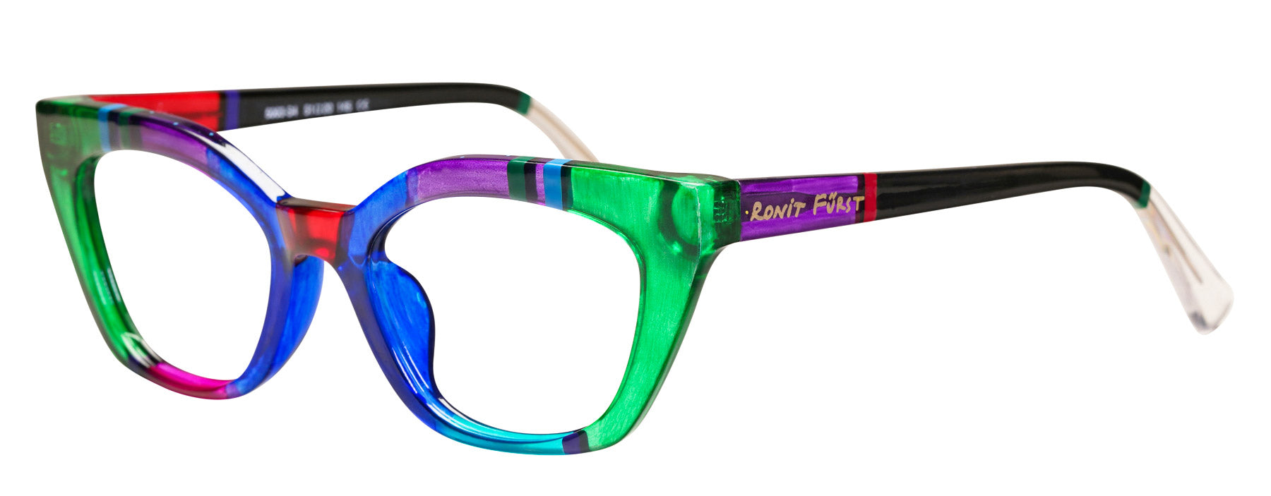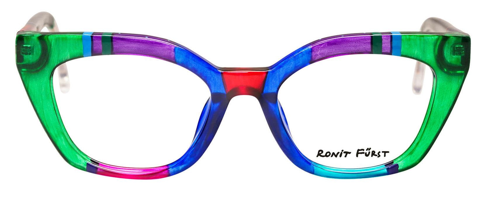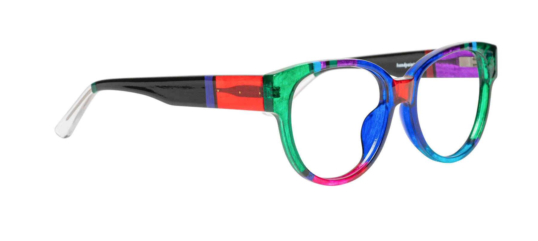 Multicolor Transparent Green, Blue and Purple front with Opaque banding and micro dot detailing. Temples in Opaque Black and Transparent Purple and Red with Opaque stripes.