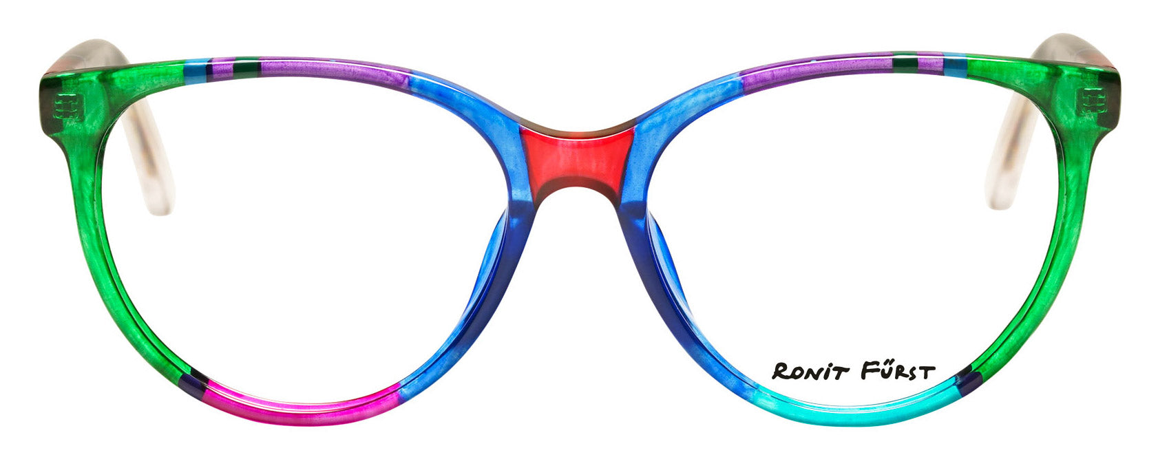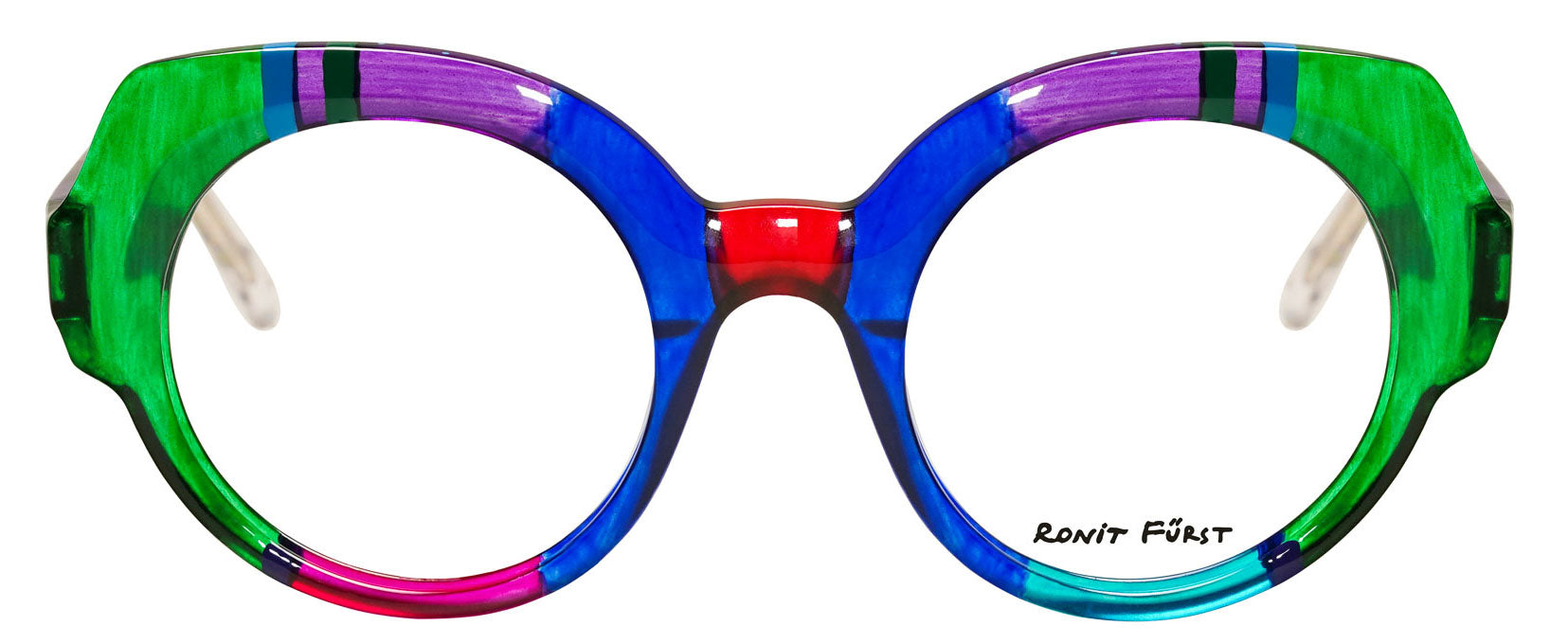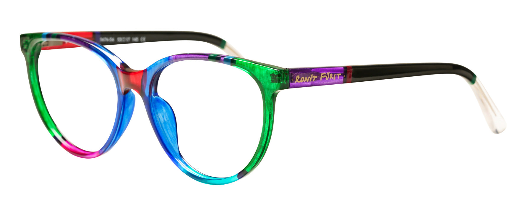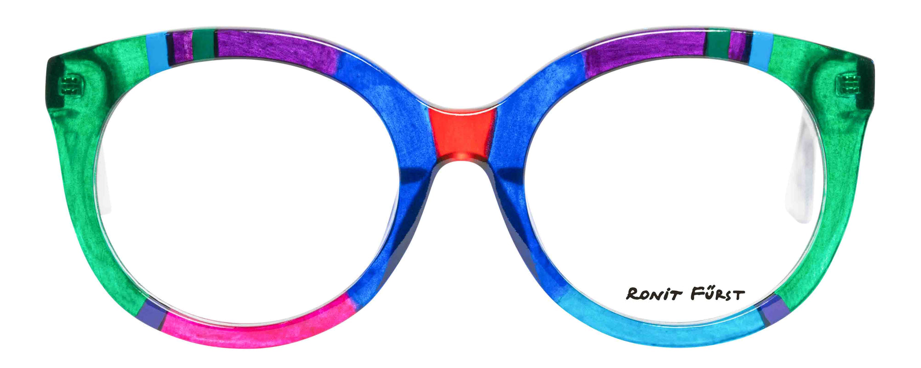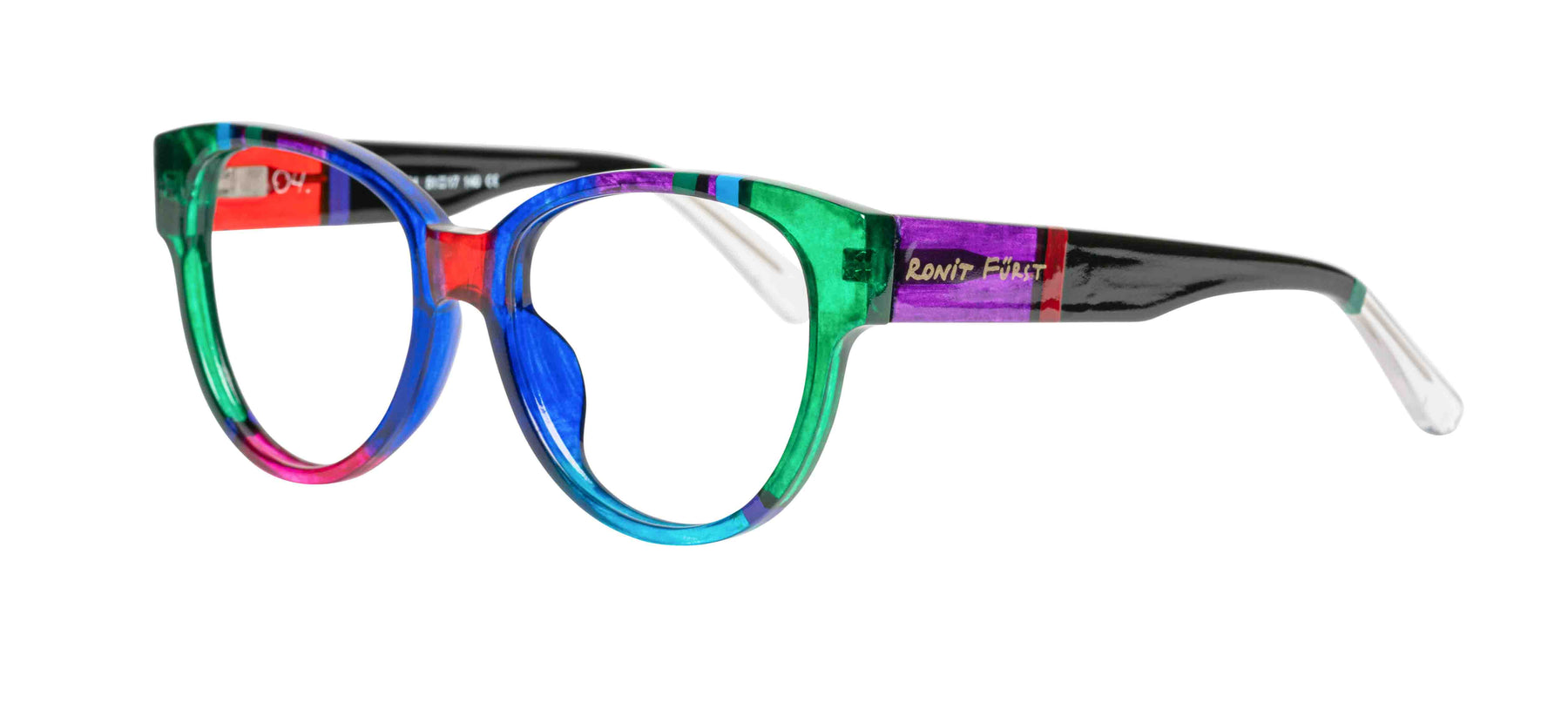 Multicolor Transparent Green, Blue and Purple front with Opaque banding and micro dot detailing. Temples in Opaque Black and Transparent Purple and Red with Opaque stripes.