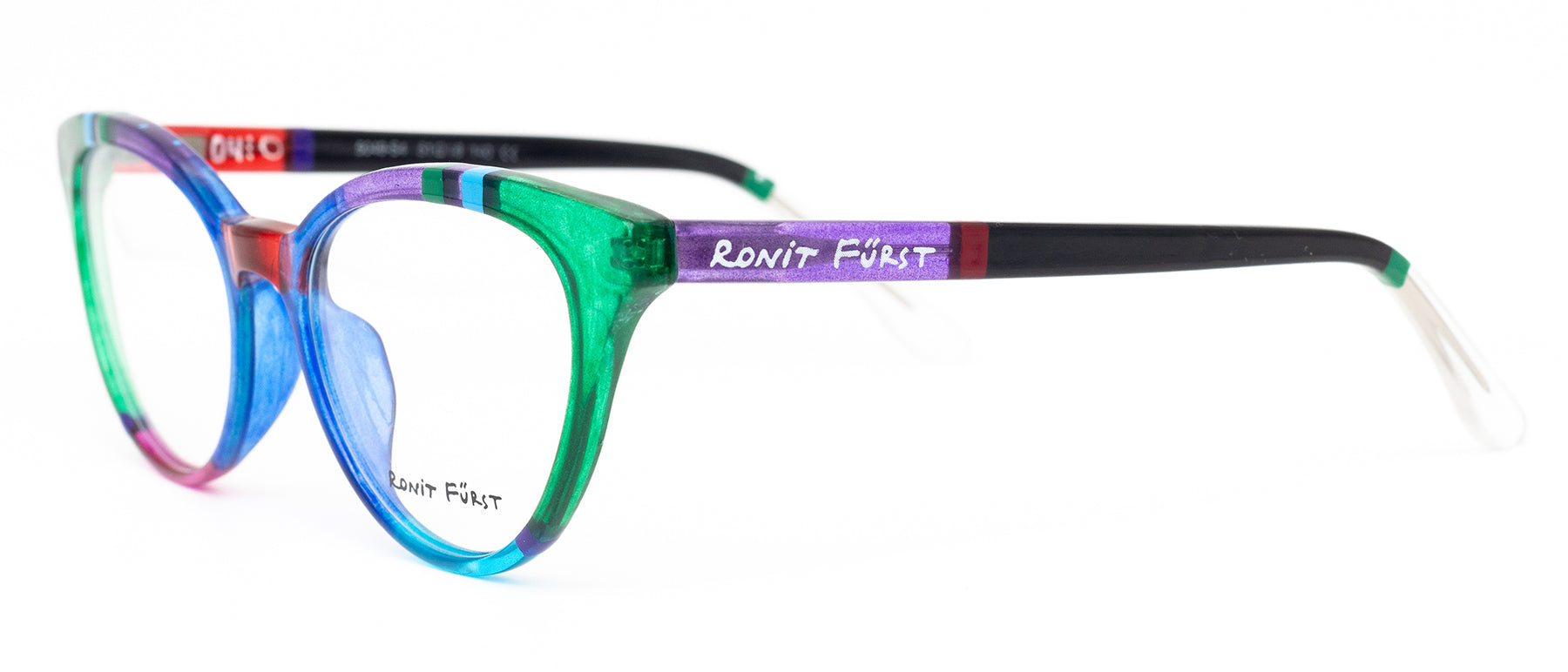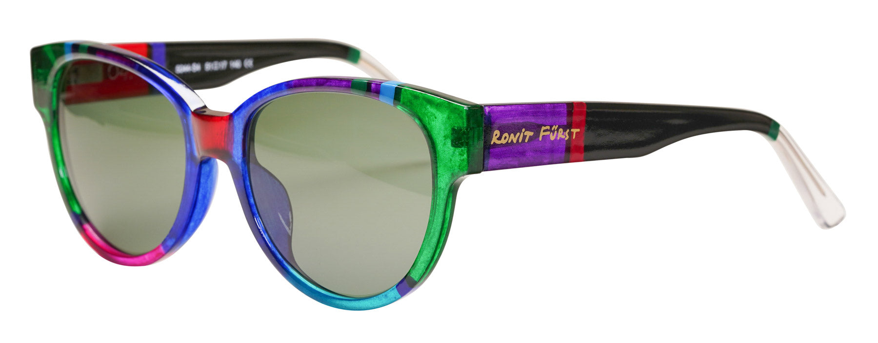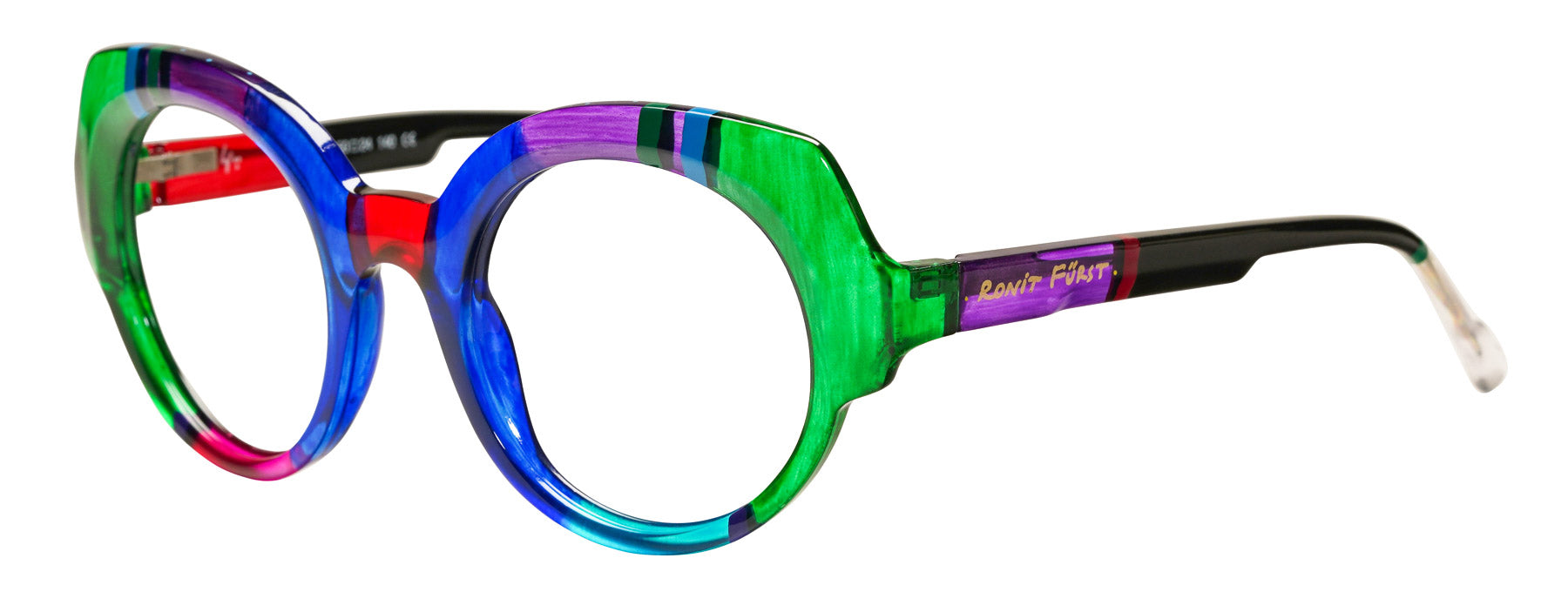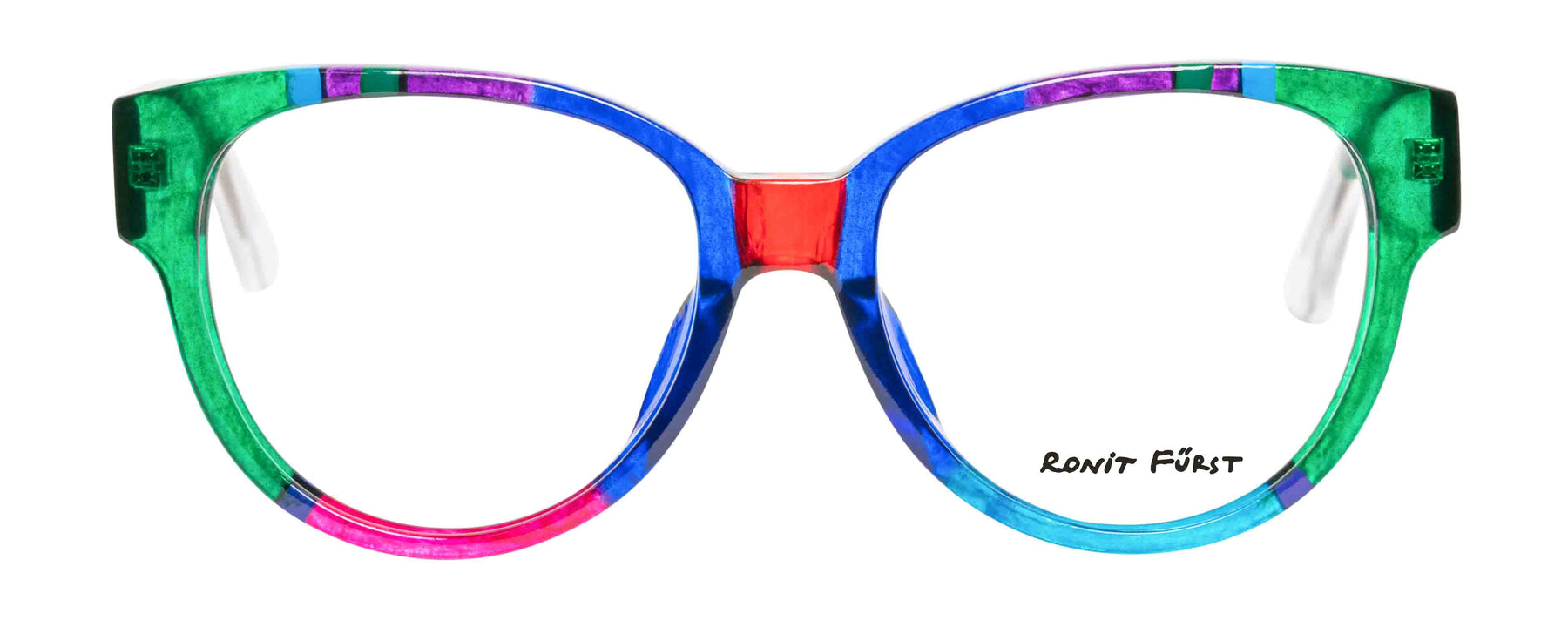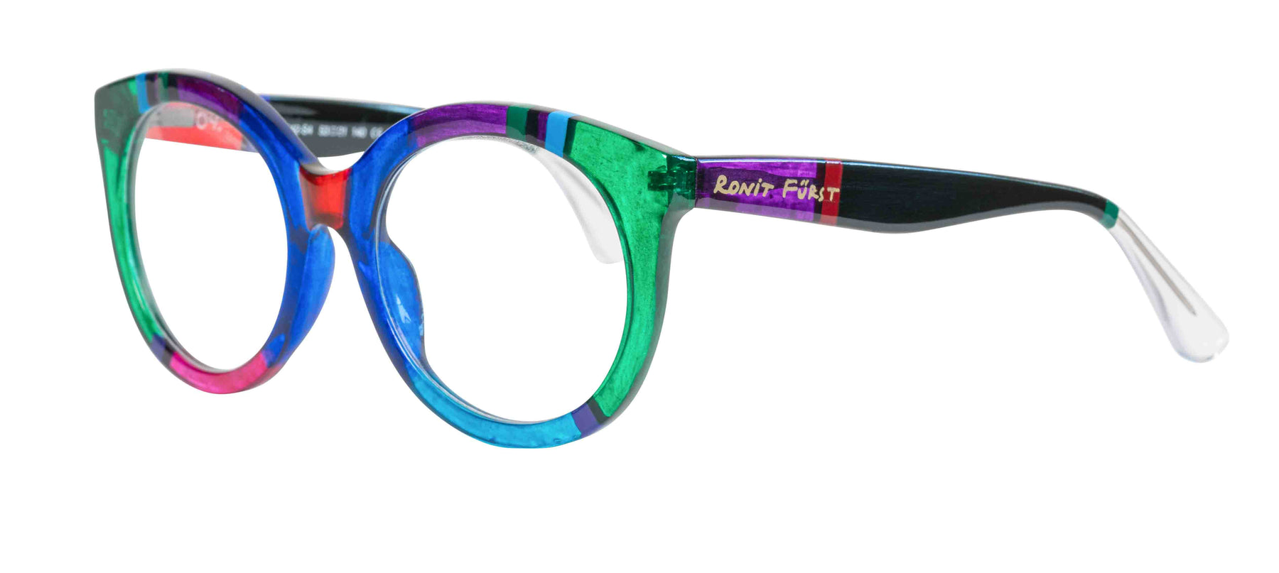 Multicolor Transparent Green, Blue and Purple front with Opaque banding and micro dot detailing. Temples in Opaque Black and Transparent Purple and Red with Opaque stripes.