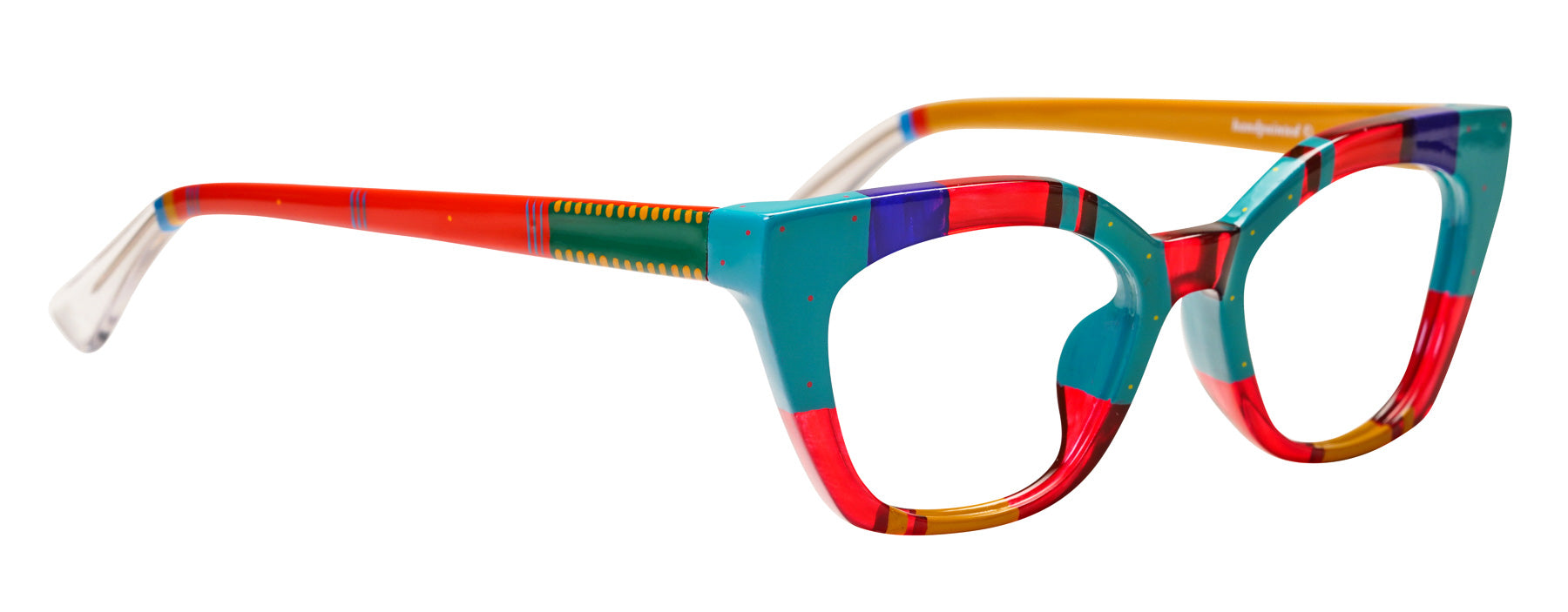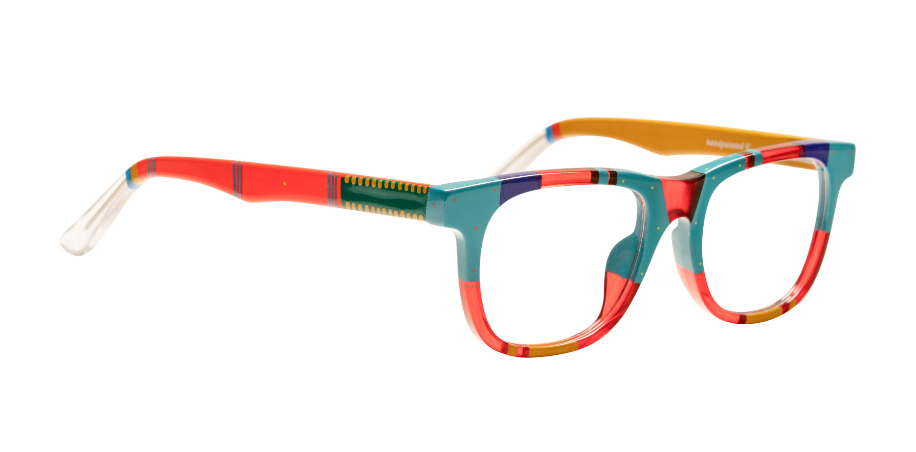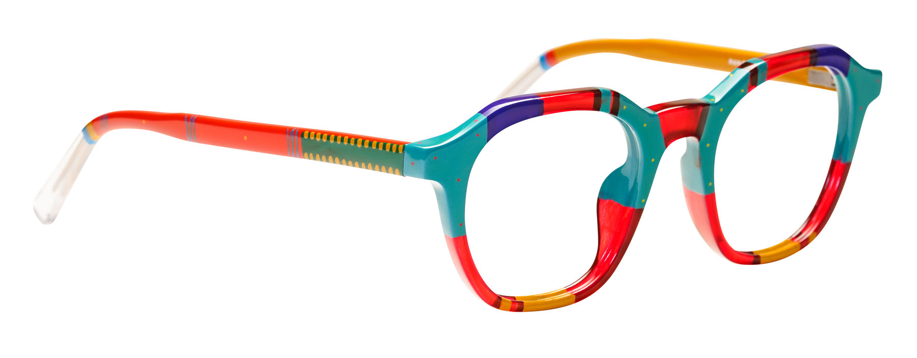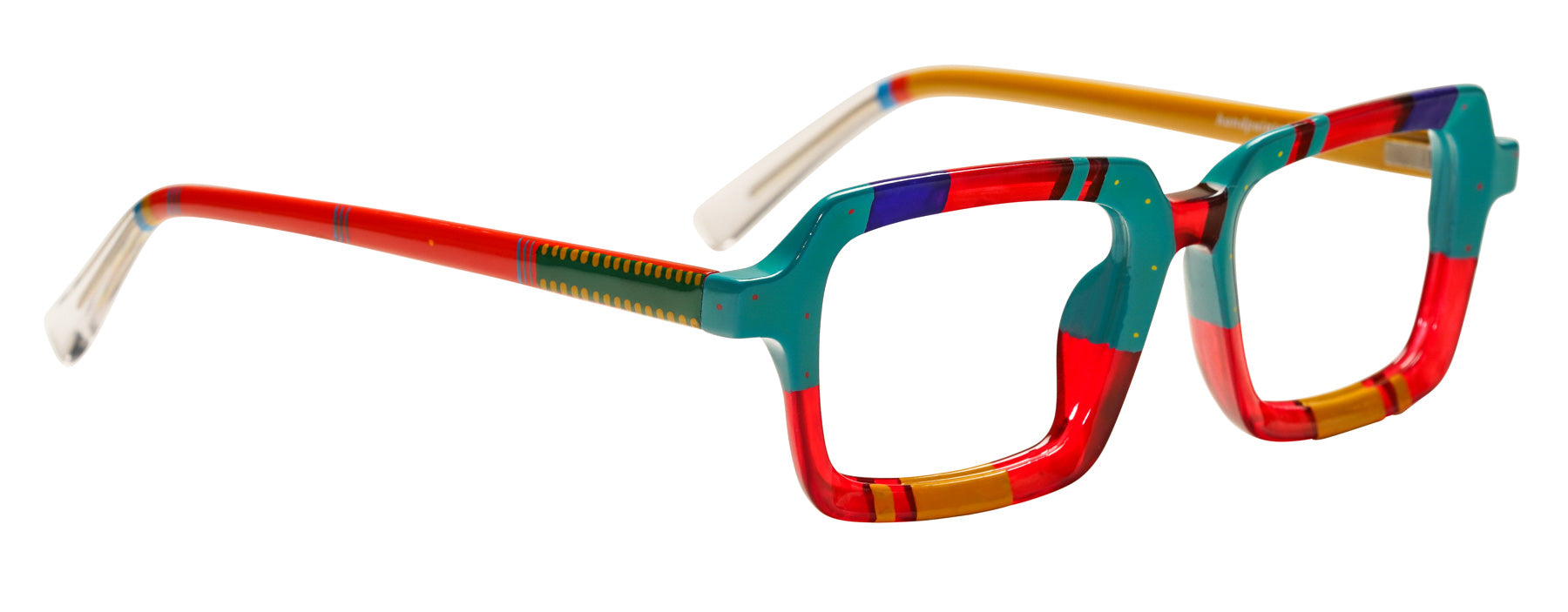 Multicolor Transparent and Opaque front with Opaque micro dot detailing. Temples in Opaque Red and Ochre with Opaque Turquoise stripe detailing.