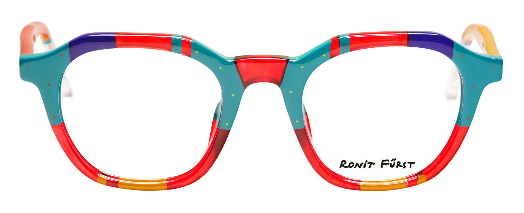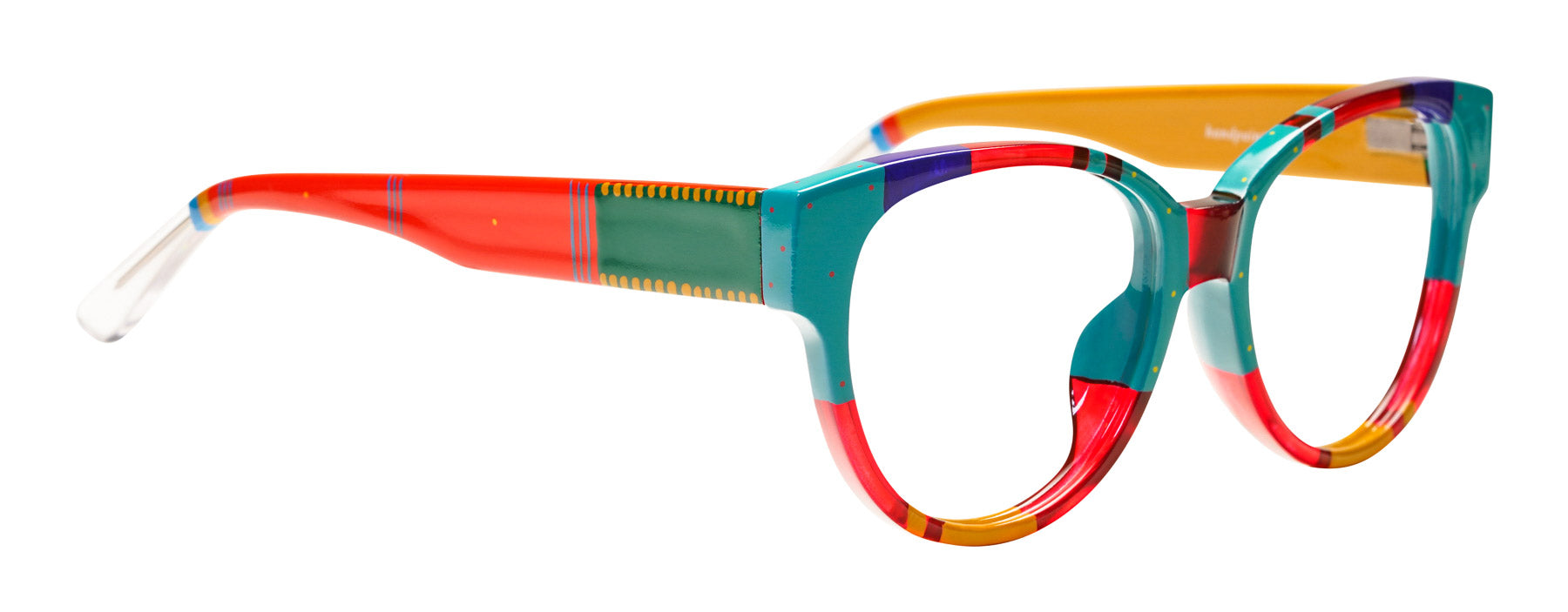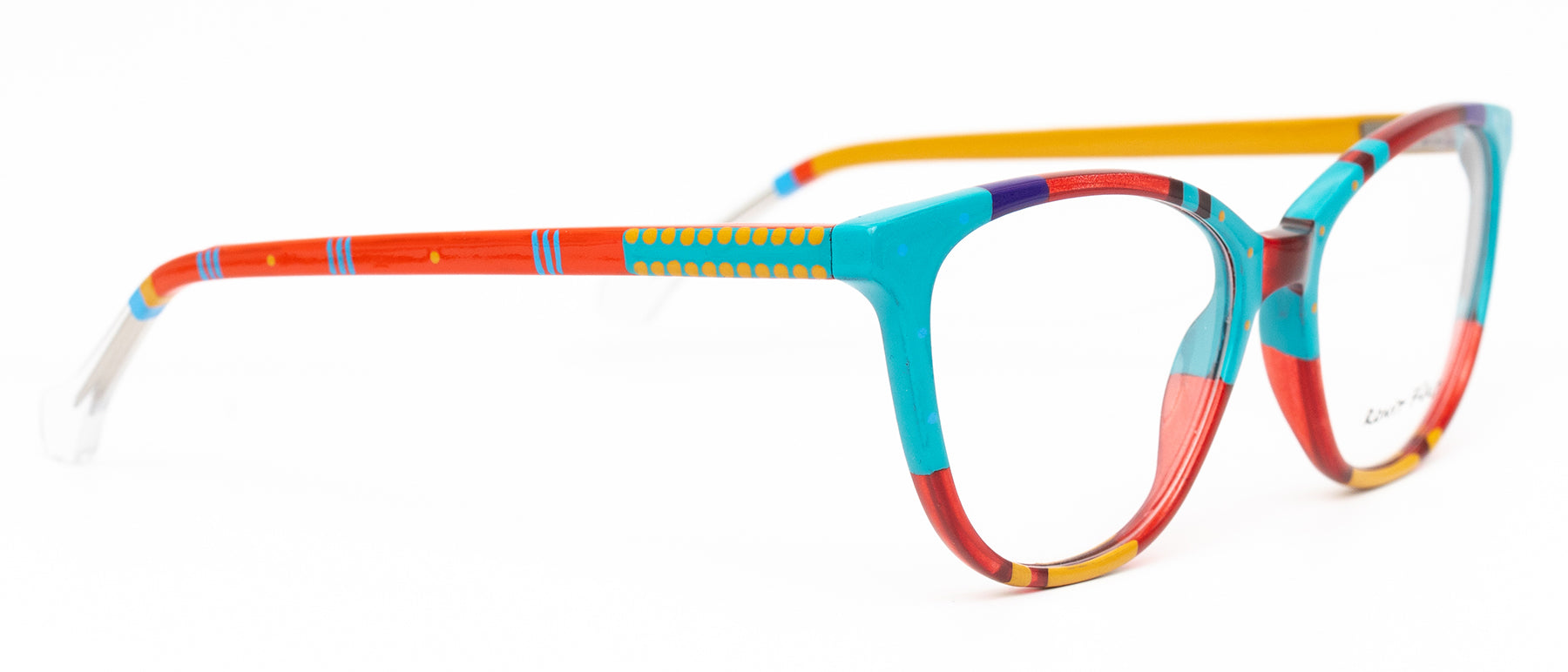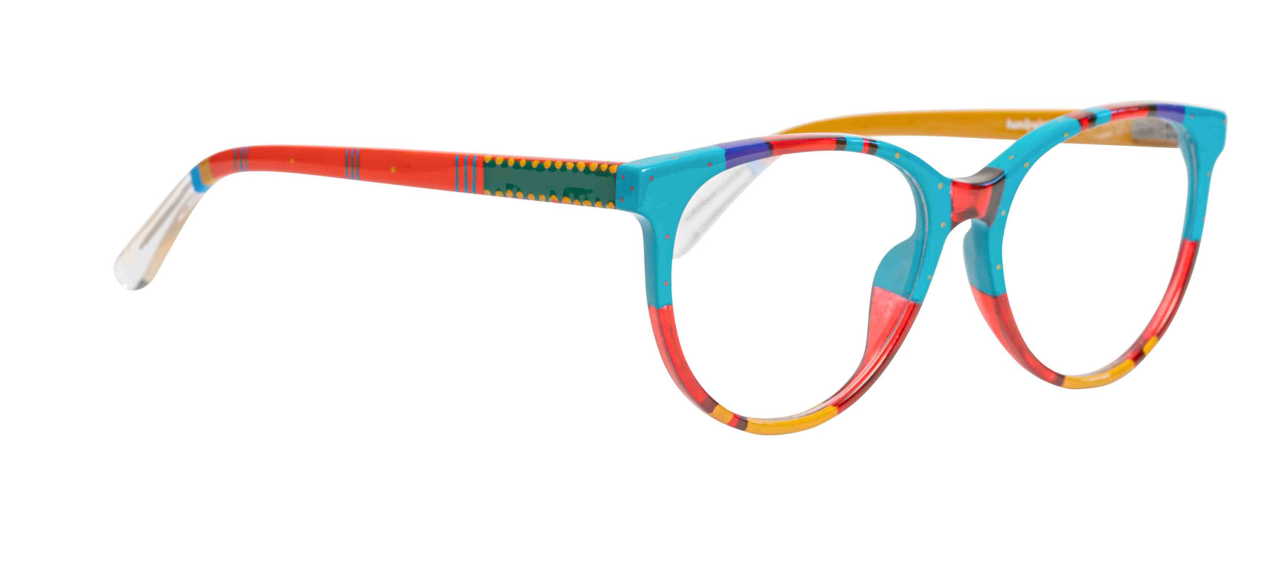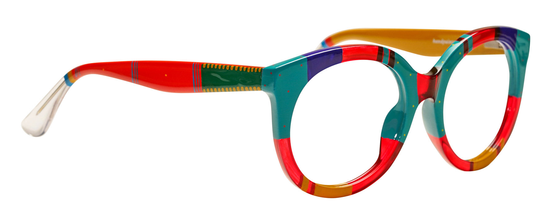 Multicolor Transparent and Opaque front with Opaque micro dot detailing. Temples in Opaque Red and Ochre with Opaque Turquoise stripe detailing.