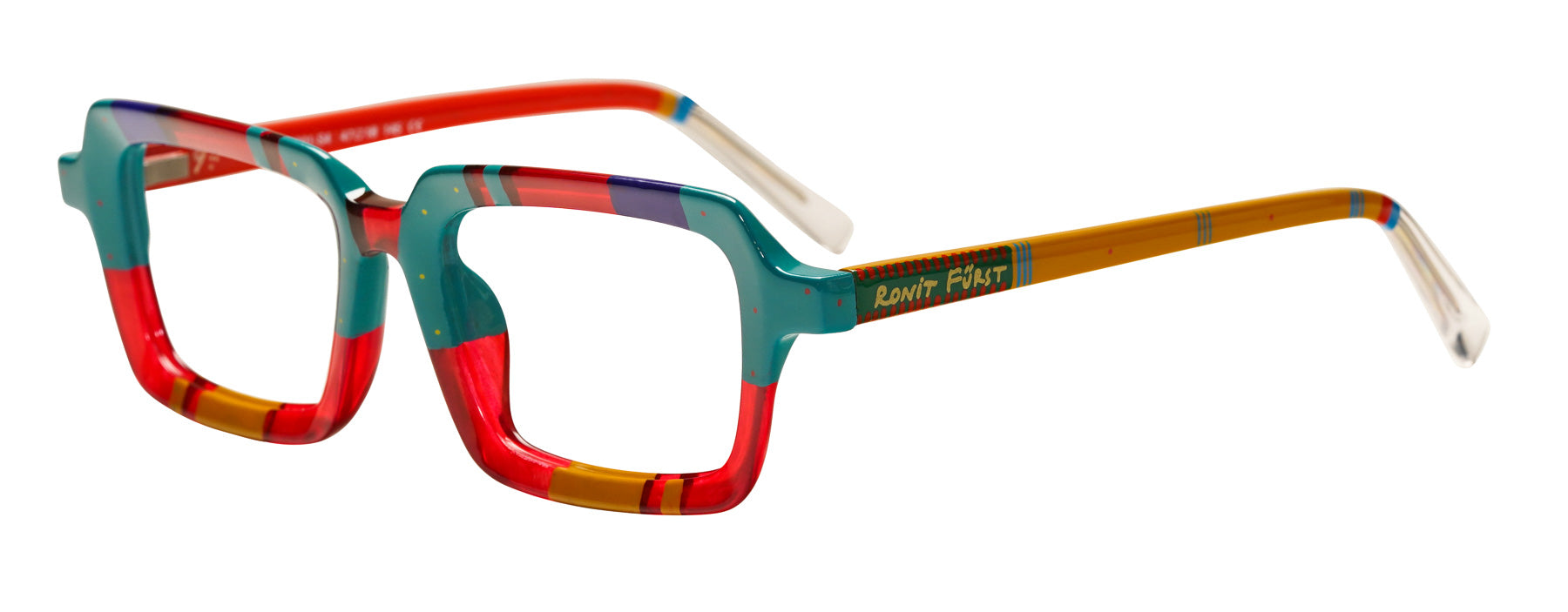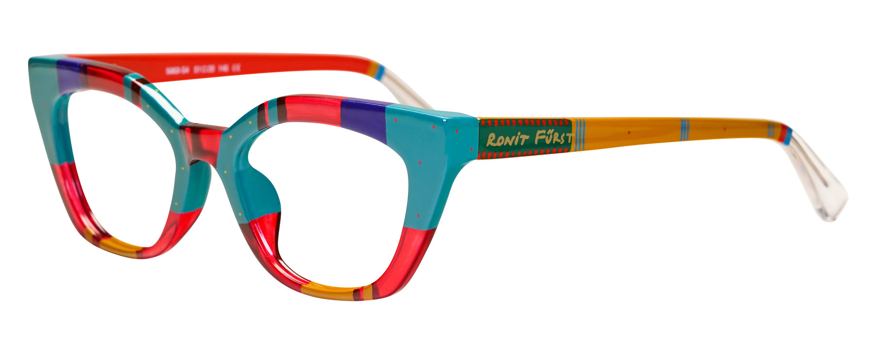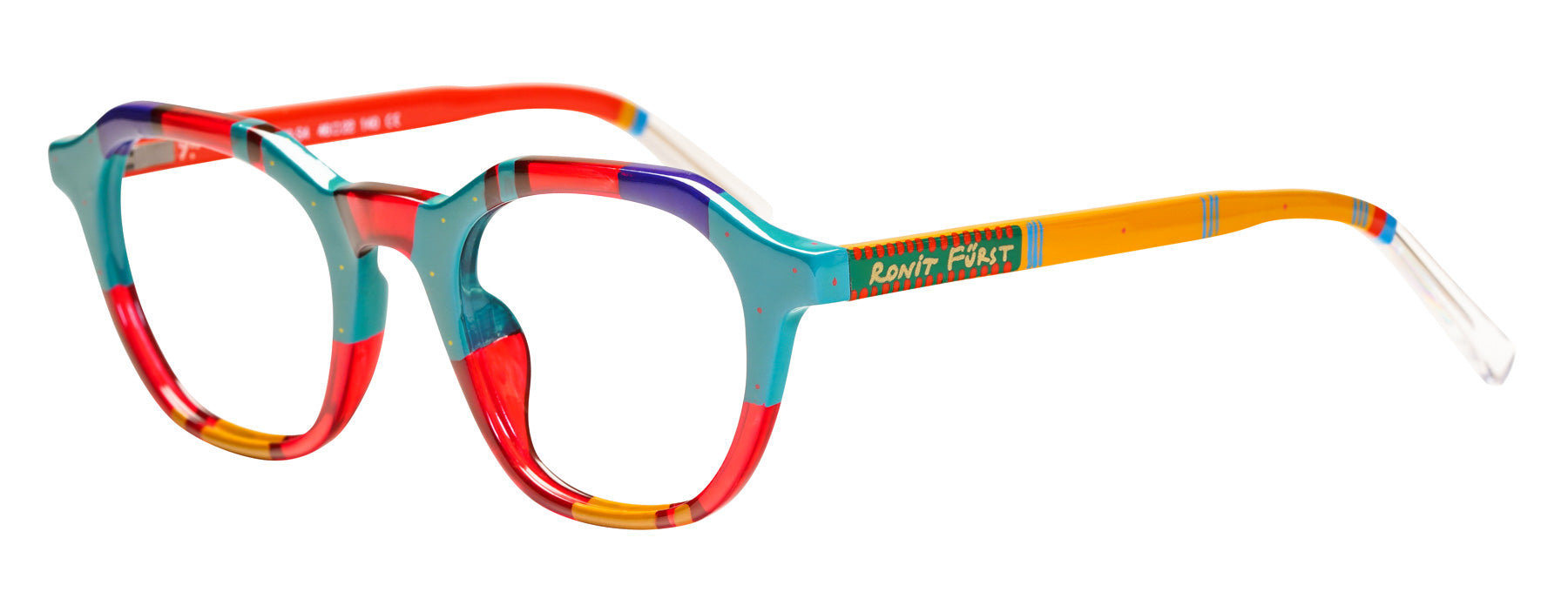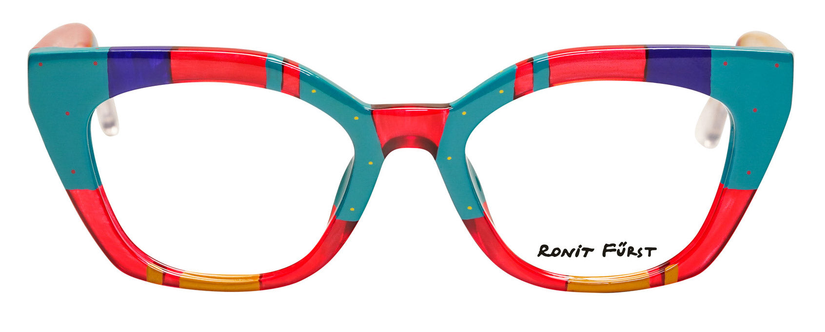 Multicolor Transparent and Opaque front with Opaque micro dot detailing. Temples in Opaque Red and Ochre with Opaque Turquoise stripe detailing.