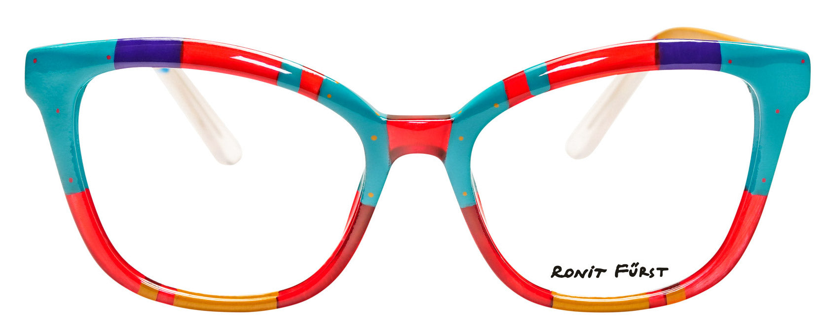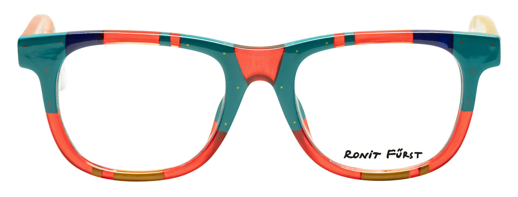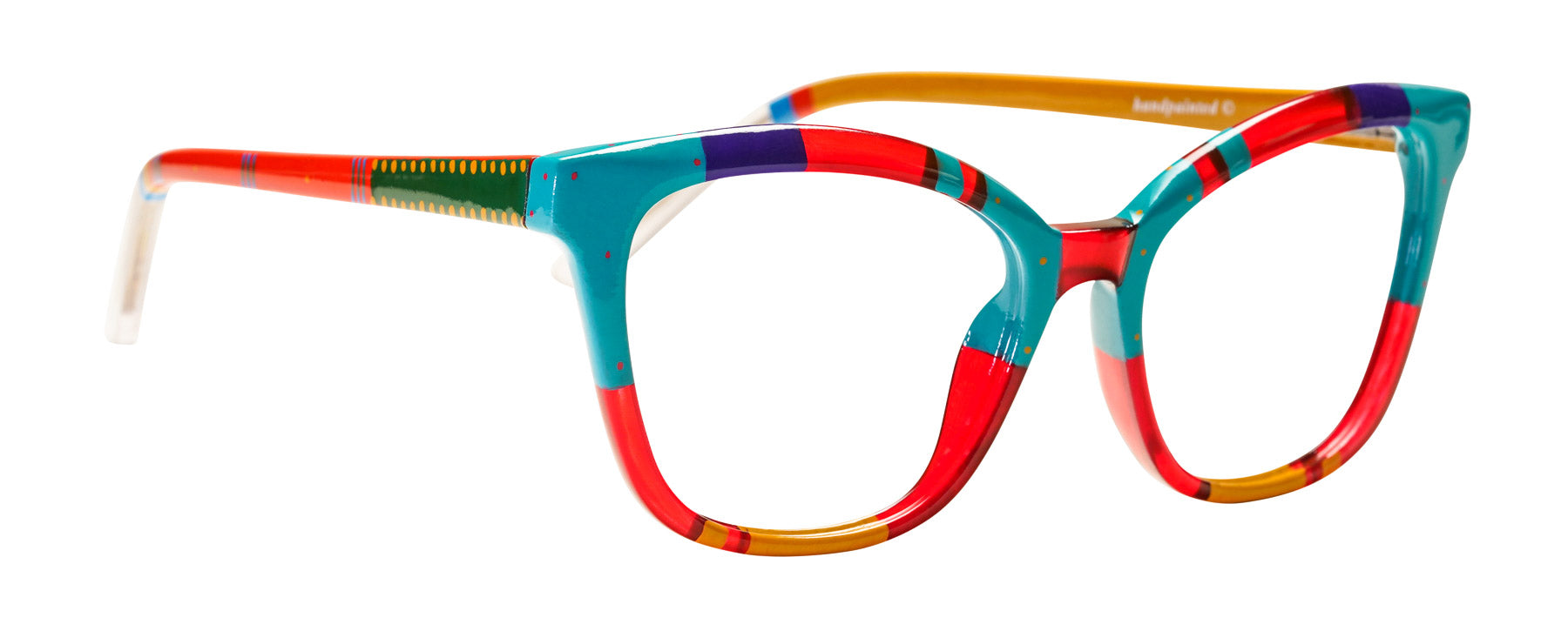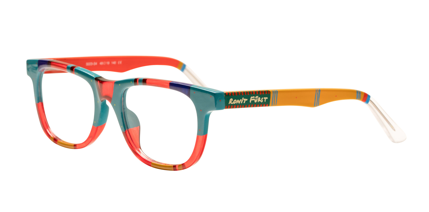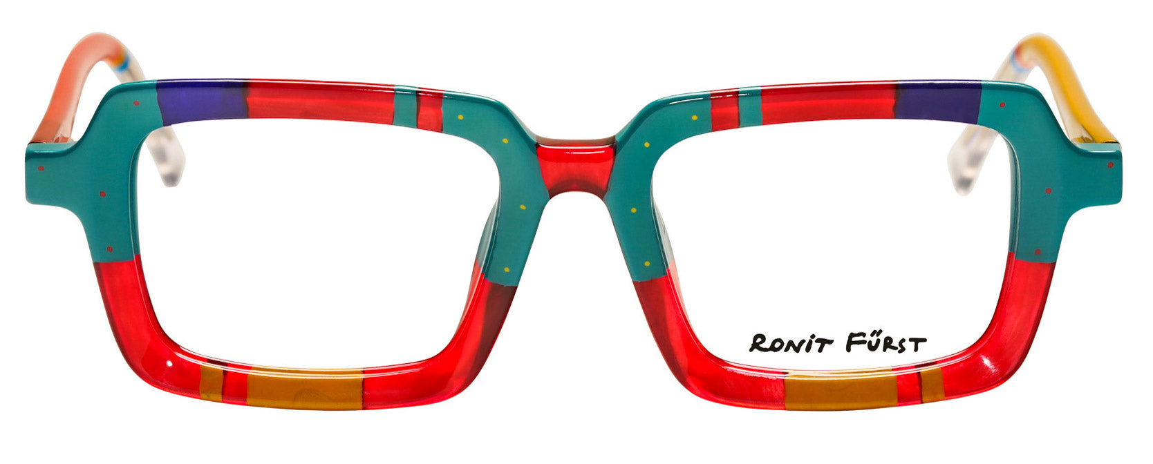 Multicolor Transparent and Opaque front with Opaque micro dot detailing. Temples in Opaque Red and Ochre with Opaque Turquoise stripe detailing.