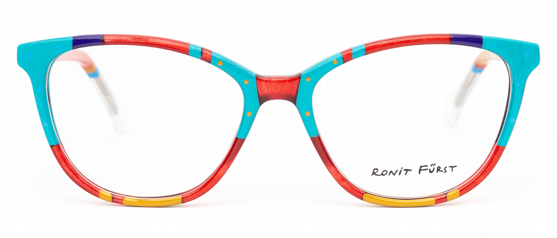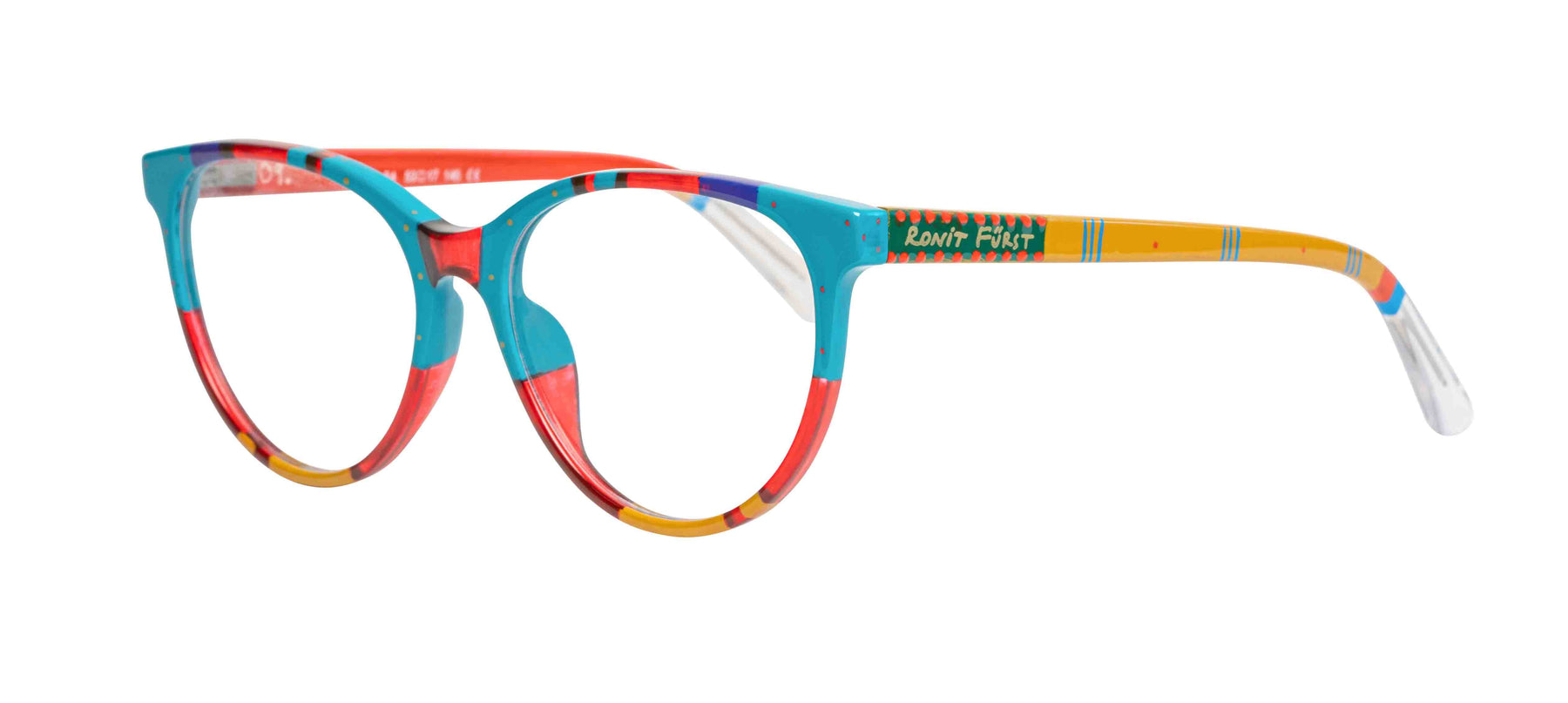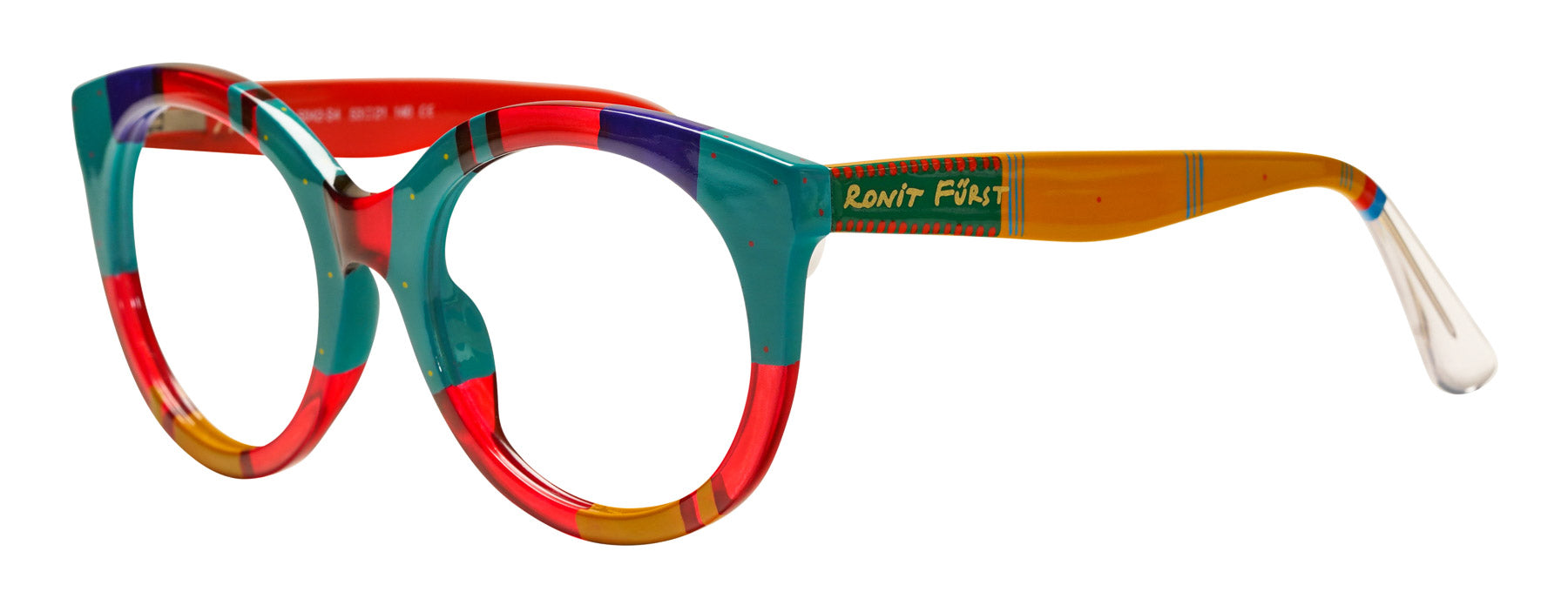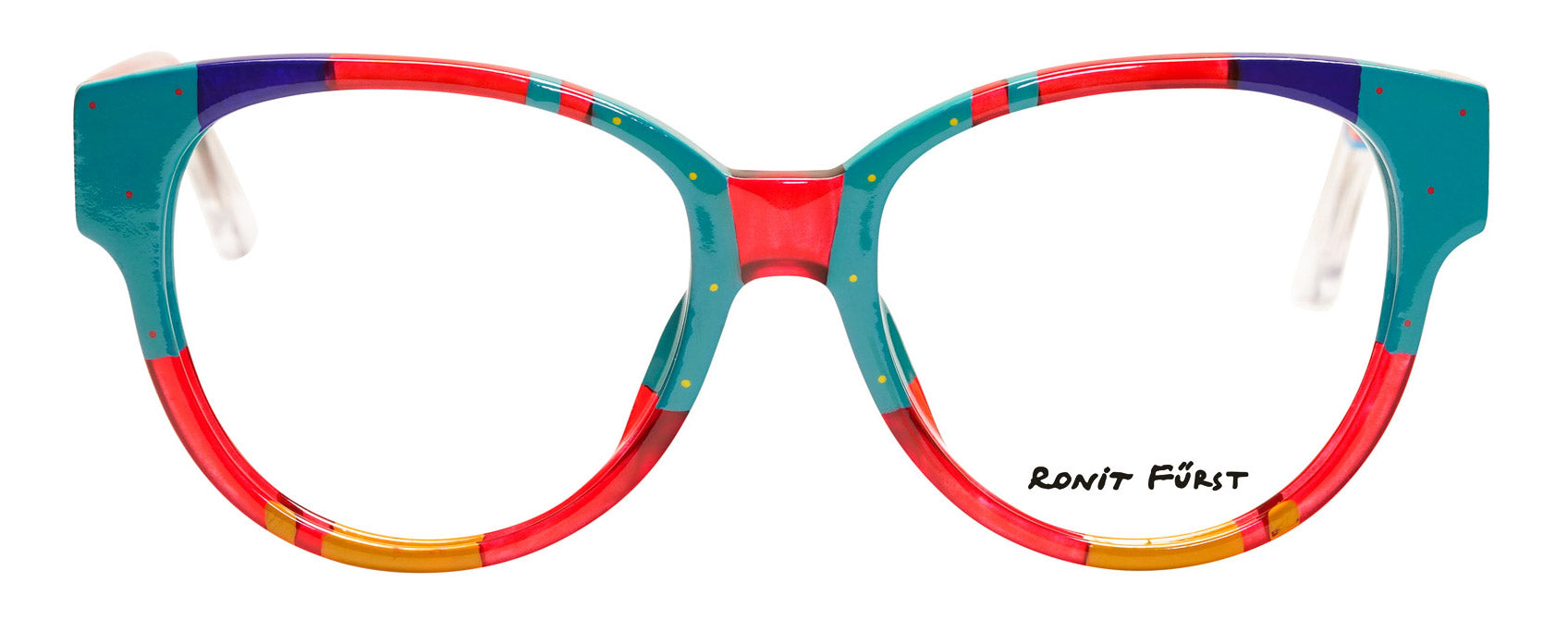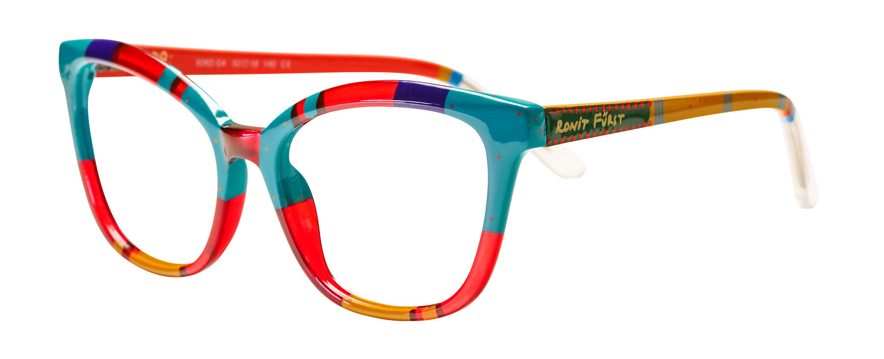 Multicolor Transparent and Opaque front with Opaque micro dot detailing. Temples in Opaque Red and Ochre with Opaque Turquoise stripe detailing.
