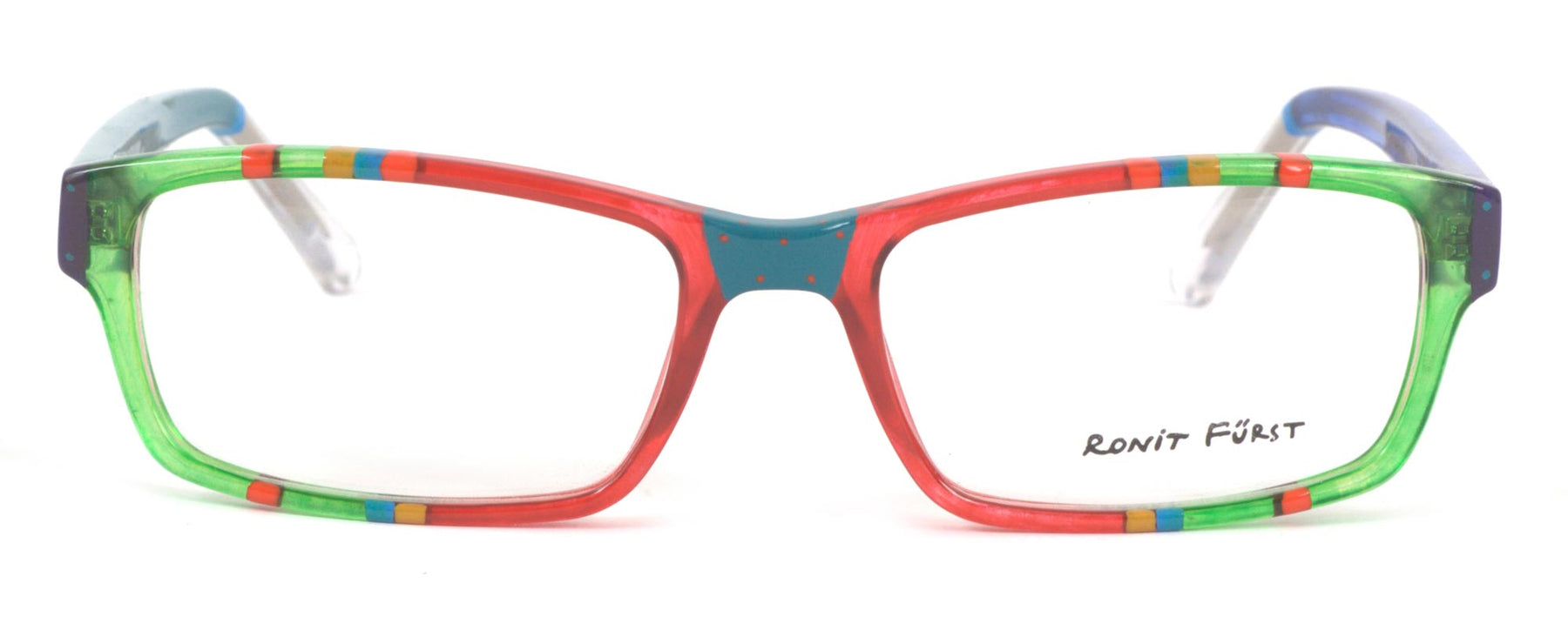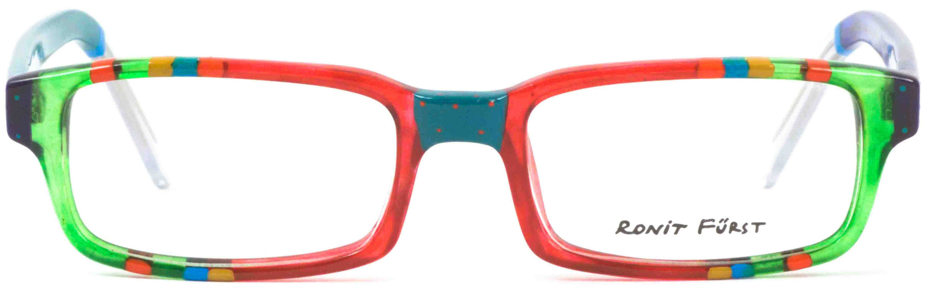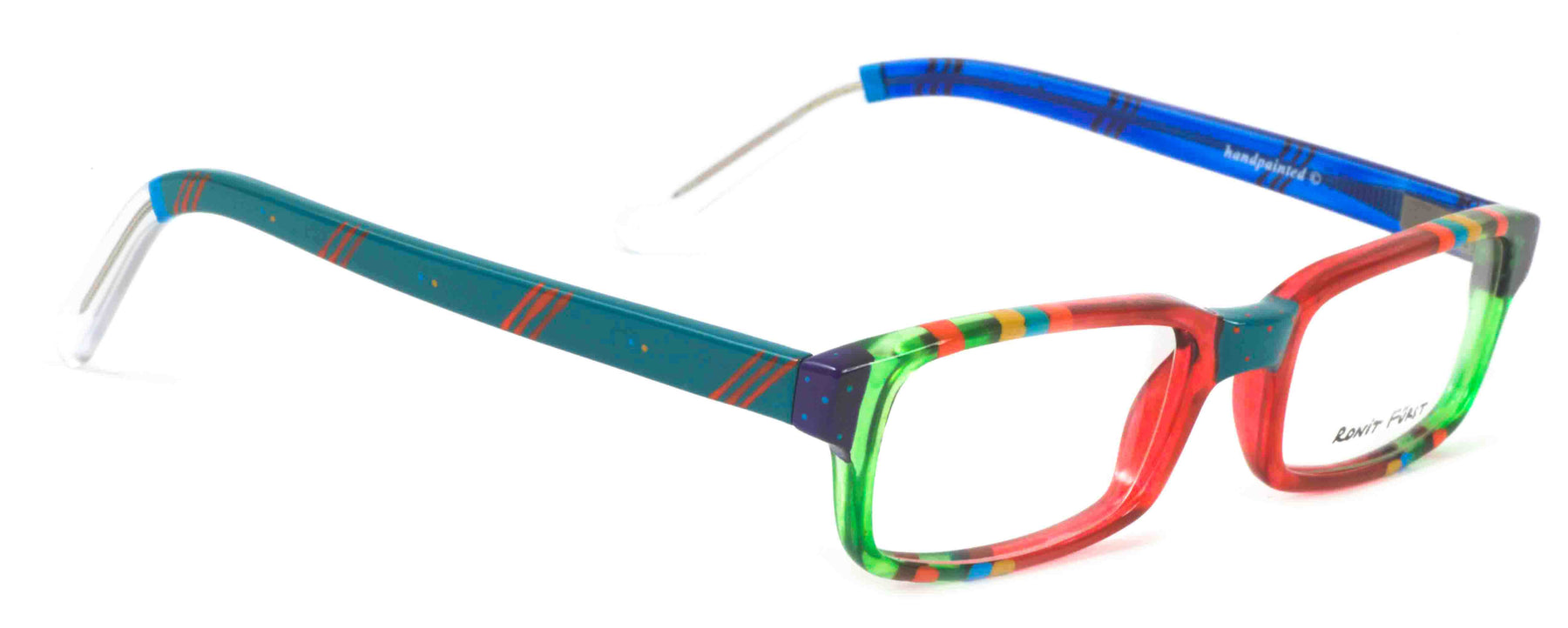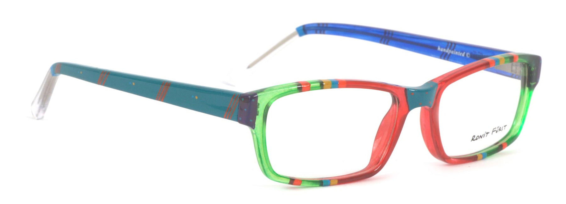 Multicolor Transparent Red, Green and Teal front with fine Opaque banding accentuated with Opaque edges. Temples in Opaque teal and Transparent blue with micro stripes.