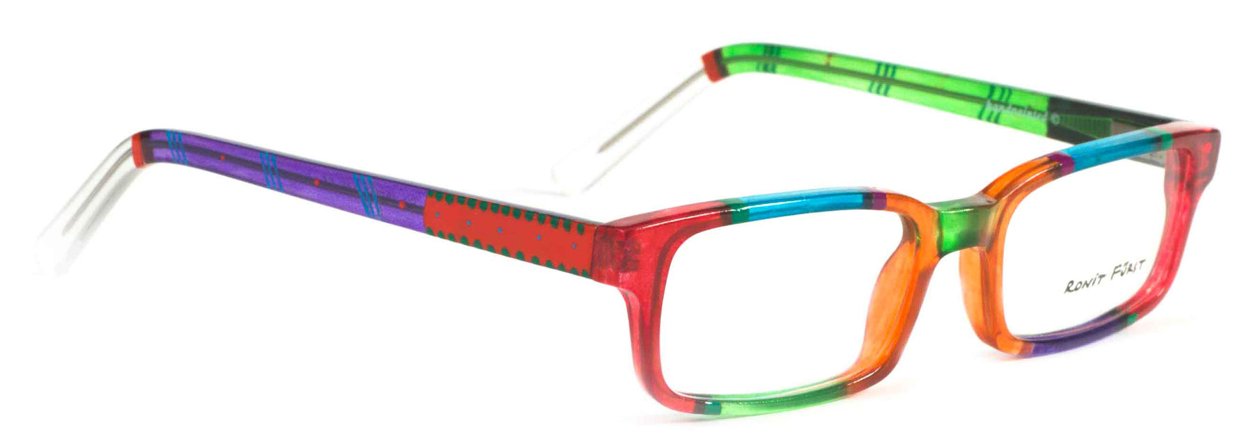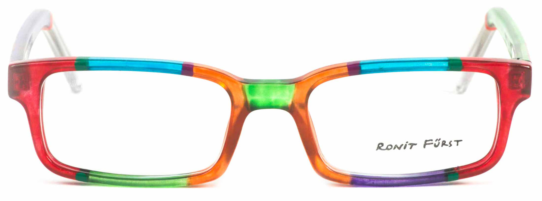 Multicolor Transparent Red, Orange and Turquoise front with Opaque banding. Temples in Transparent Purple and Green with Opaque stripes and micro detailing.