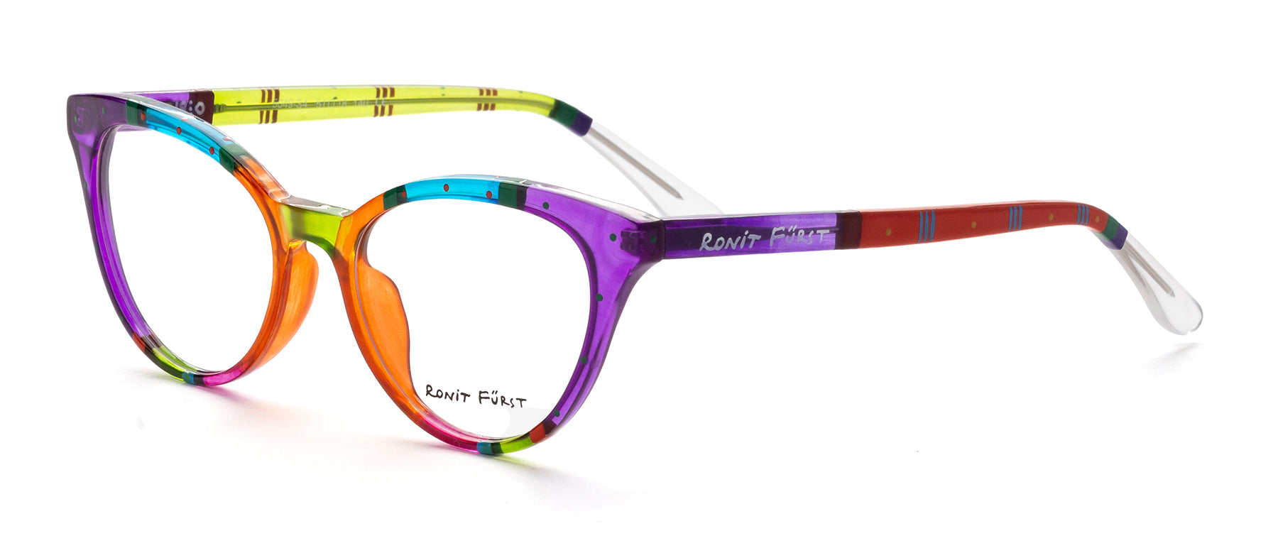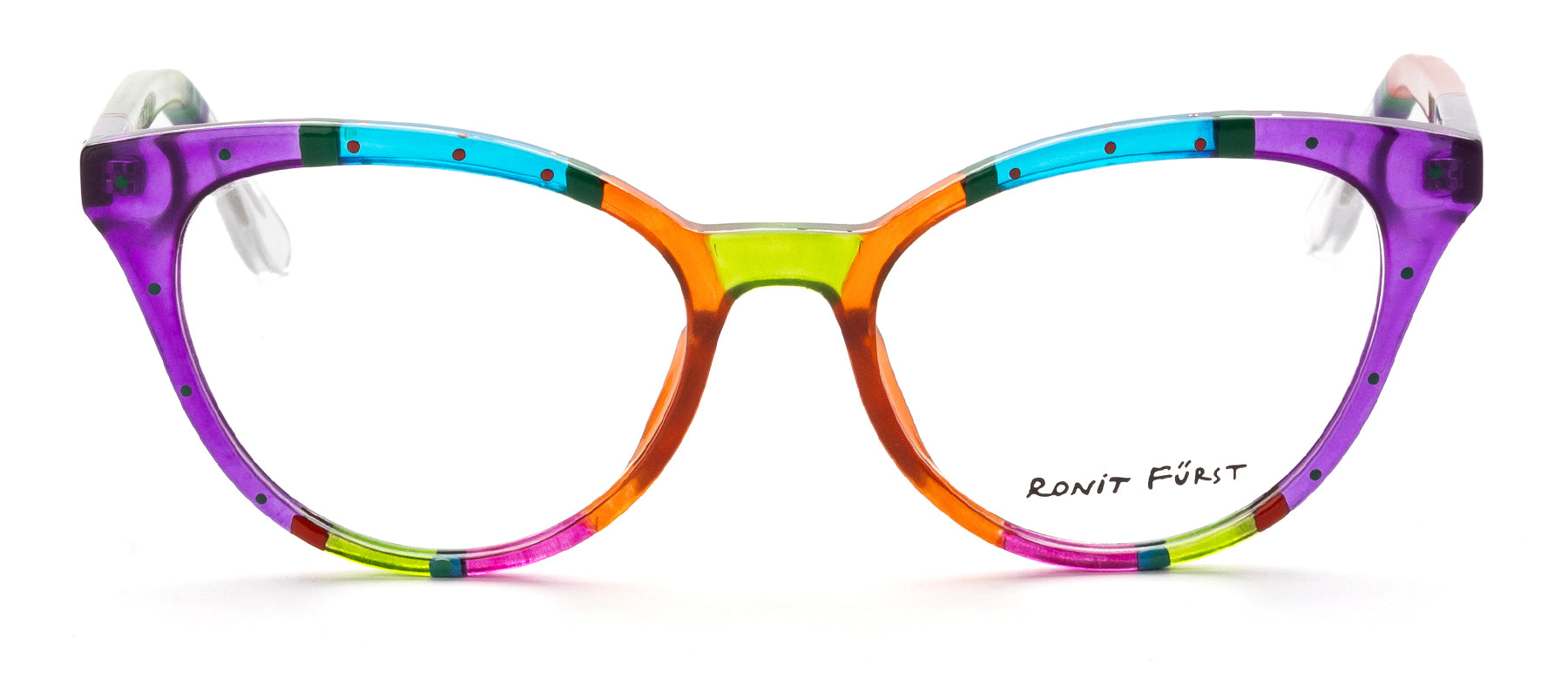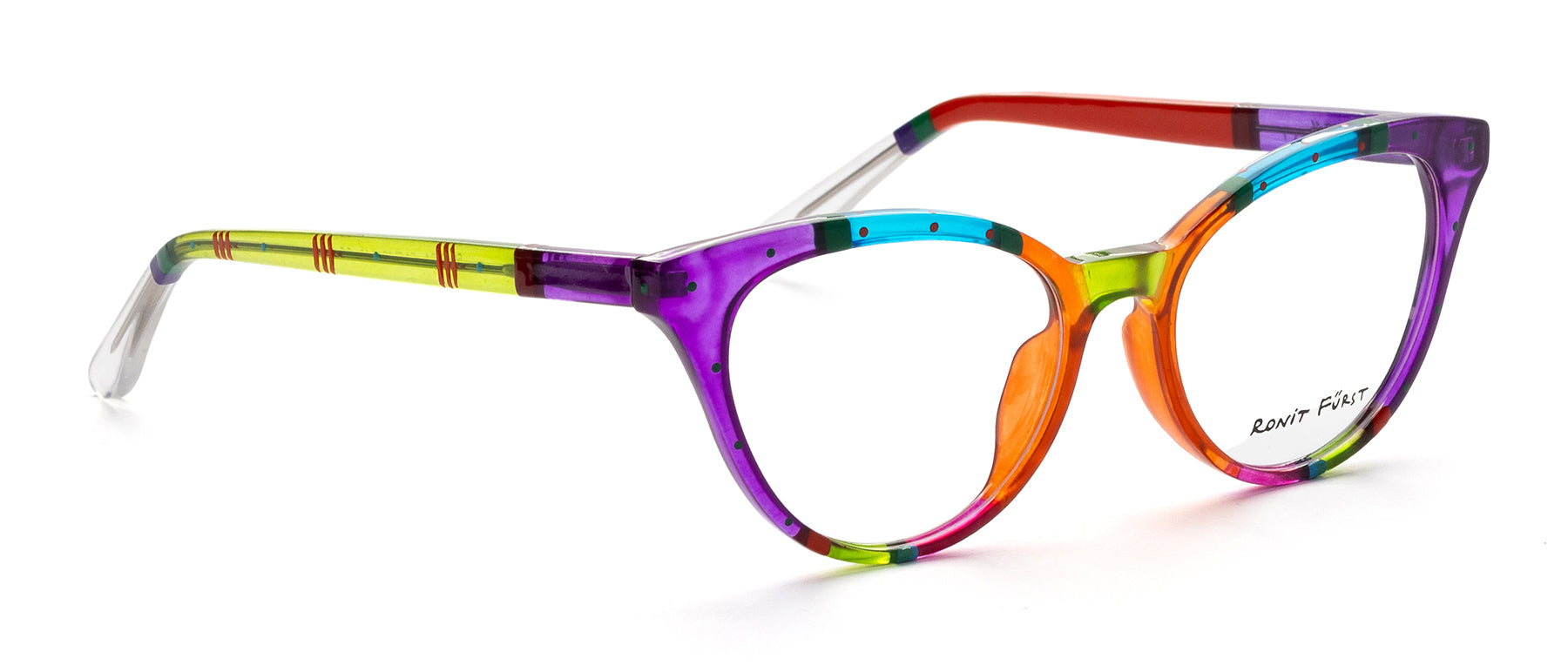 Multicolor Transparent Purple, Orange and Turquoise front with Opaque banding and micro dot detailing. Temples in Transparent Green and Opaque Red with Opaque stripes and micro detailing.