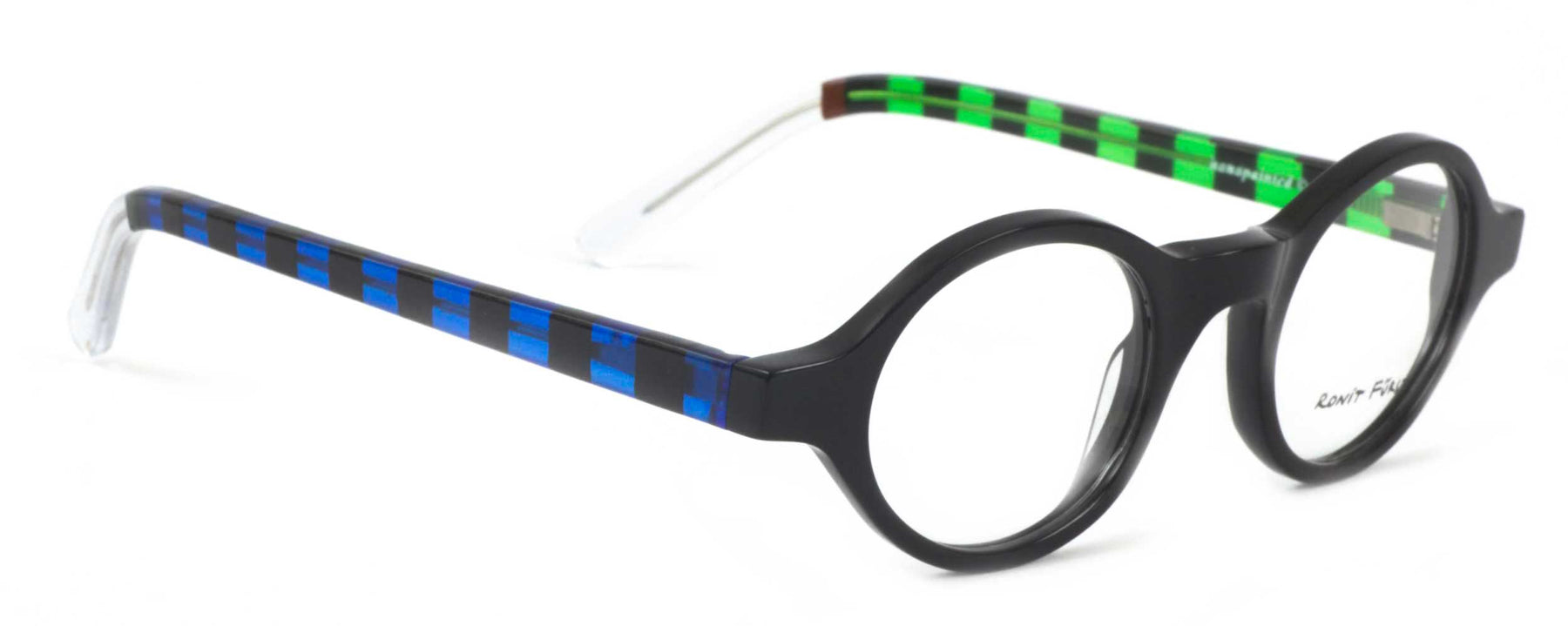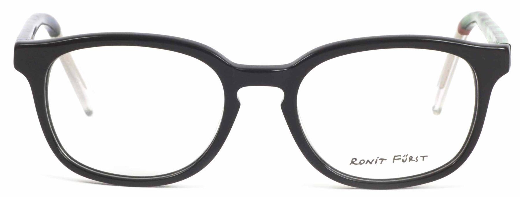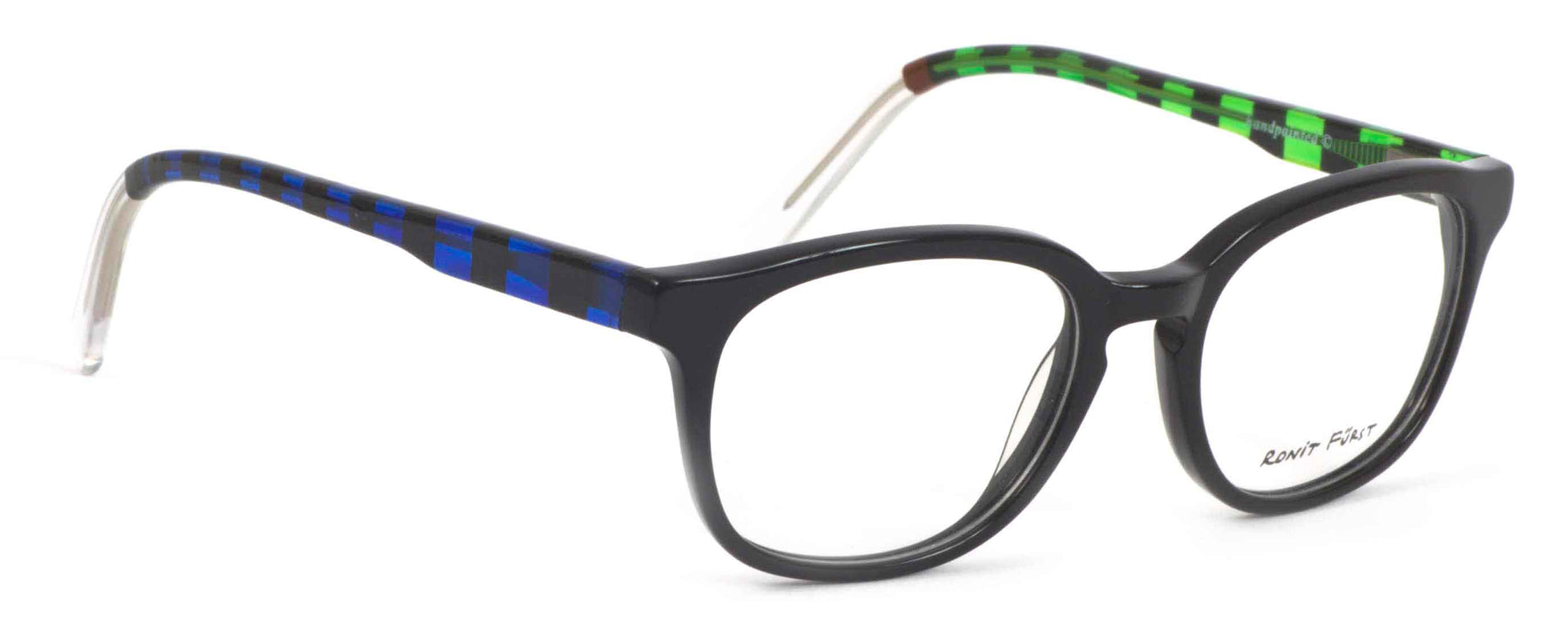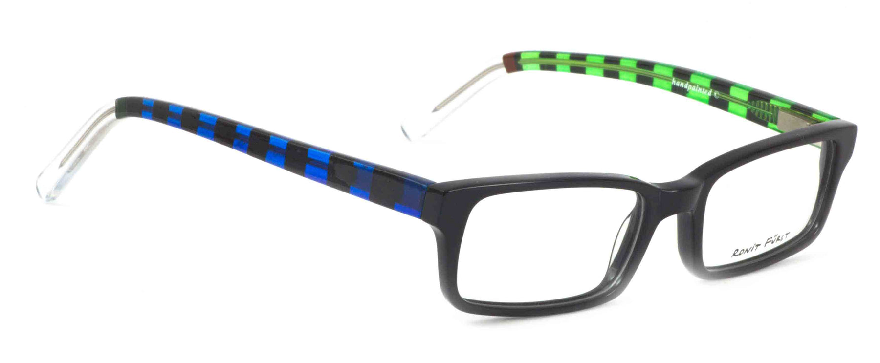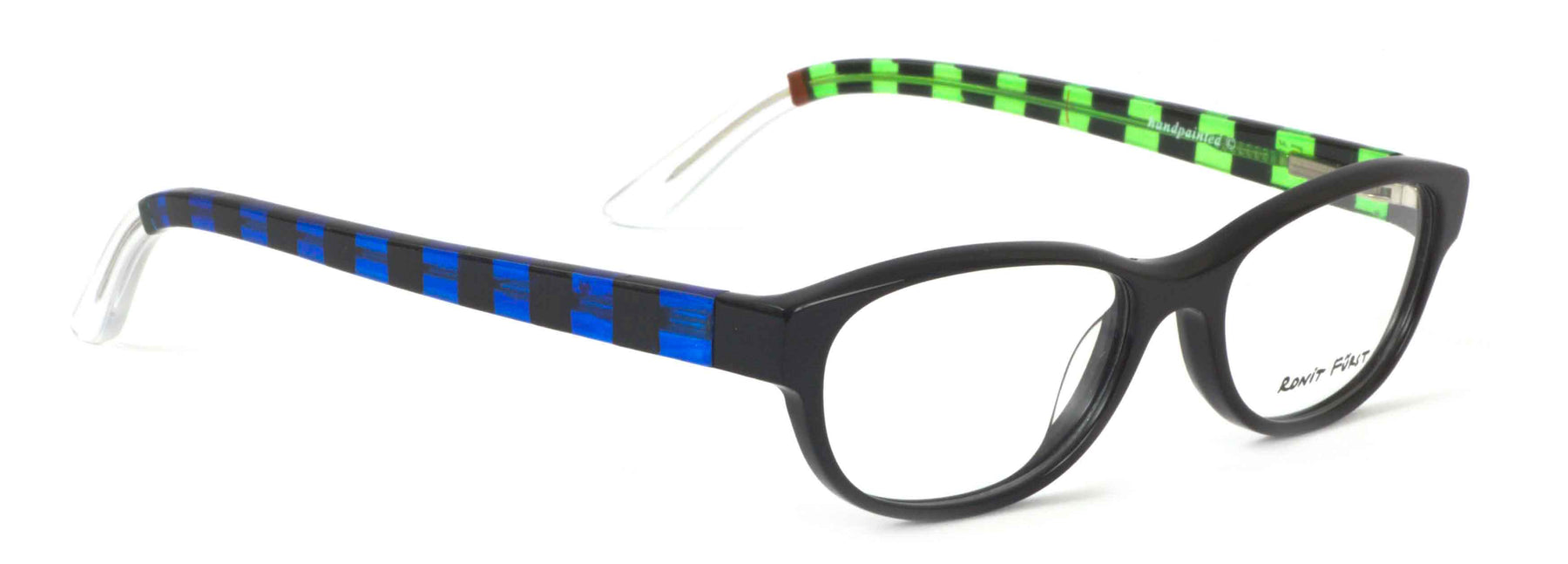 Shiny Black Opaque front. Temples in signature Opaque/Transparent Black/Olive Black/Blue stripes.