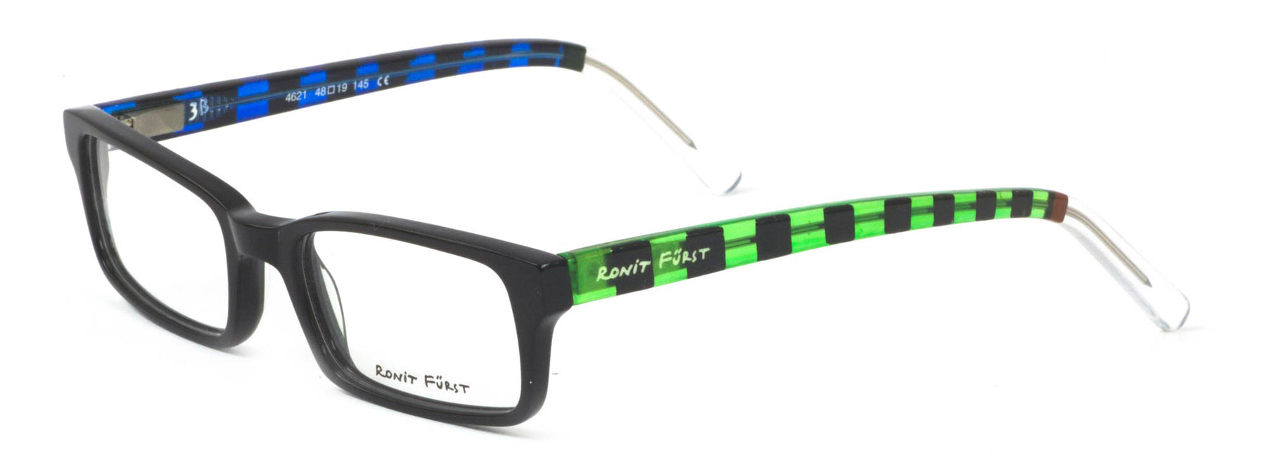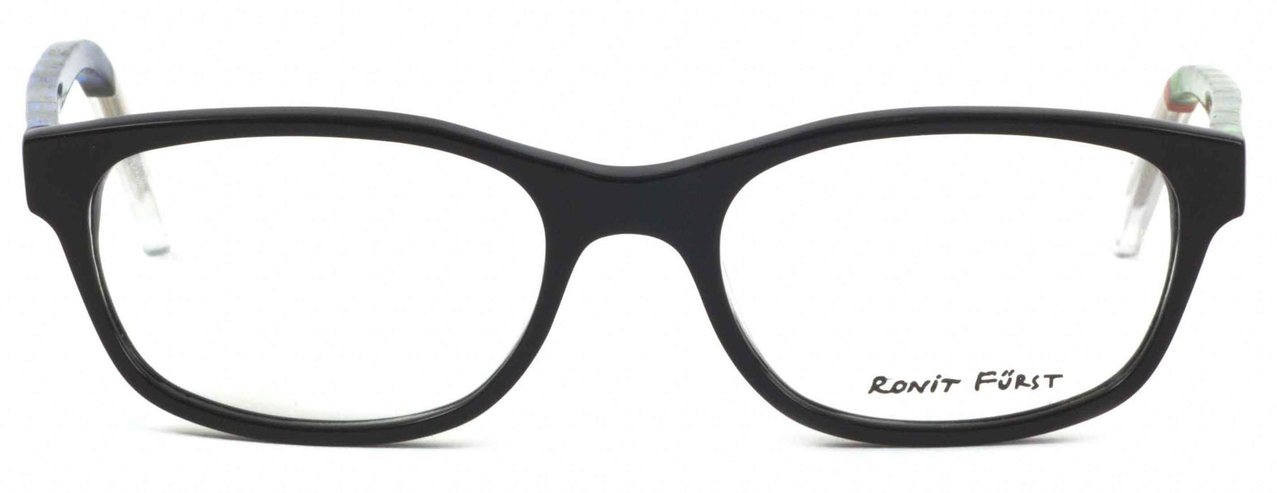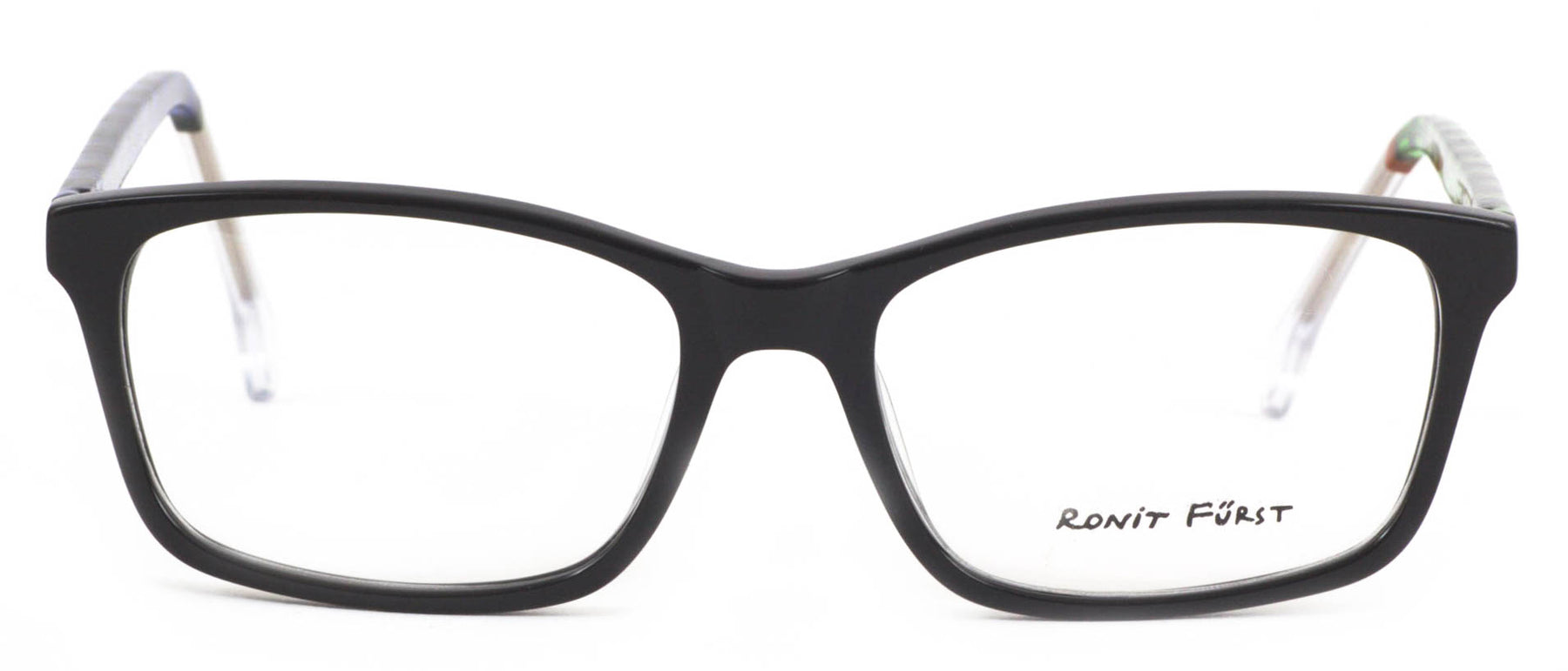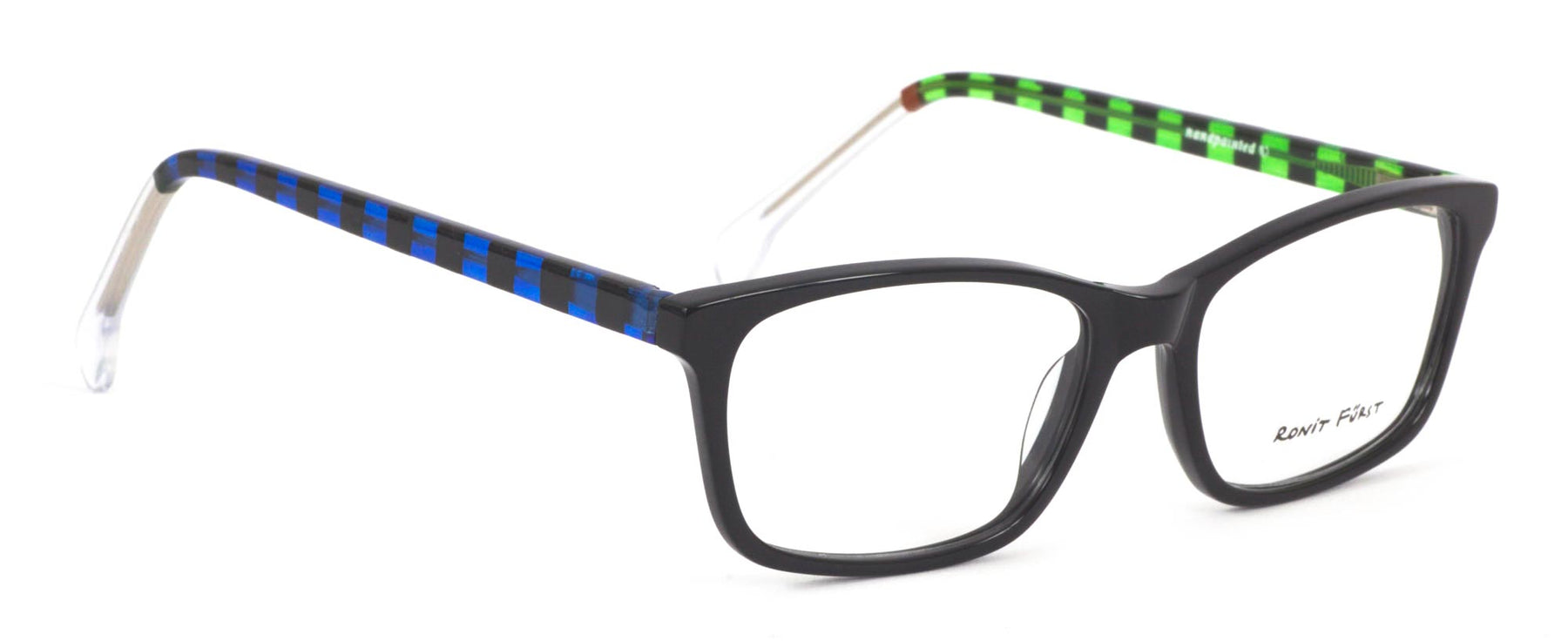 Shiny Black Opaque front. Temples in signature Opaque/Transparent Black/Olive Black/Blue stripes.