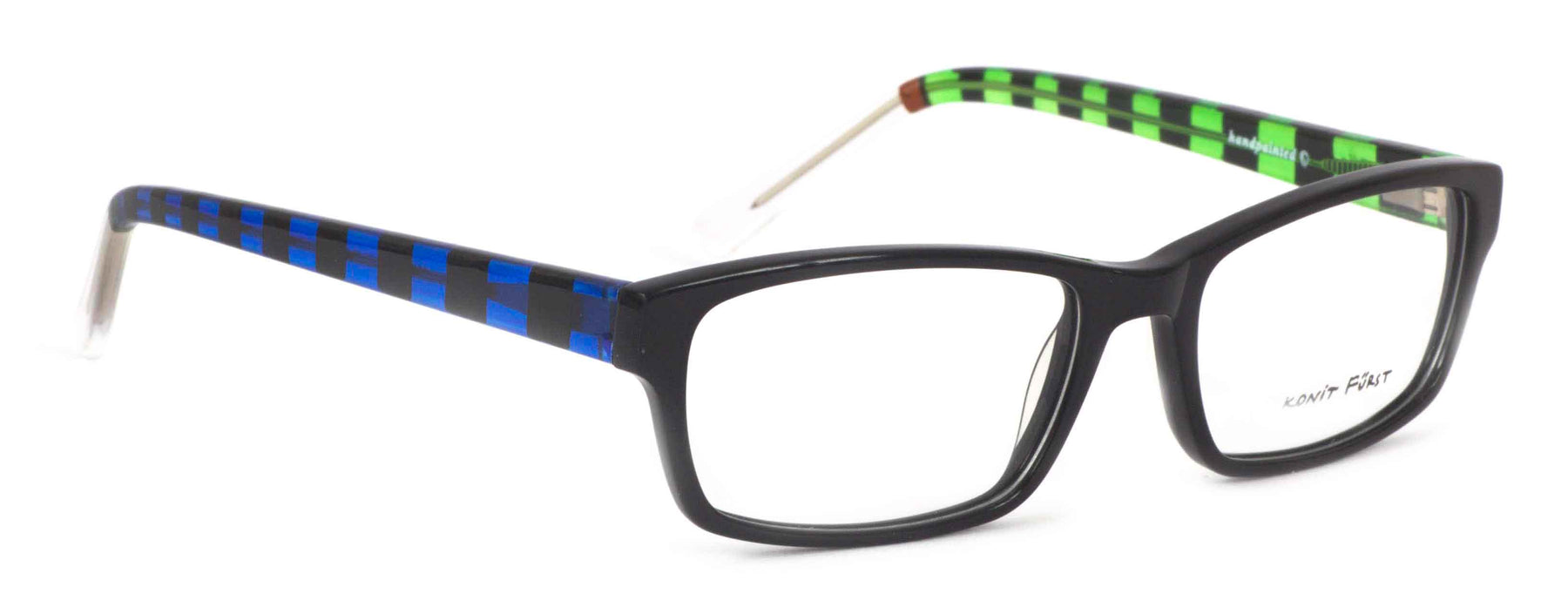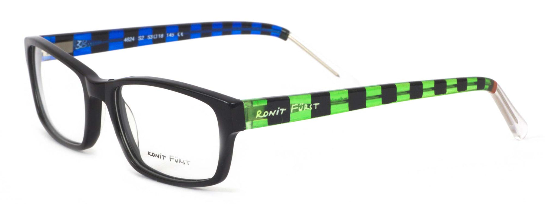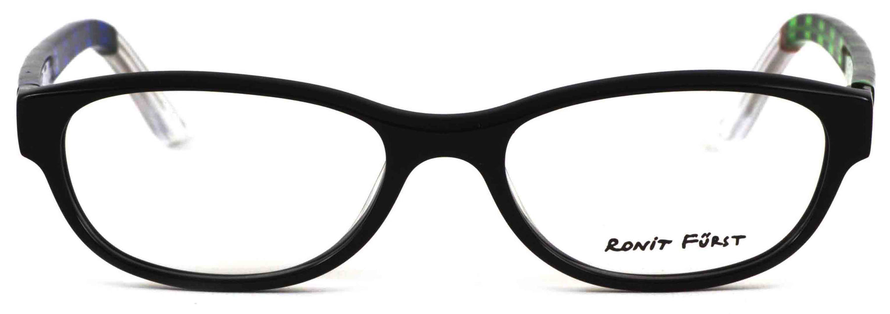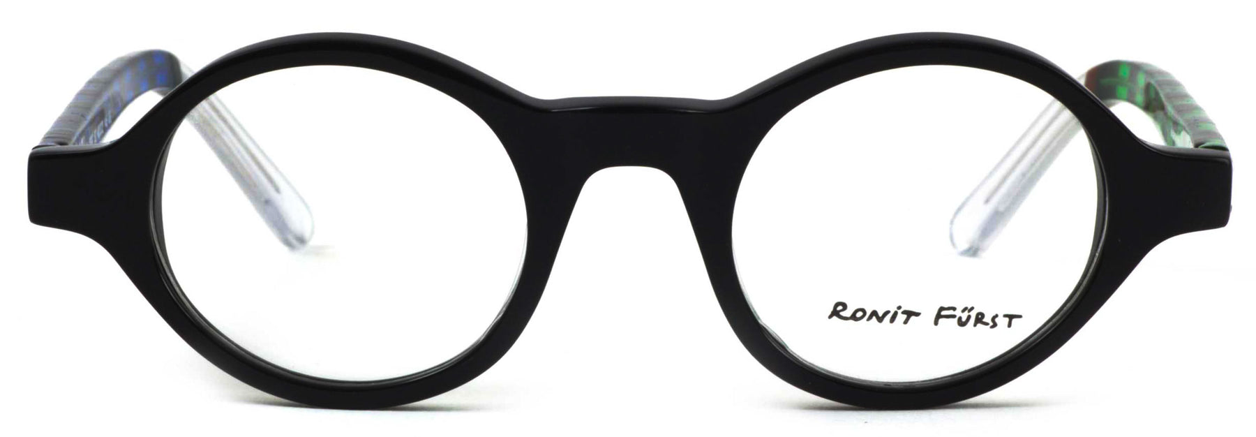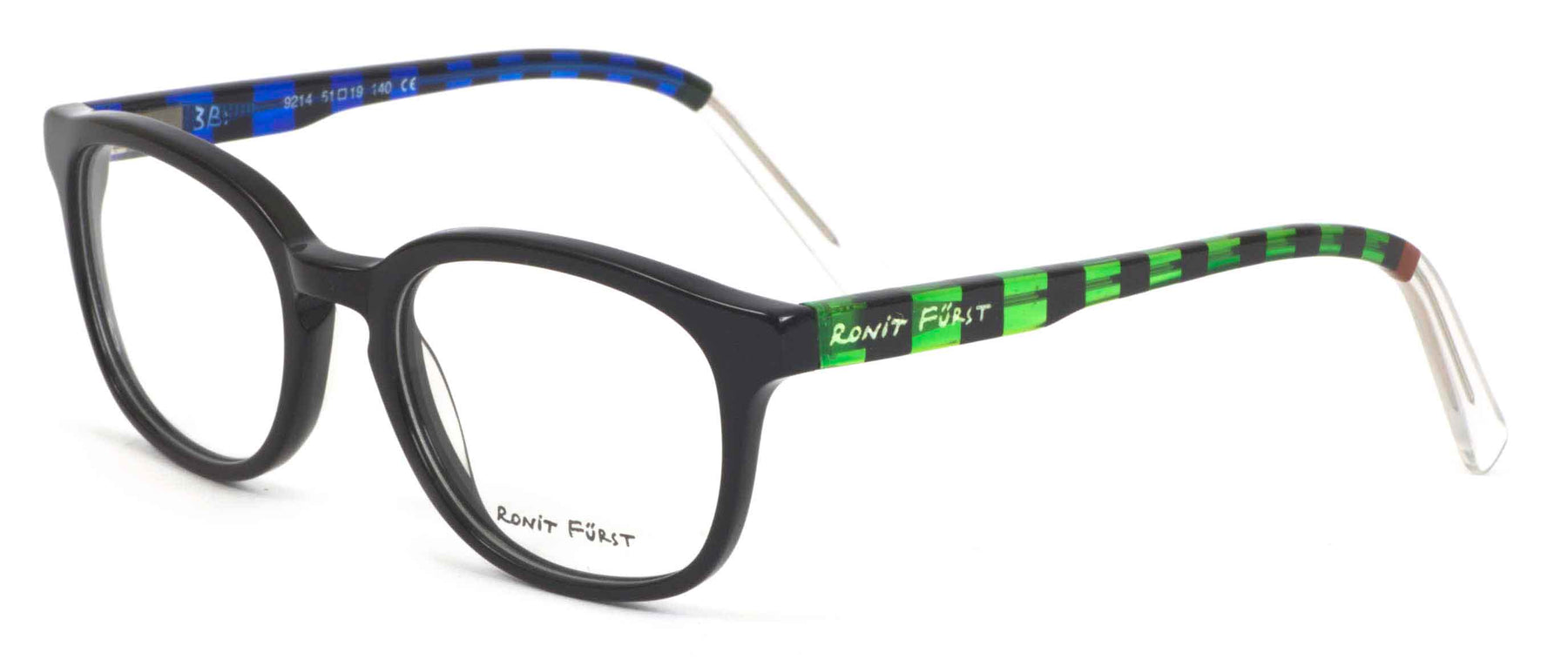 Shiny Black Opaque front. Temples in signature Opaque/Transparent Black/Olive Black/Blue stripes.