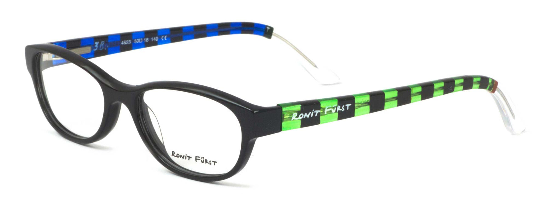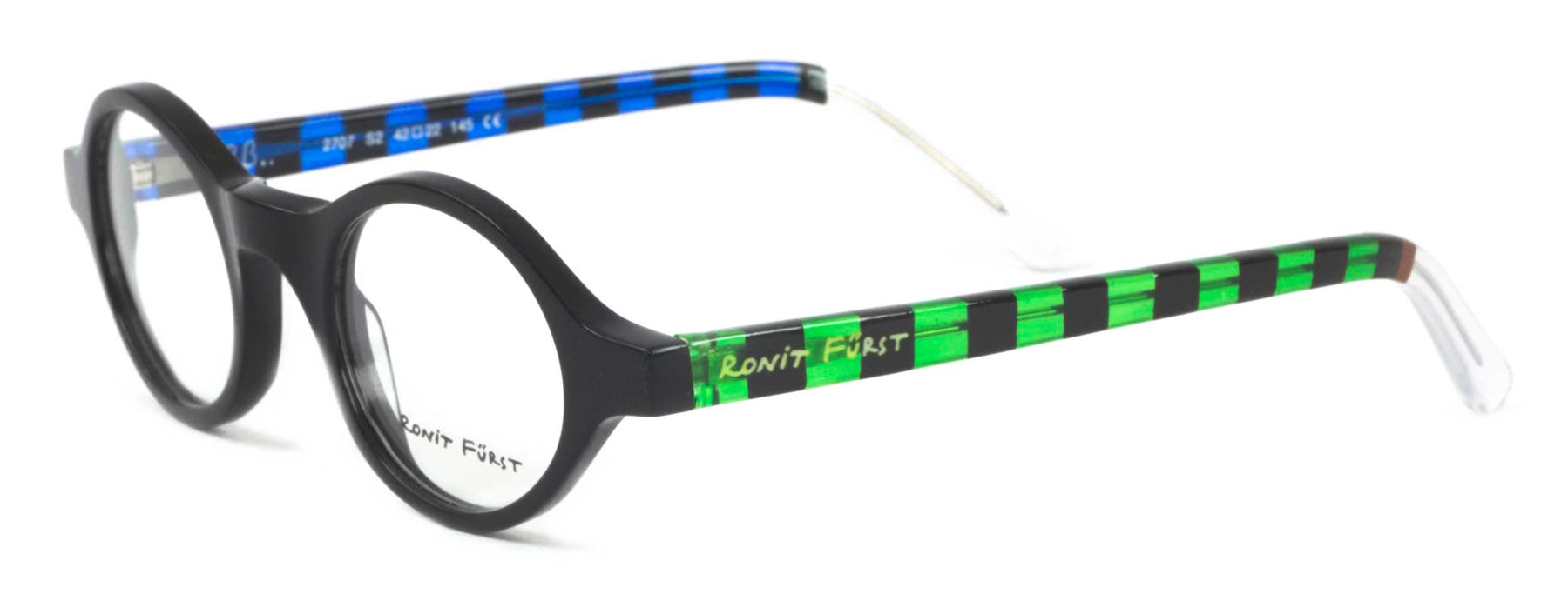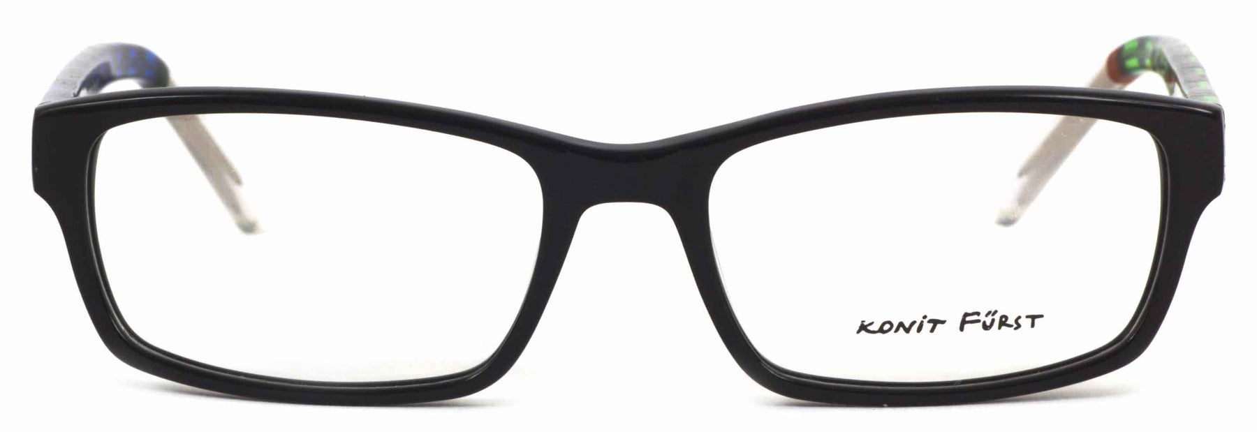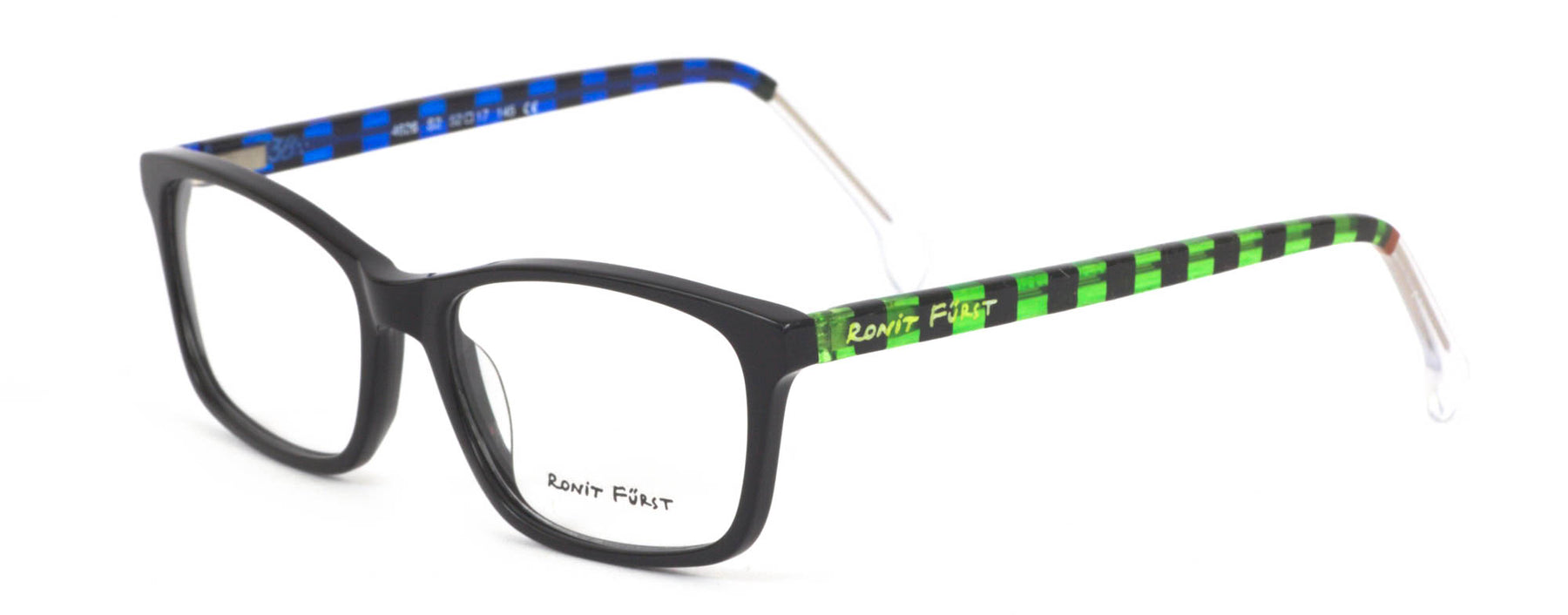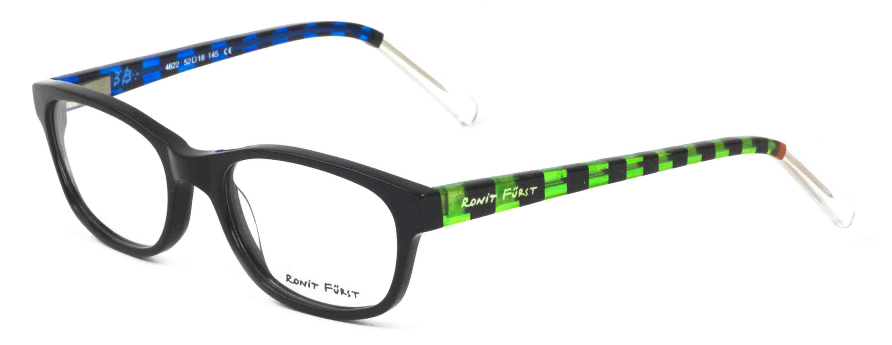 Shiny Black Opaque front. Temples in signature Opaque/Transparent Black/Olive Black/Blue stripes.