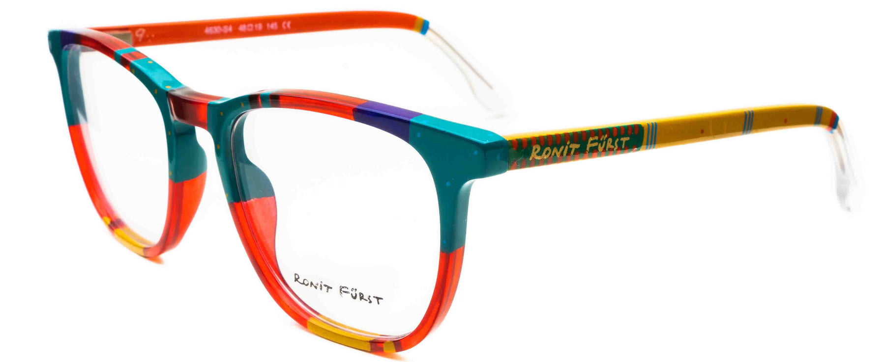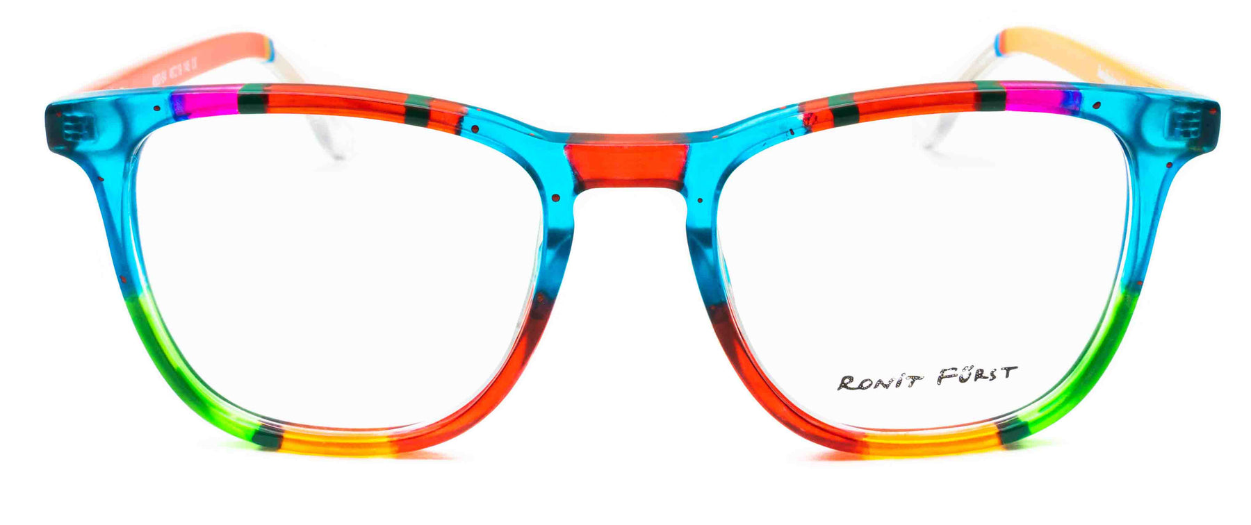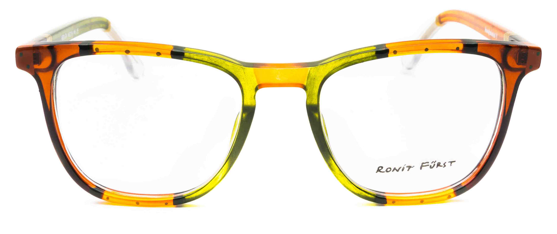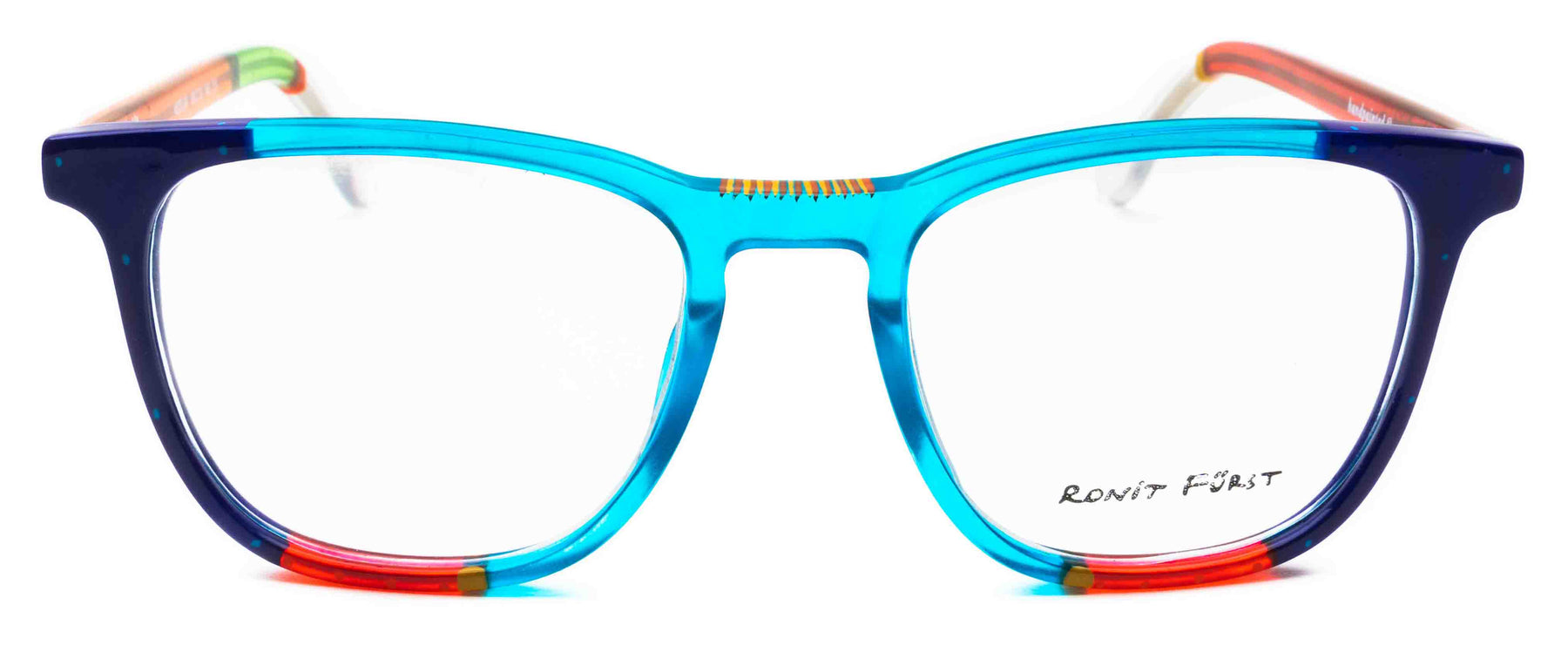 Traditional frame with unconventional designs; The square frame presents bold rimmed upper edges and a rounded angle on the bottom. The keyhole bridge element prevents direct contact with the top of the nose, thus improving the frame’s comfort.