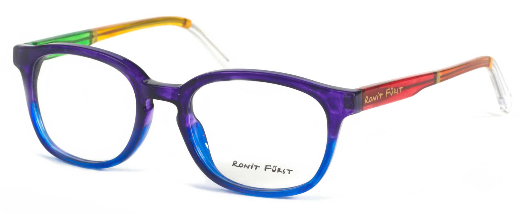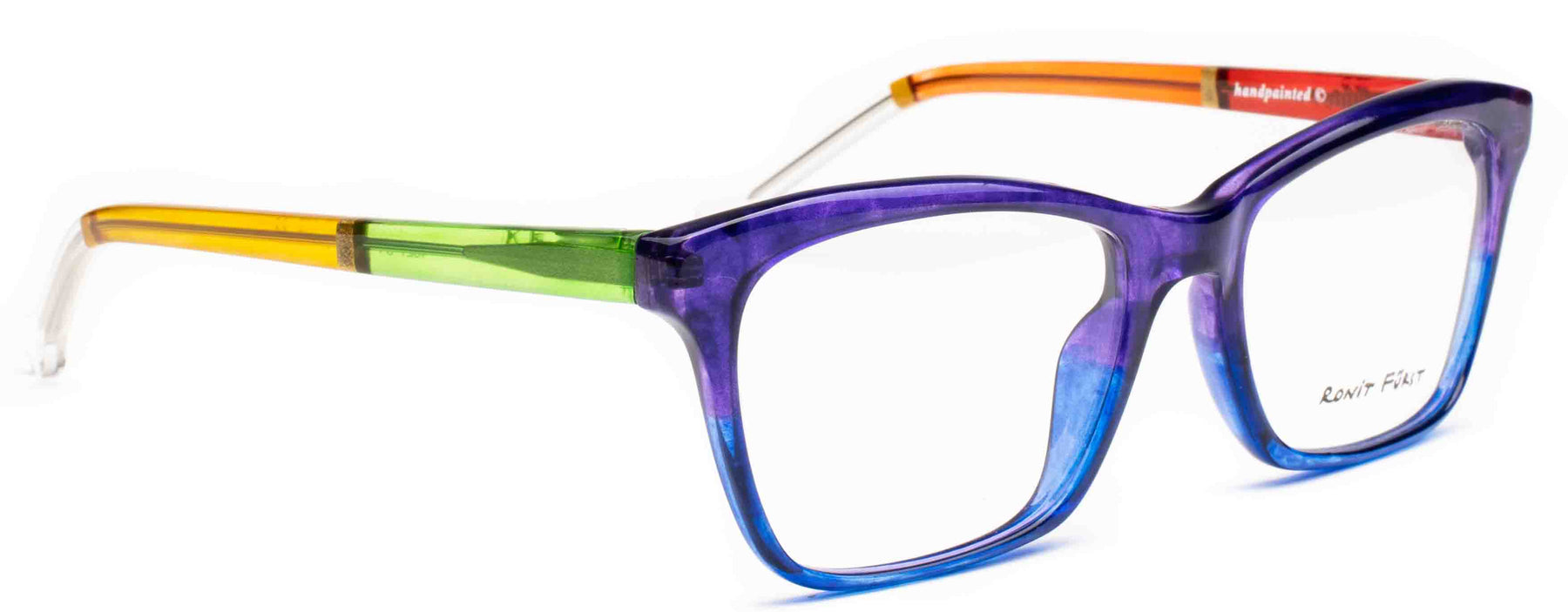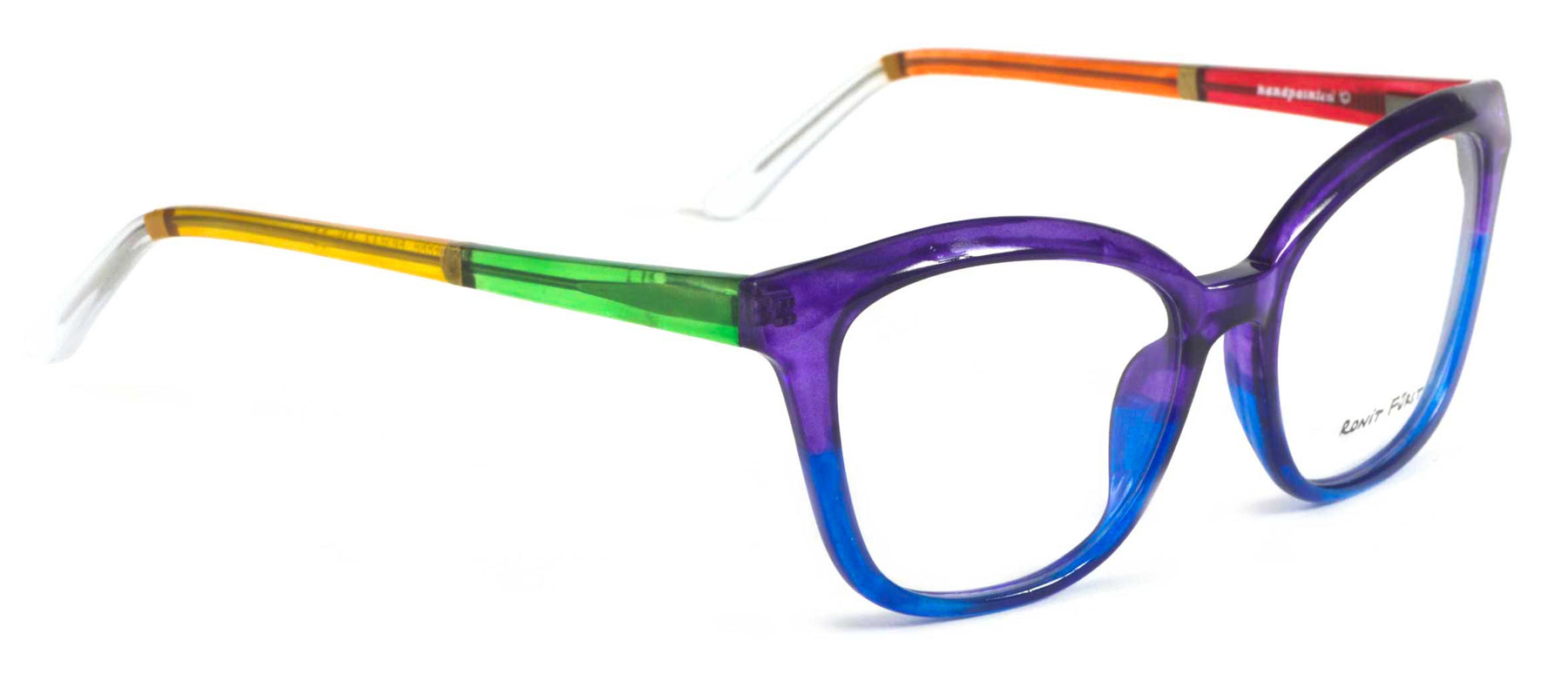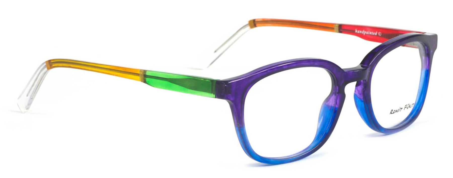 Transparent Purple and Blue front. Temples in Transparent Red/Orange and Yellow/Green with Gold stripes.