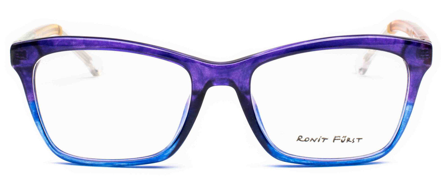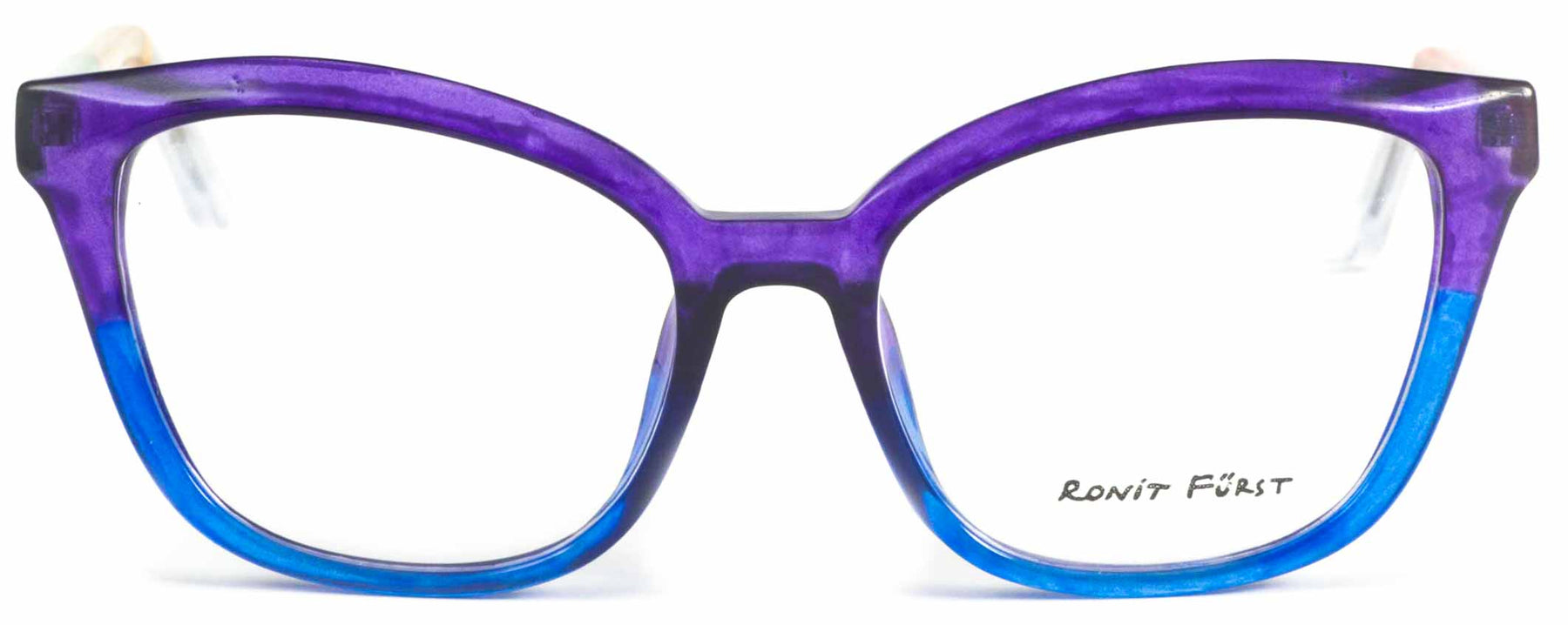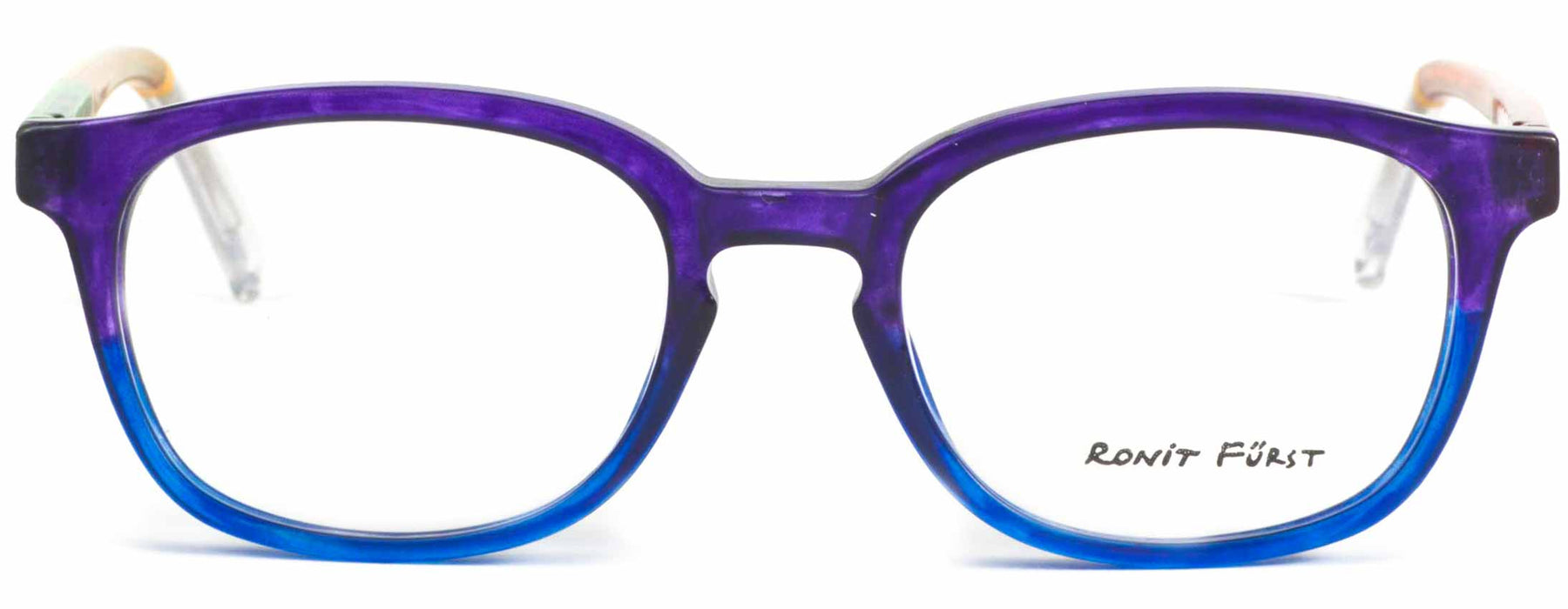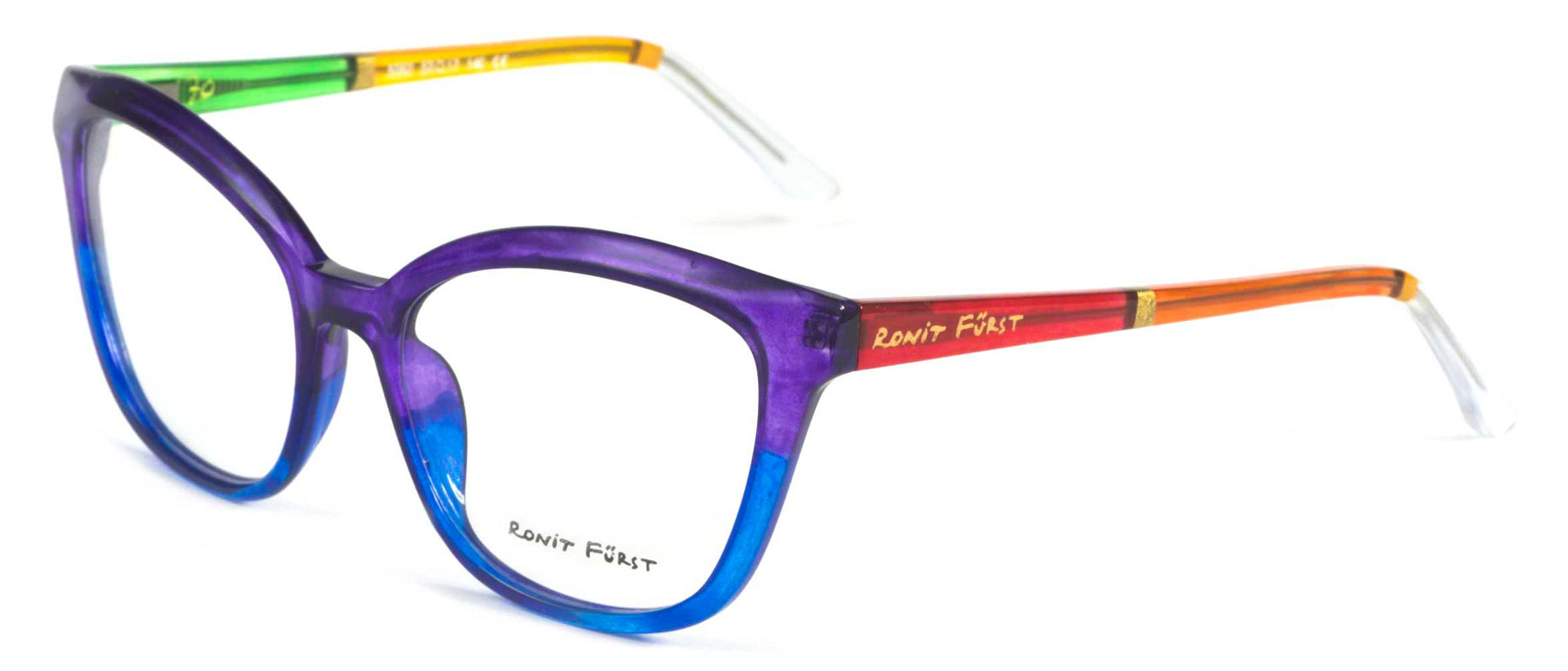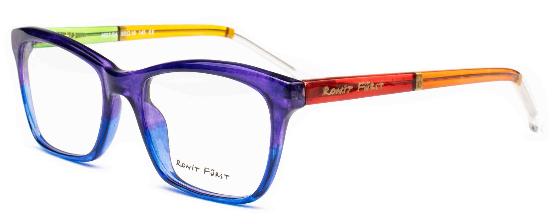 Transparent Purple and Blue front. Temples in Transparent Red/Orange and Yellow/Green with Gold stripes.