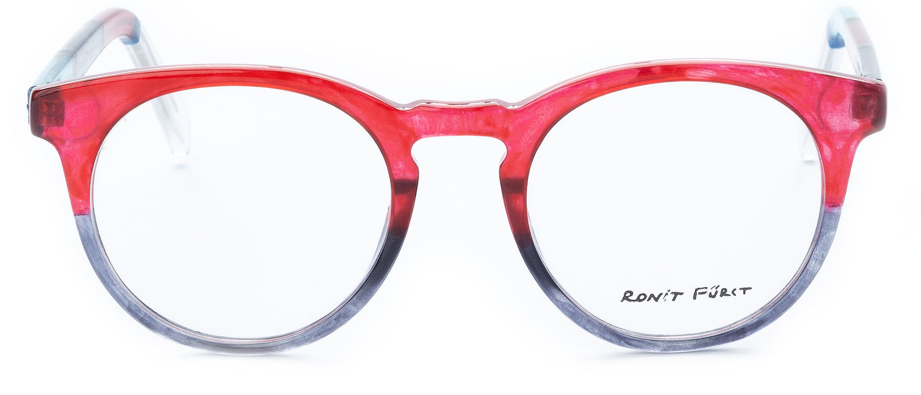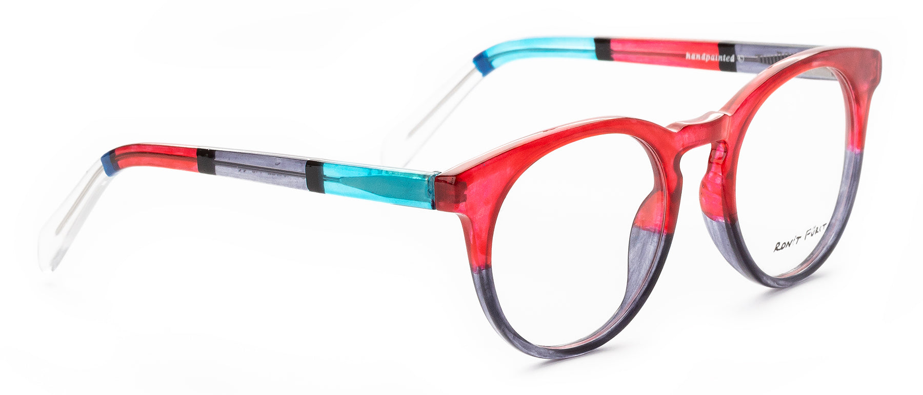 Transparent Red and Gray front with Opaque banding. Temples in Transparent Red/Turquoise/Gray with Opaque Black stripes.