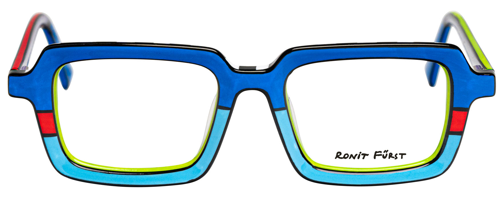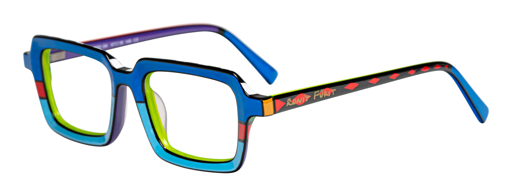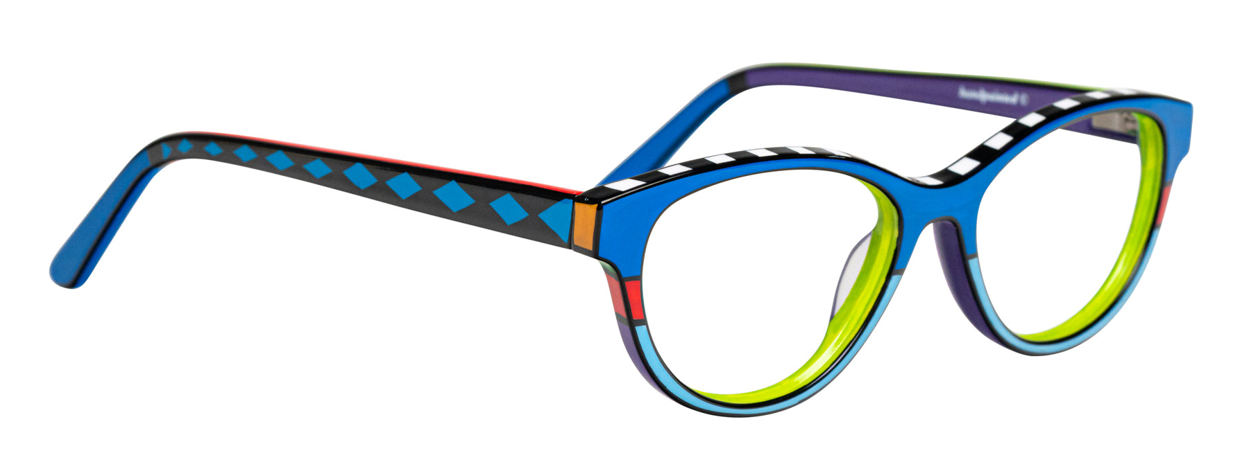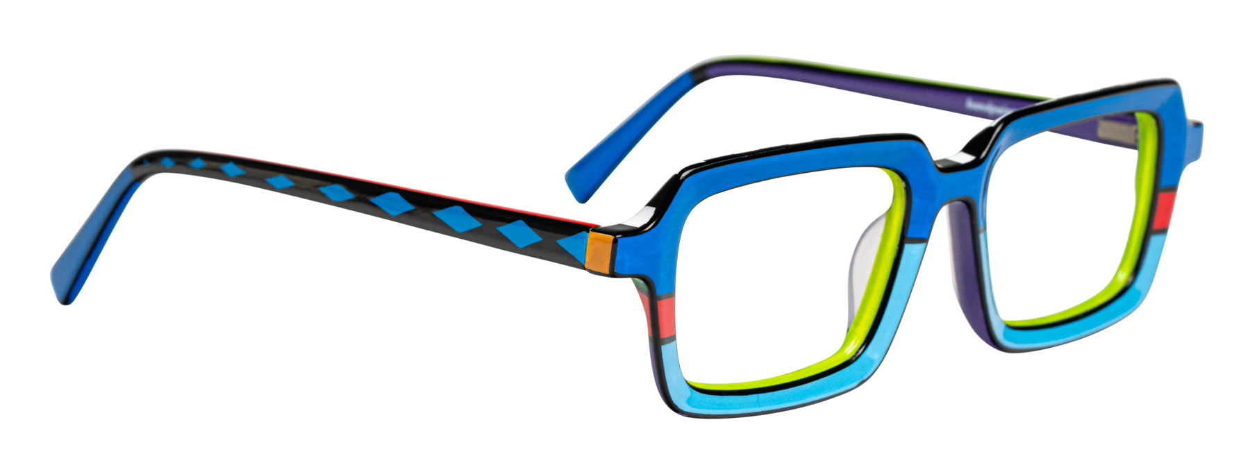 Two-tone-inspired front in Cobalt/Sky Blue/Vibrant Red, Lime Green inner angle and Black contour outline. Temples feature a striking diamond pattern in Vibrant Red/Sky Blue.
