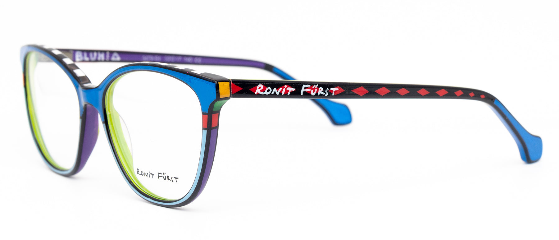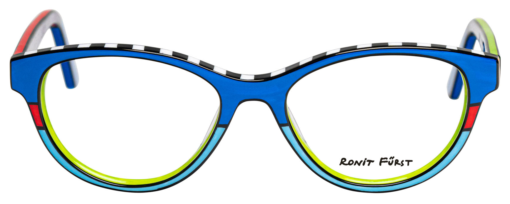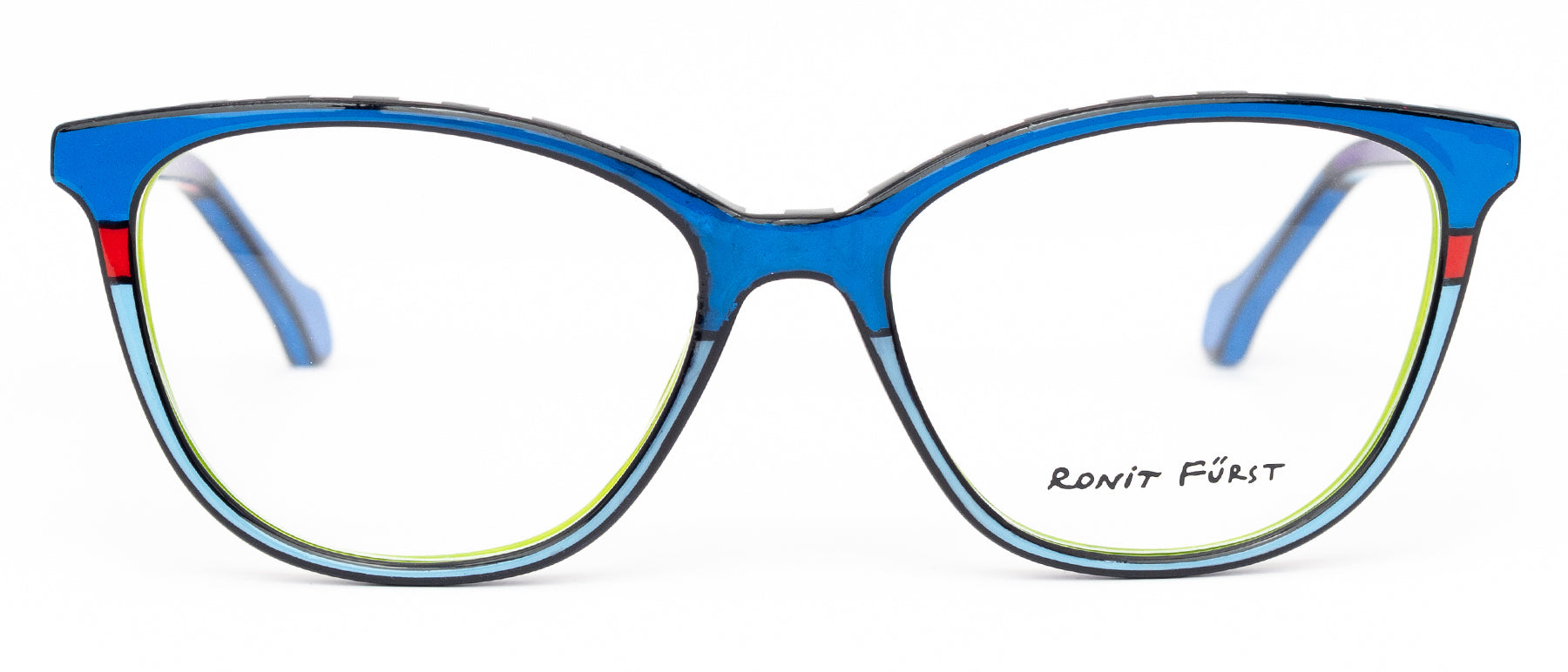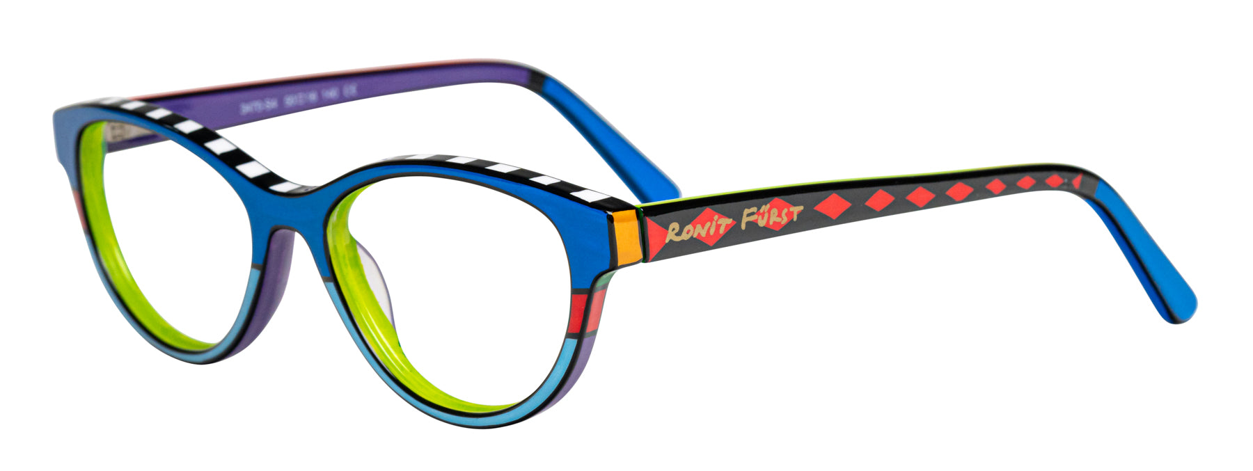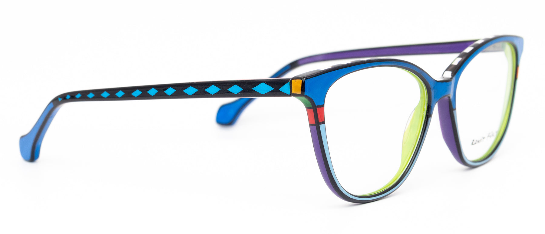 Two-tone-inspired front in Cobalt/Sky Blue/Vibrant Red, Lime Green inner angle and Black contour outline. Temples feature a striking diamond pattern in Vibrant Red/Sky Blue.