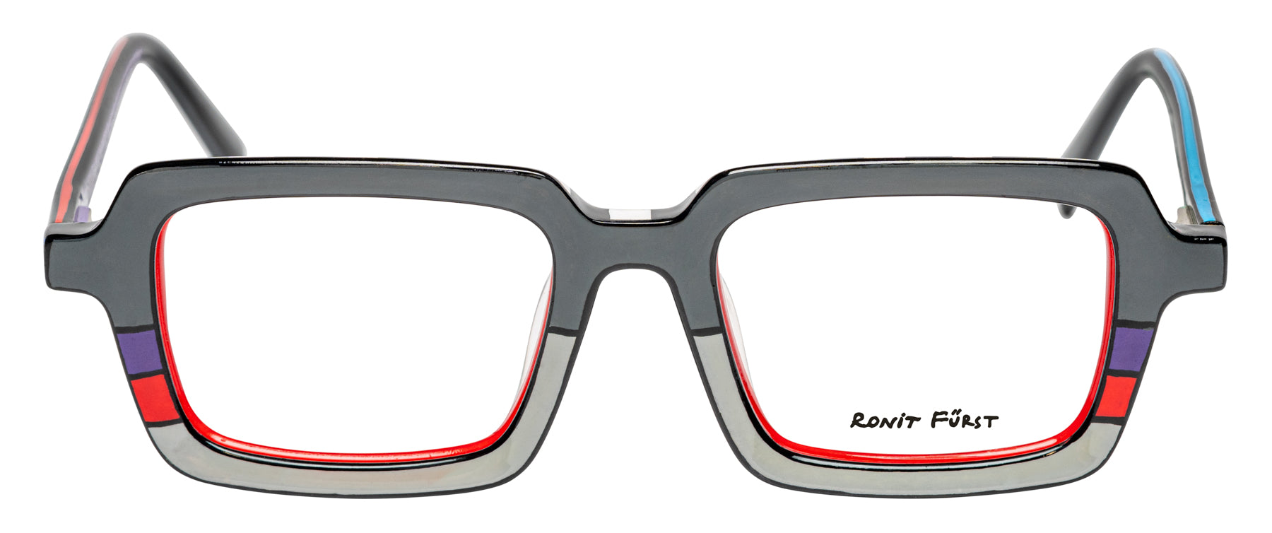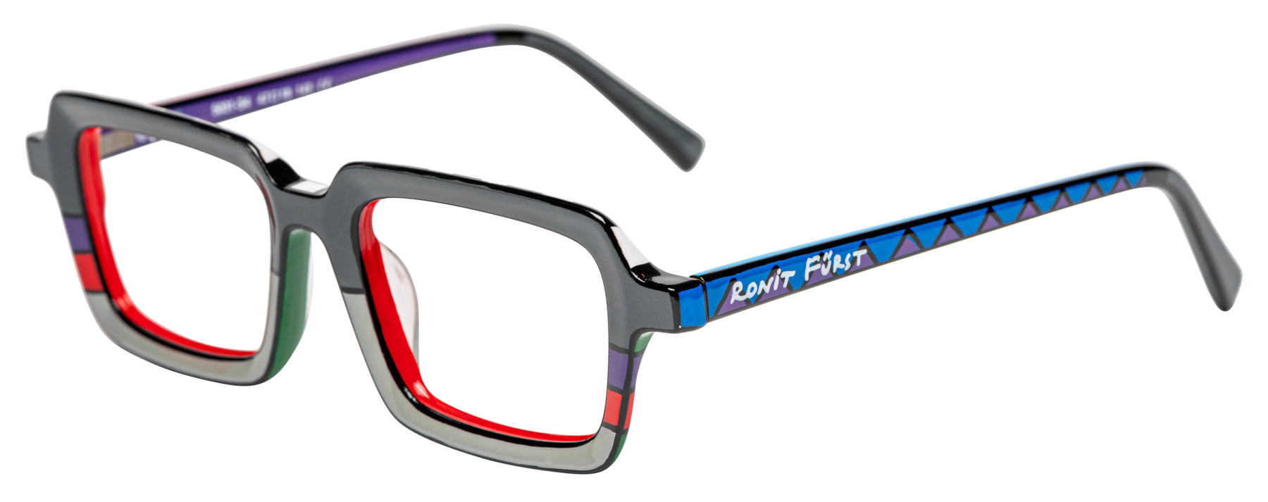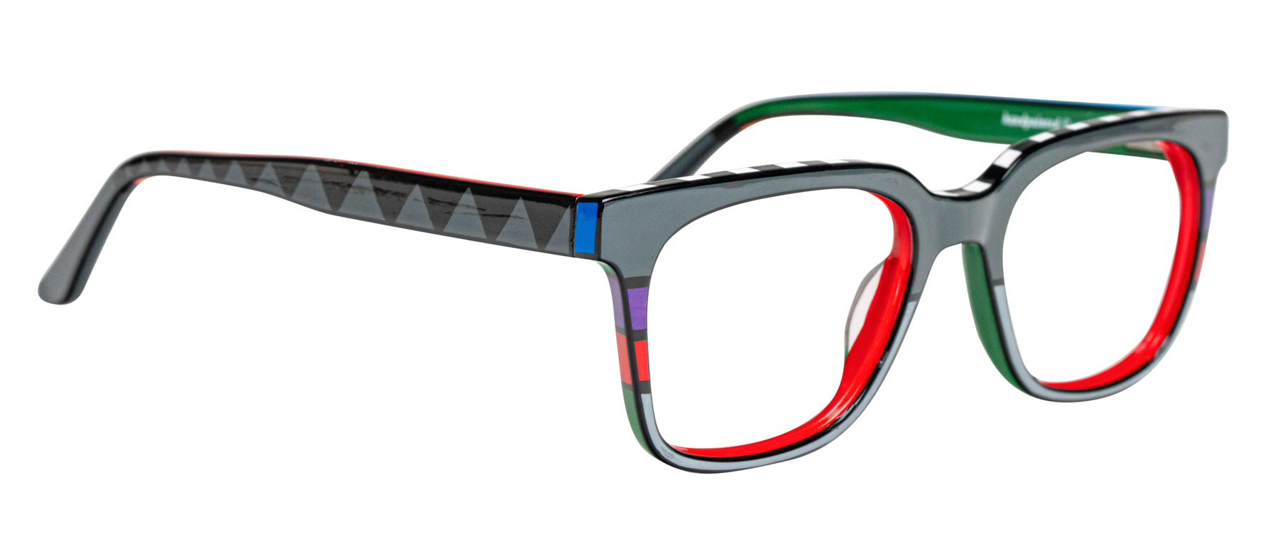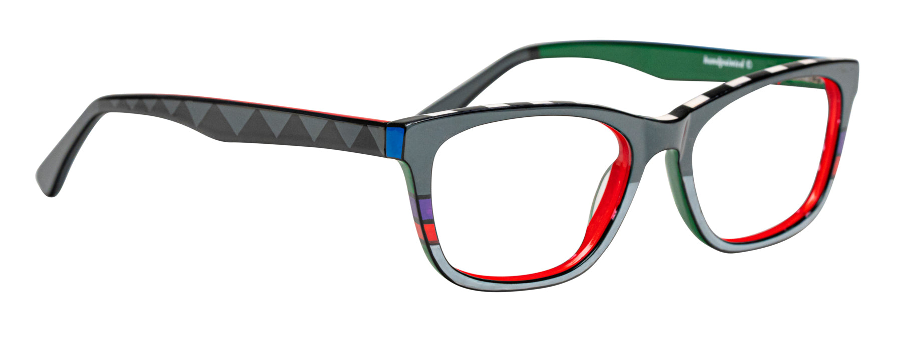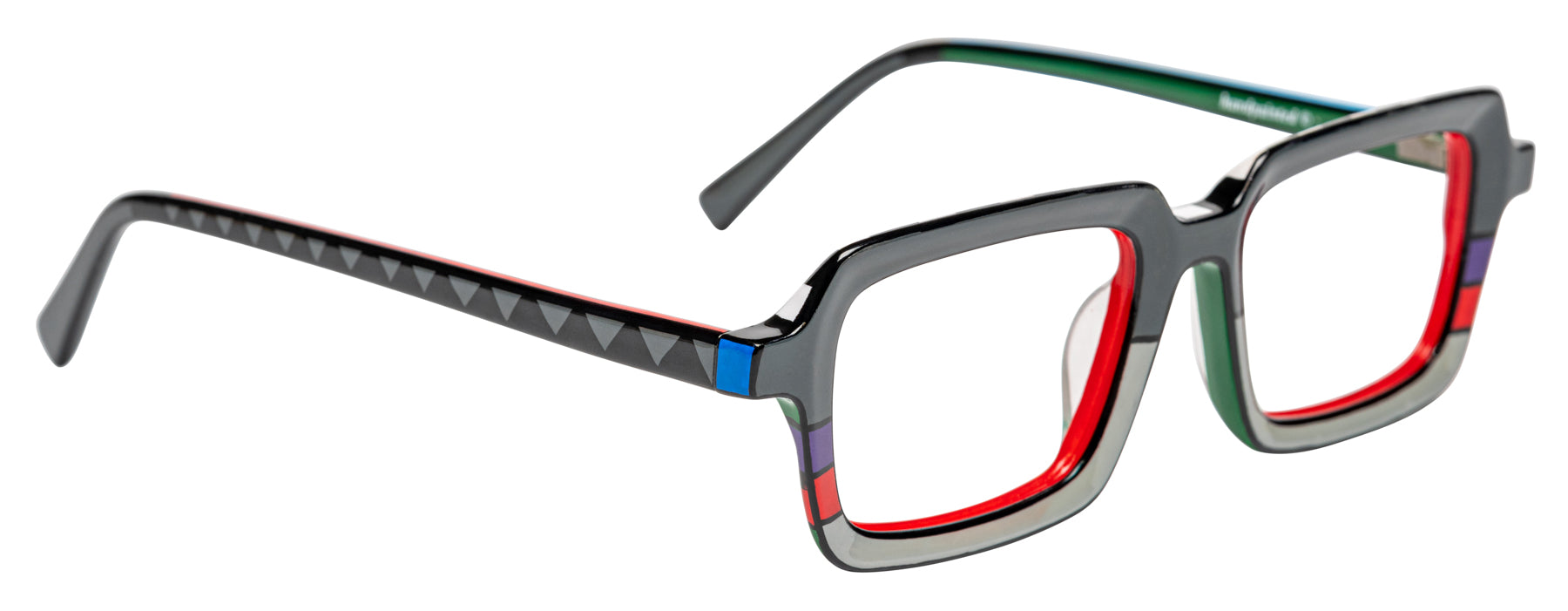 Two-tone-inspired front in Graphite/Coin Gray, featuring lines in Vibrant Red and Forest Green. Temples in Electric Purple/Forest Green with Bright Orange outer angles.