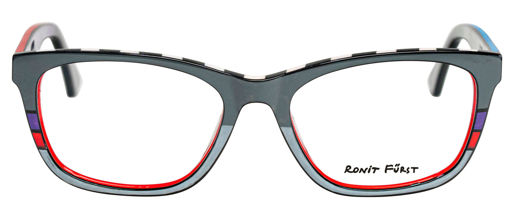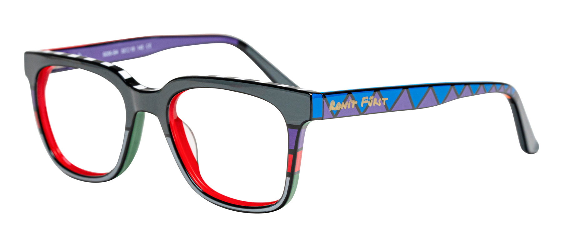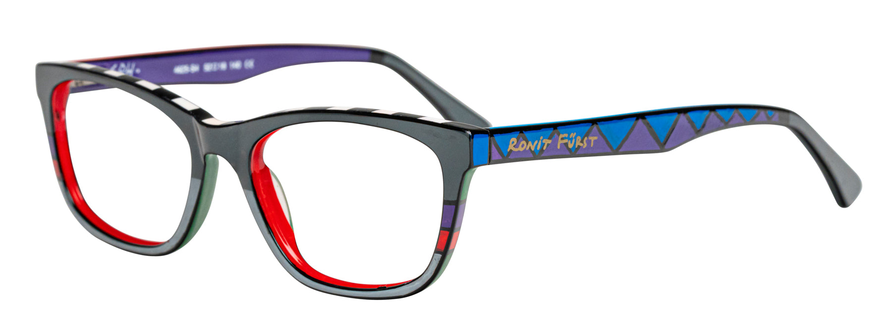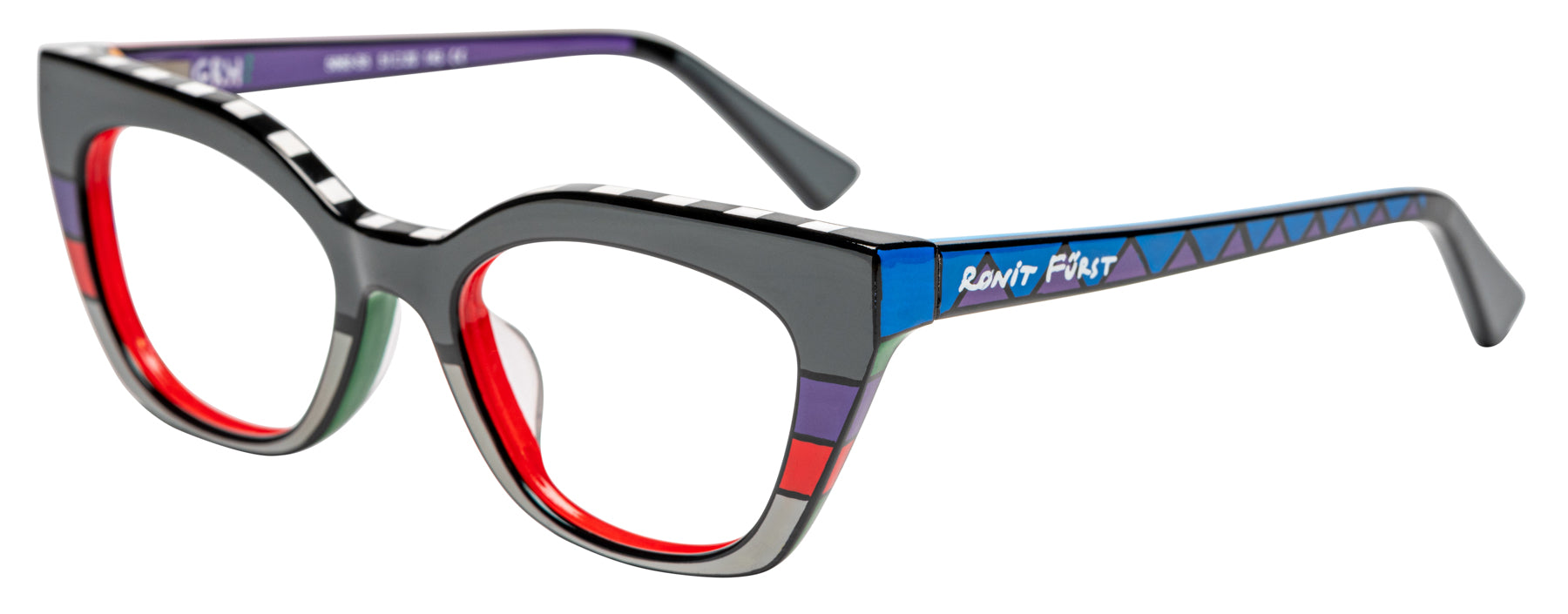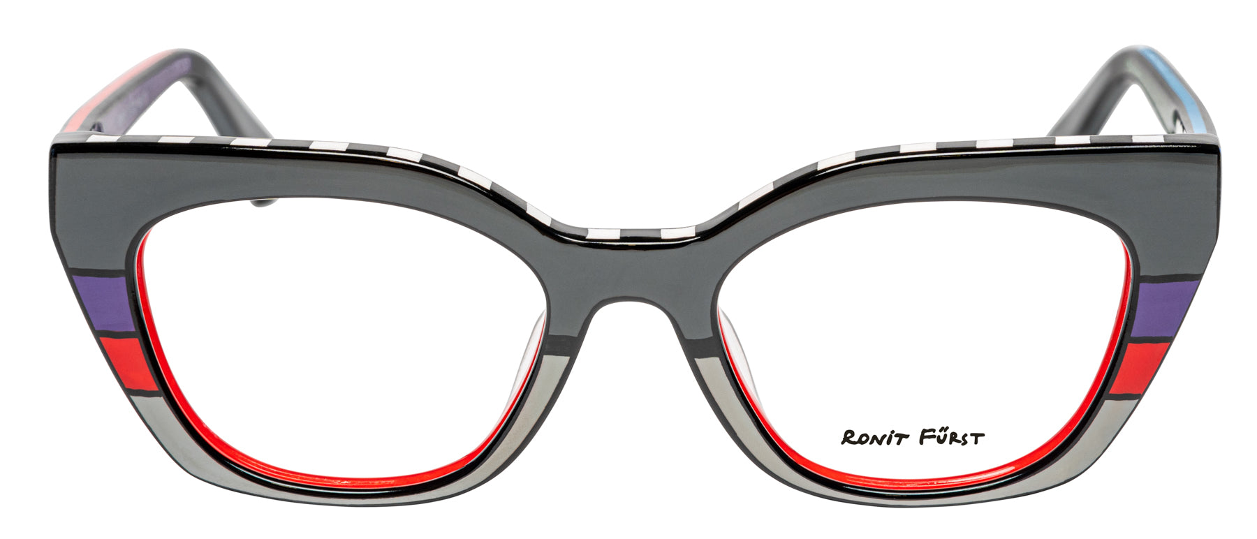 Two-tone-inspired front in Graphite/Coin Gray, featuring lines in Vibrant Red and Forest Green. Temples in Electric Purple/Forest Green with Bright Orange outer angles.