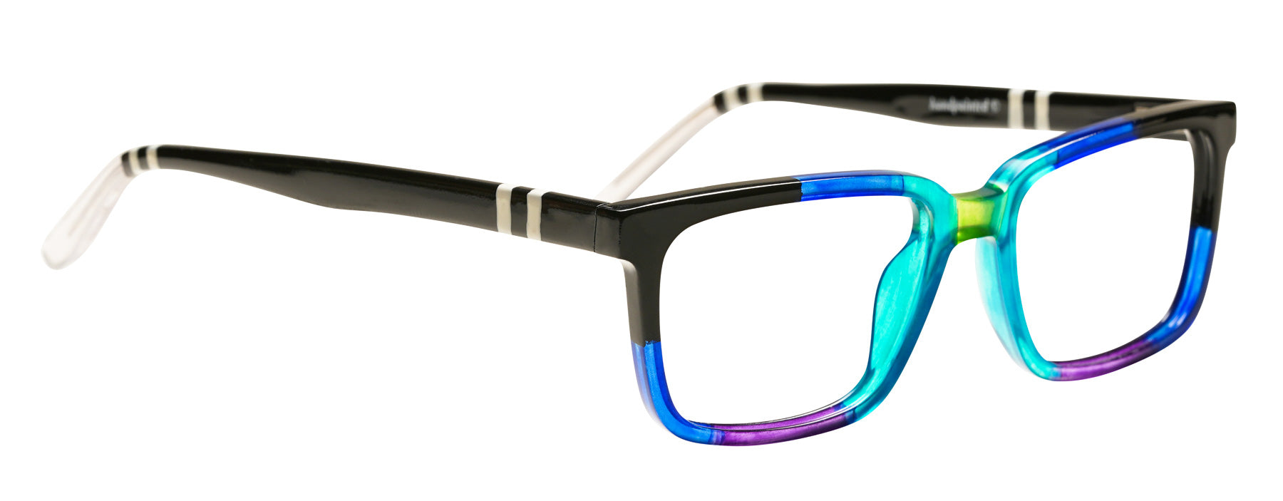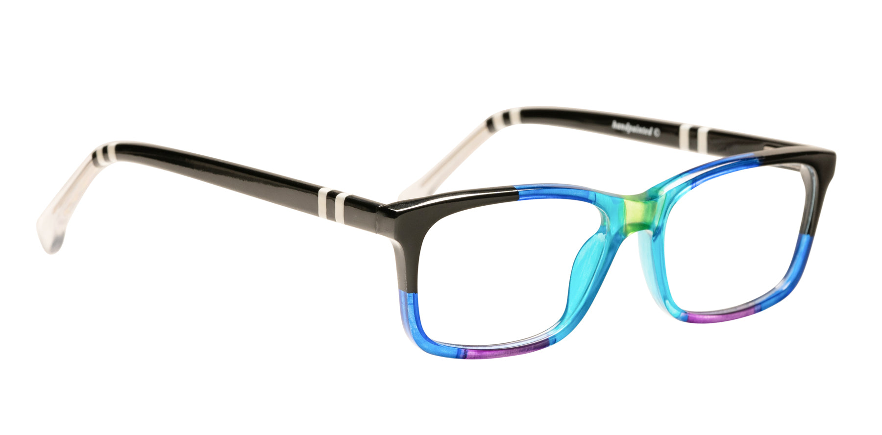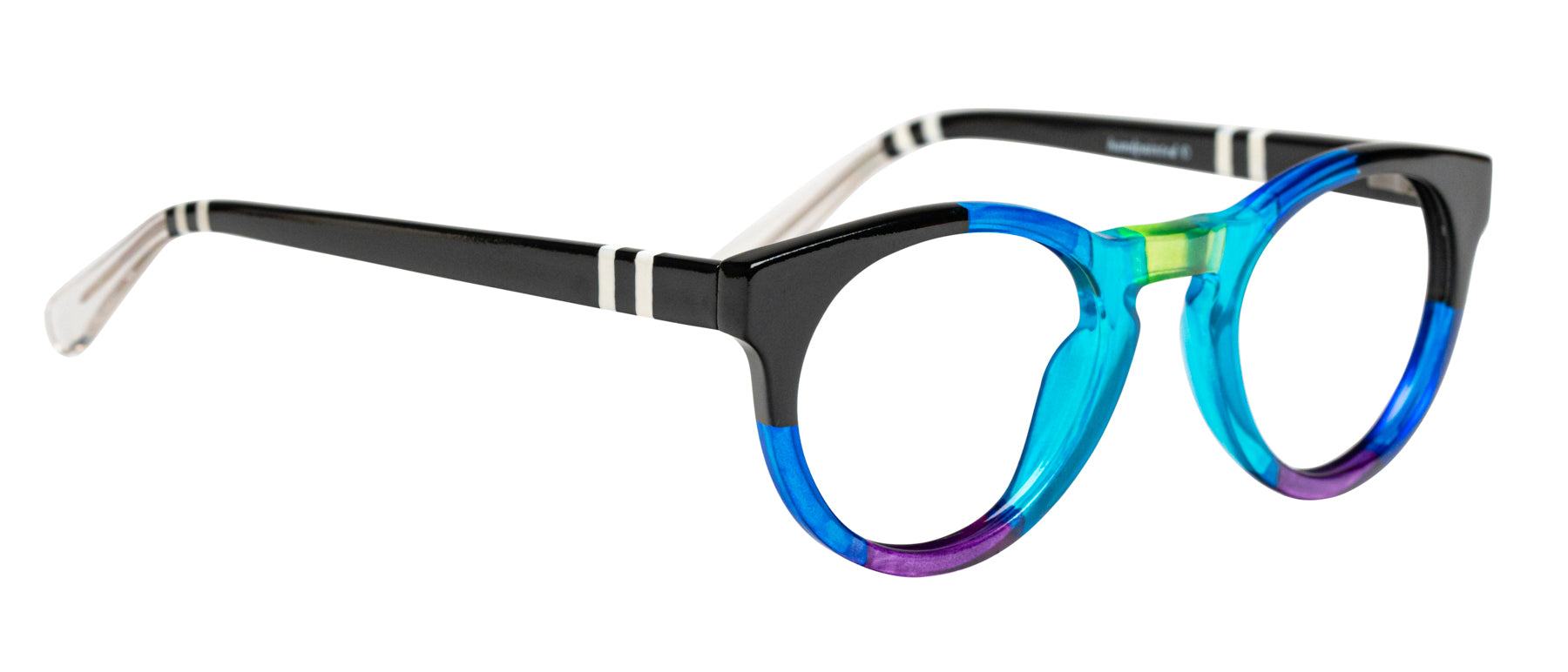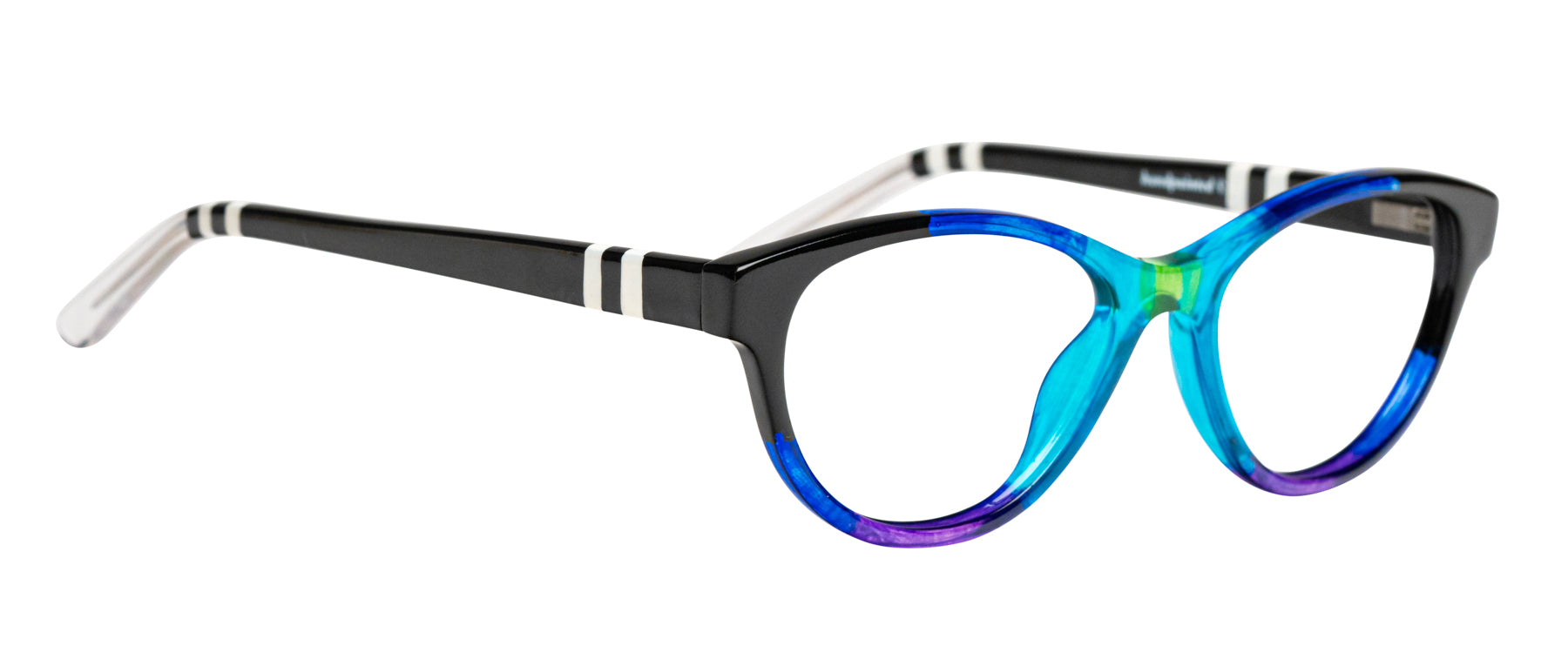 Multicolor Opaque Black and Transparent Turquoise, Purple and Blue front. Temples in Opaque Black with Opaque White stripes.