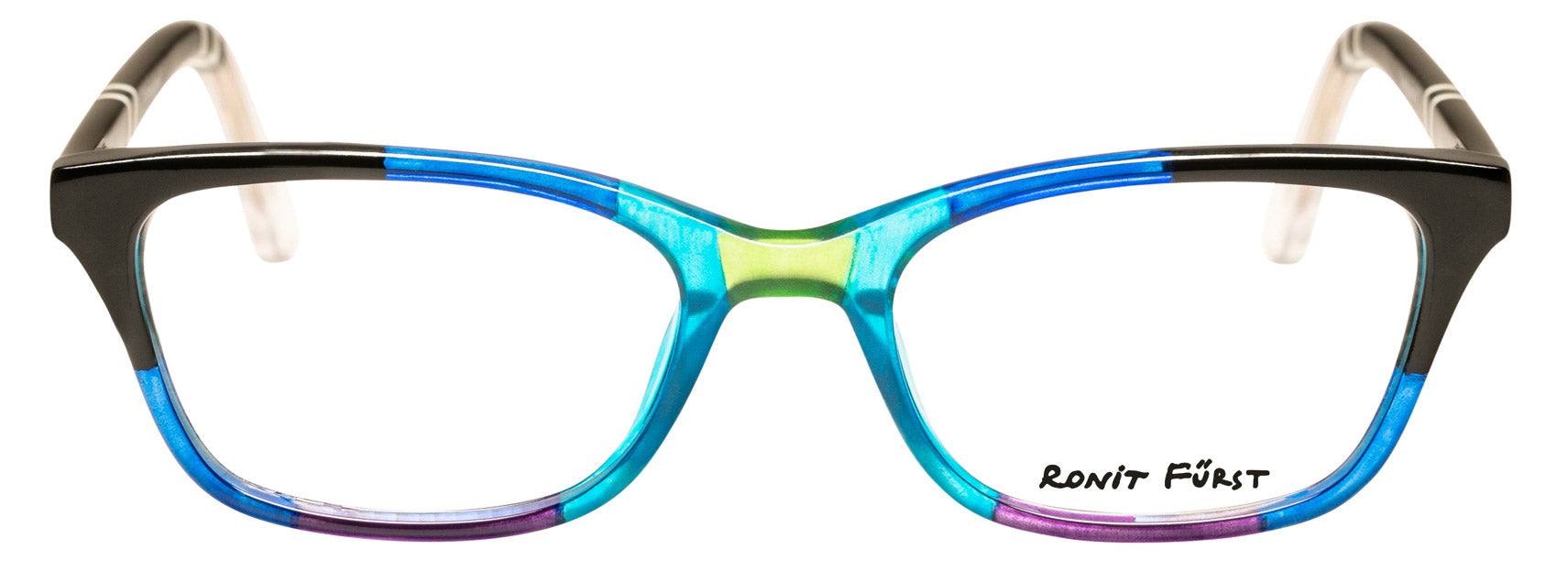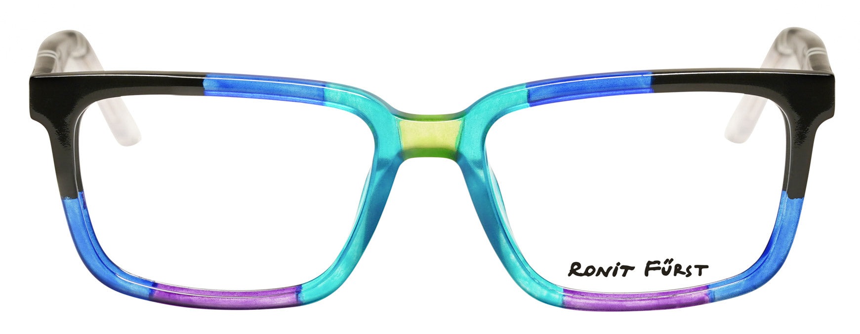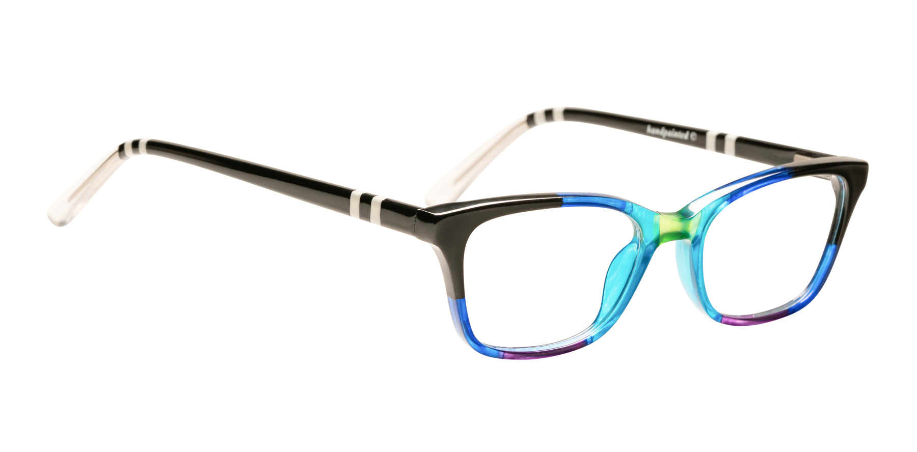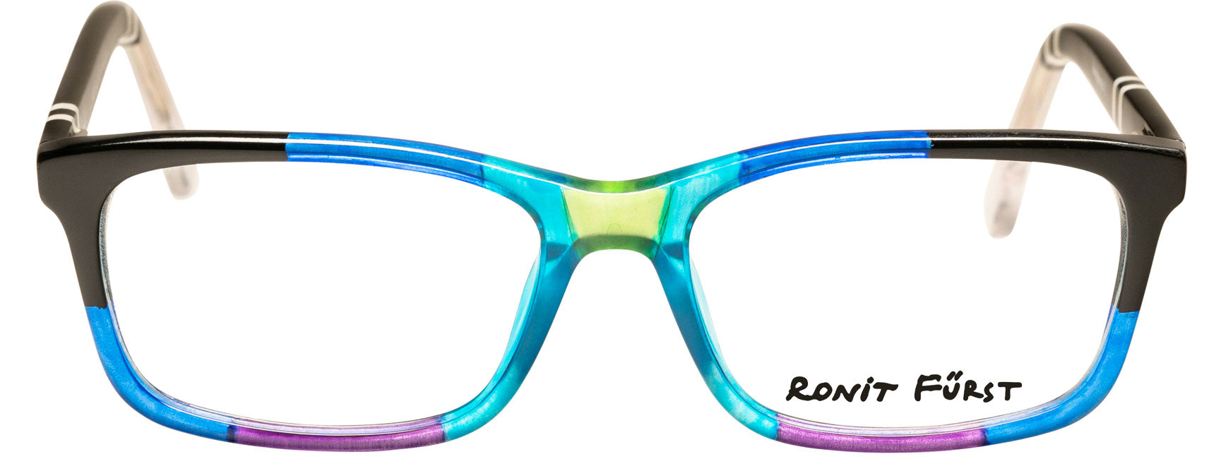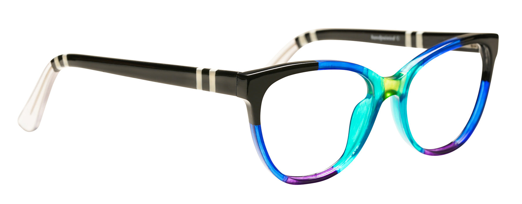 Multicolor Opaque Black and Transparent Turquoise, Purple and Blue front. Temples in Opaque Black with Opaque White stripes.