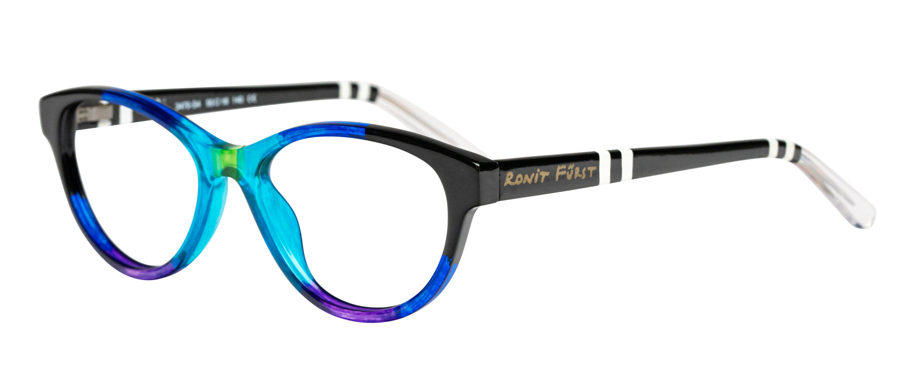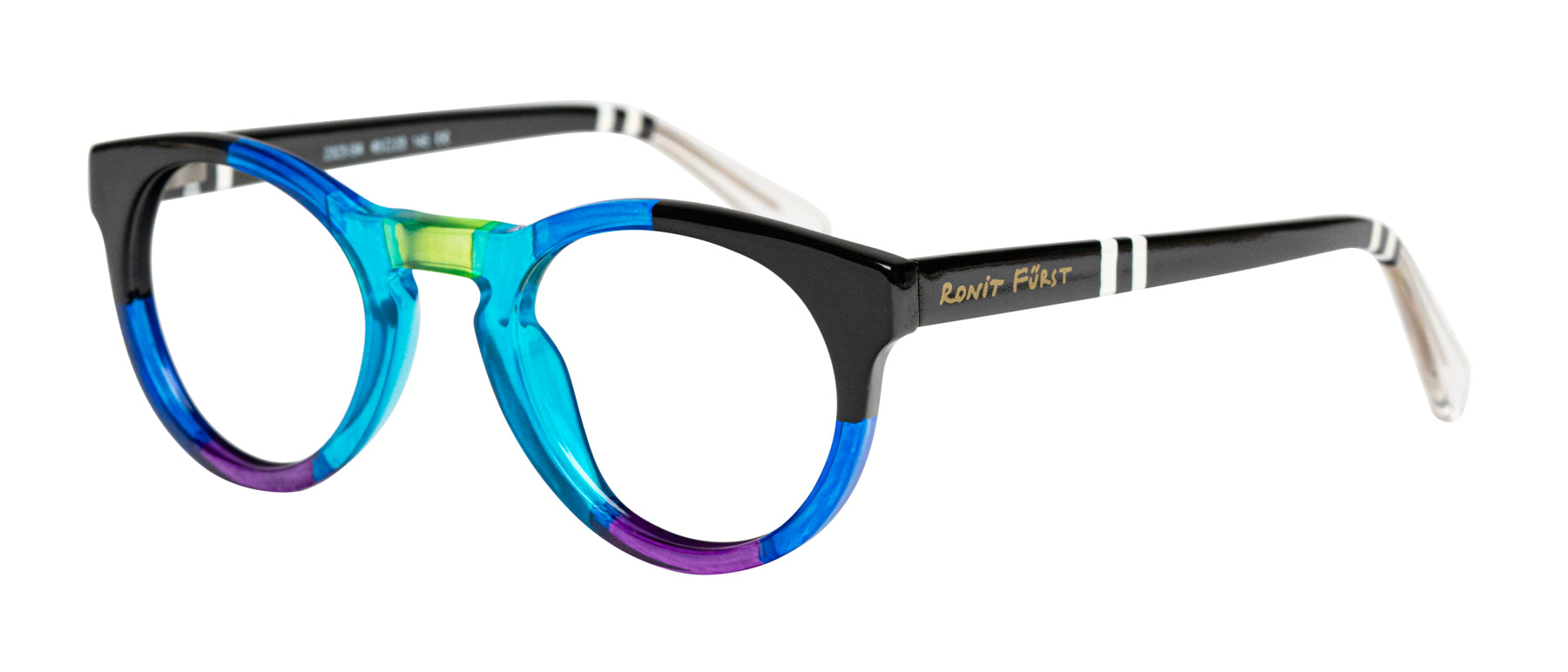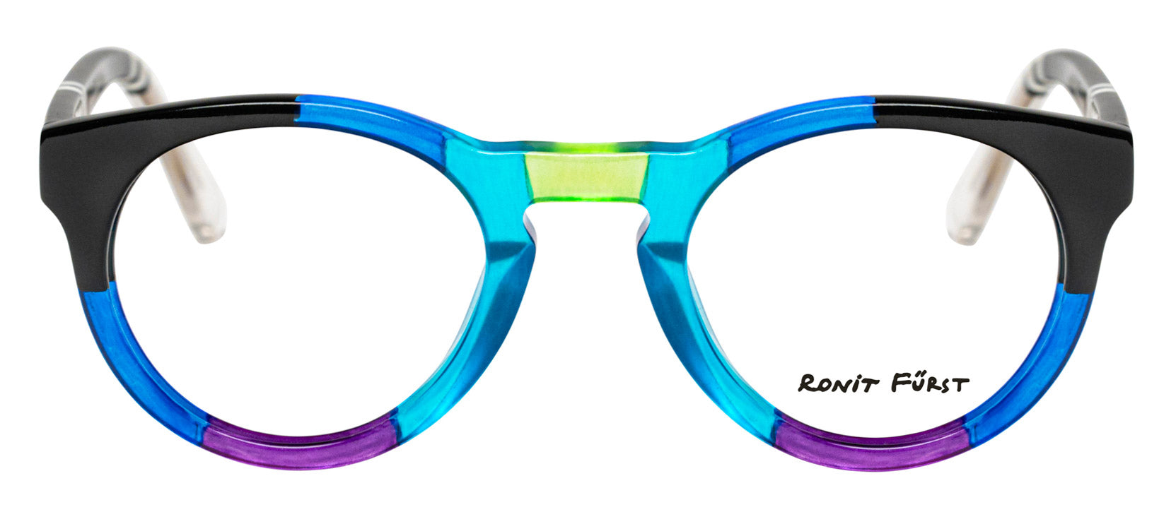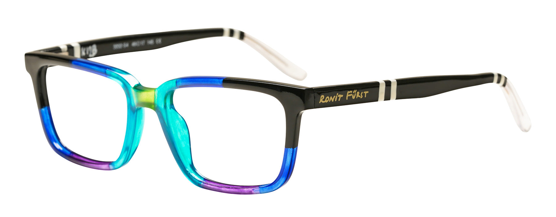 Multicolor Opaque Black and Transparent Turquoise, Purple and Blue front. Temples in Opaque Black with Opaque White stripes.