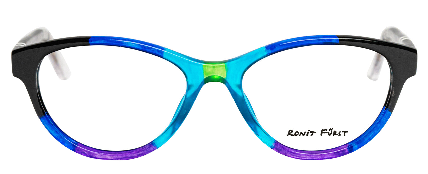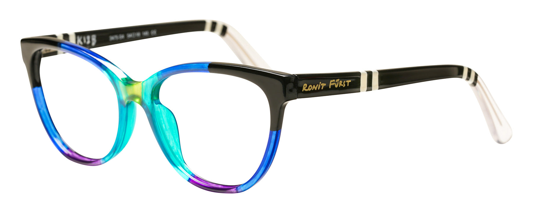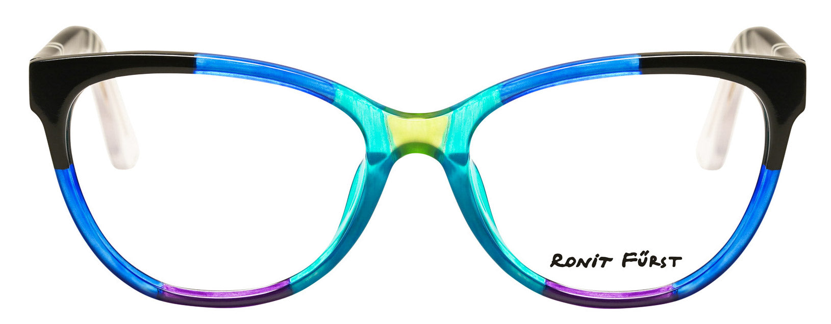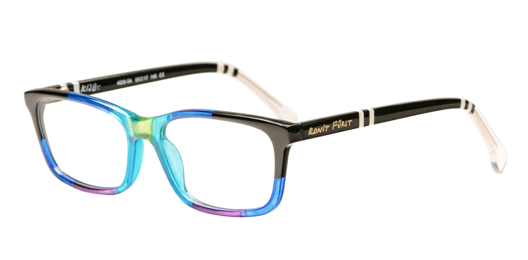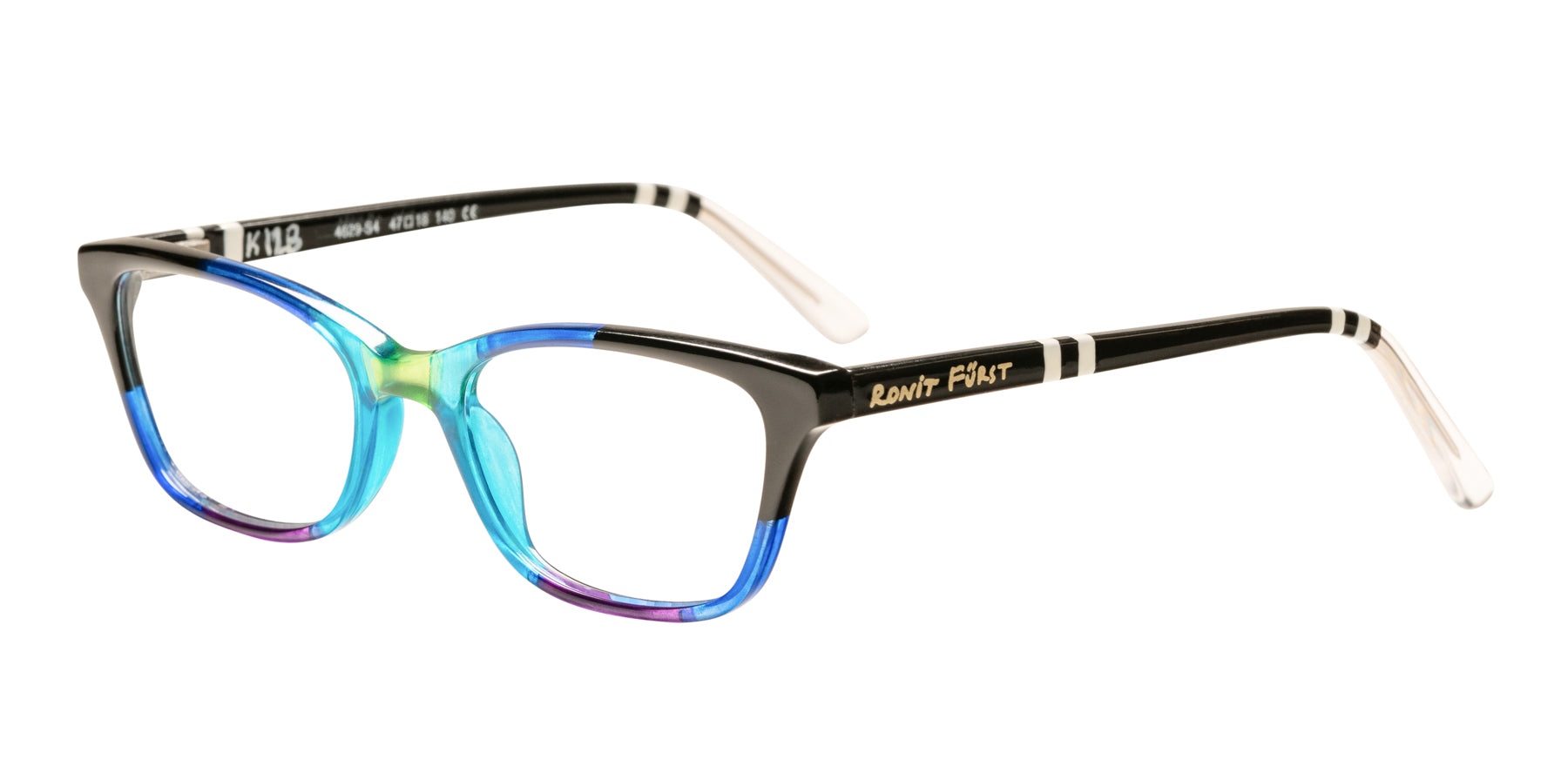 Multicolor Opaque Black and Transparent Turquoise, Purple and Blue front. Temples in Opaque Black with Opaque White stripes.