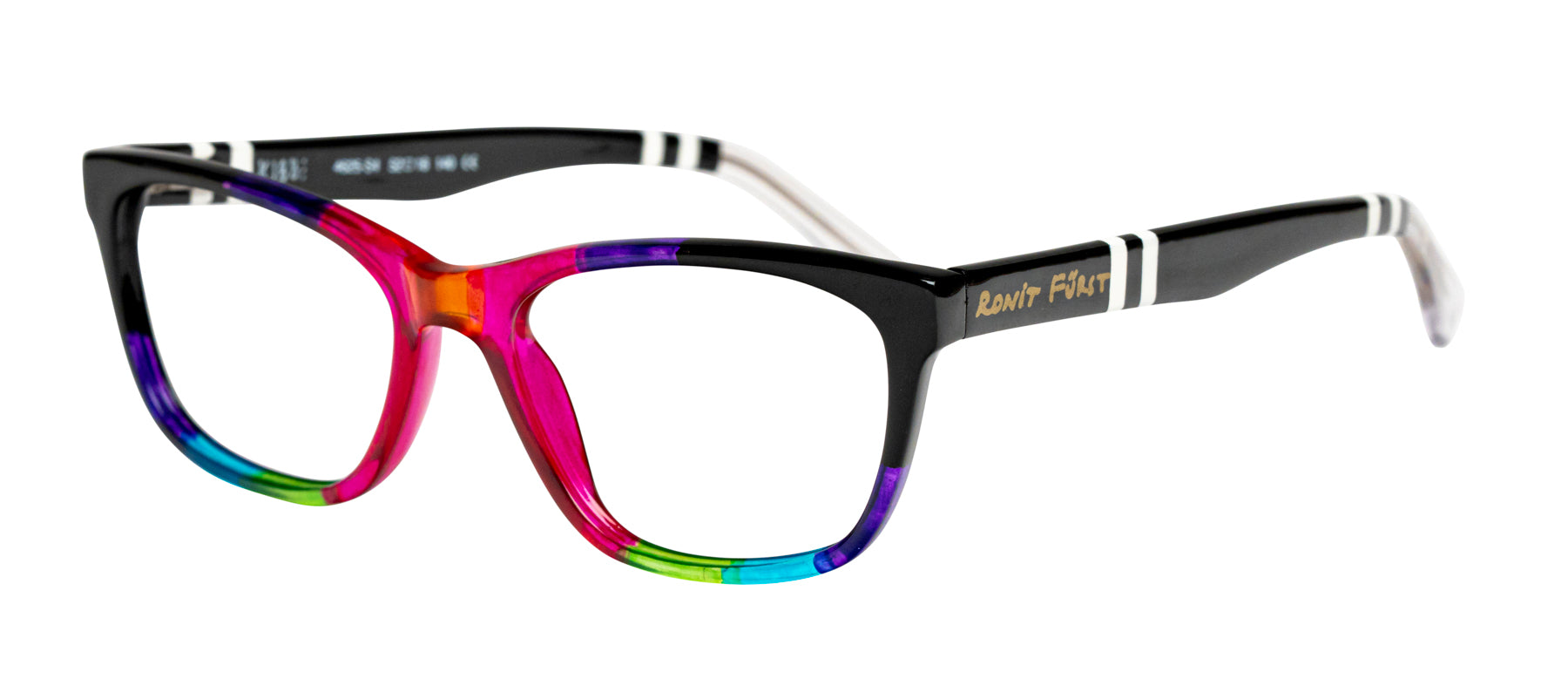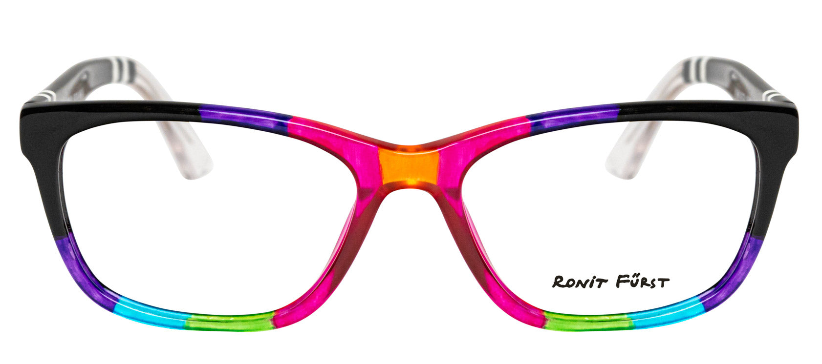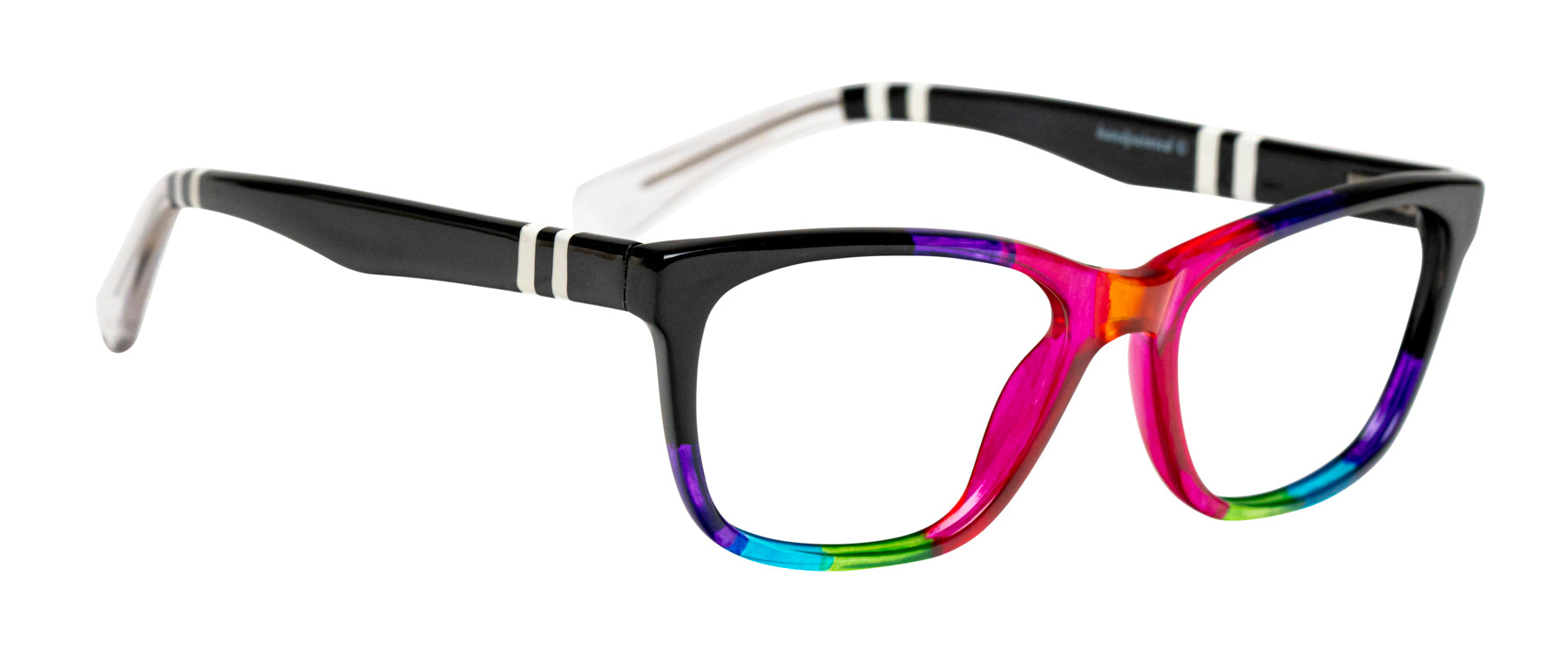 Multicolor Opaque Black and Transparent Pink, Purple and Green front. Temples in Opaque Black with Opaque White stripes.