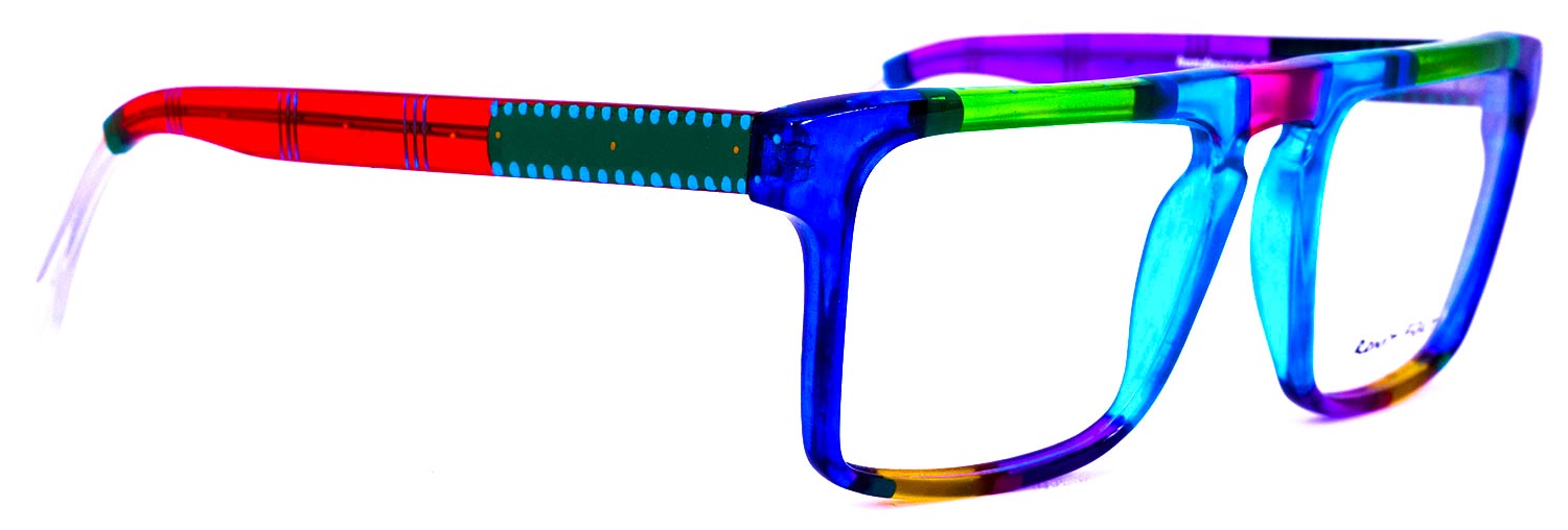 Color 13, Multicolor Transparent Turquoise and Red front with Opaque Purple edges with micro dots and fine pinstripe detailing on top of bridge. Temples in vibrant Transparent Red, Green and Orange with micro dots and stripes.