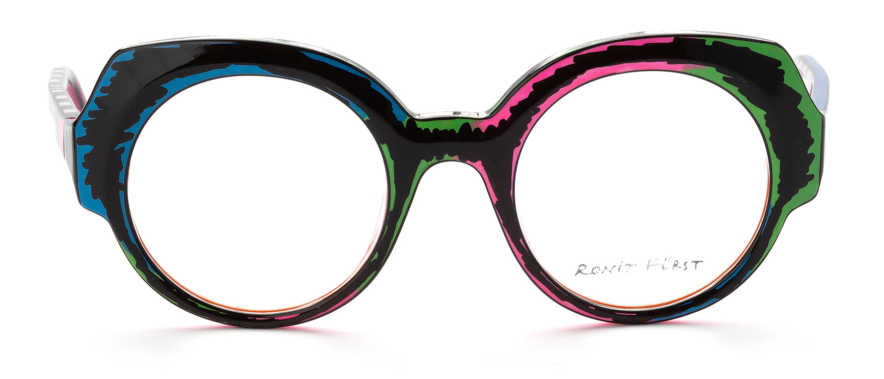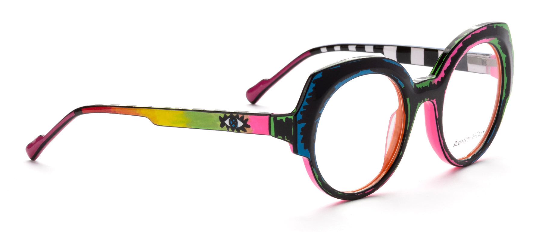 Neon Pink, Sapphire Blue, Vivid Yellow and Bright Orange front with a unique Black pattern. Colorful temples feature hand-drawn symbols.