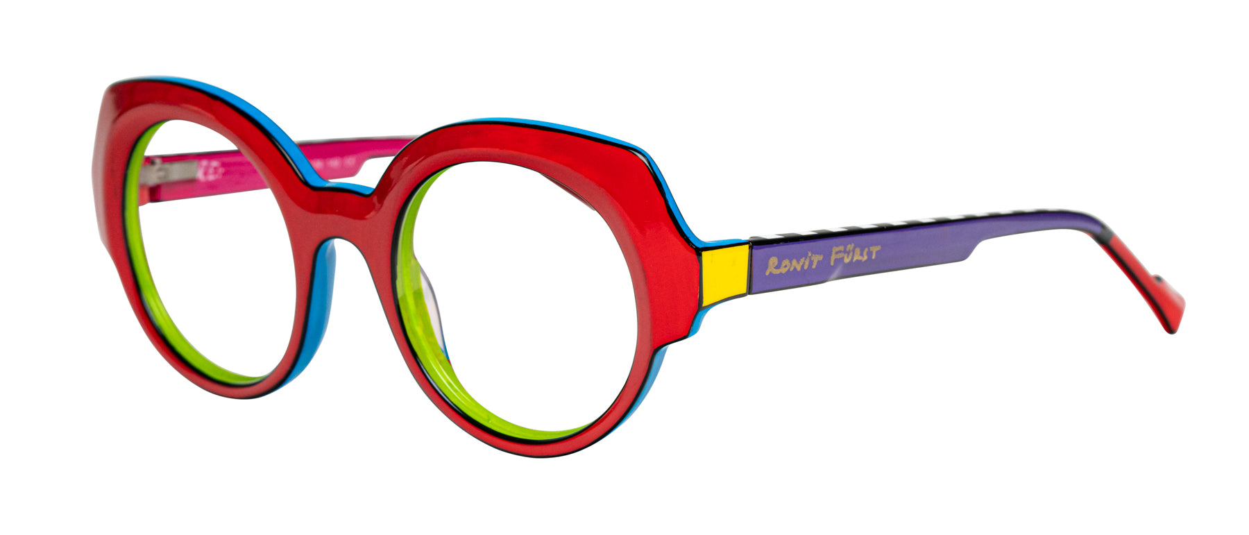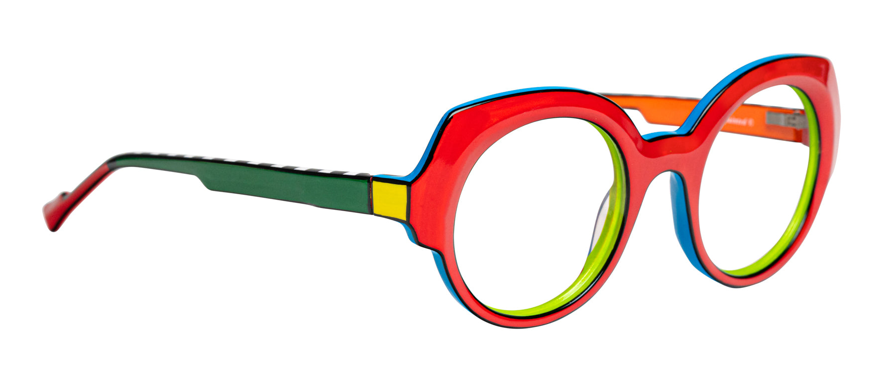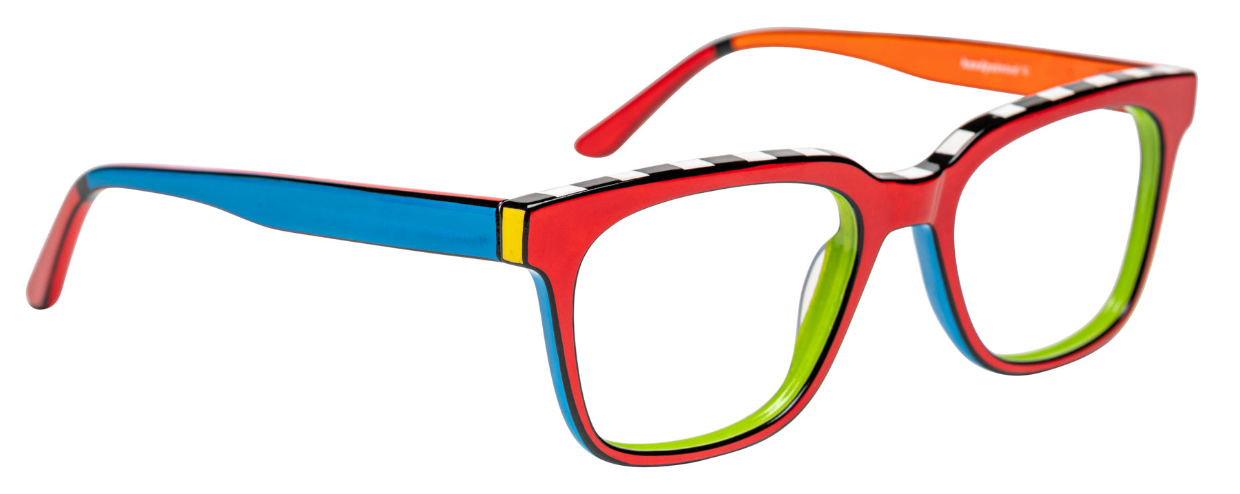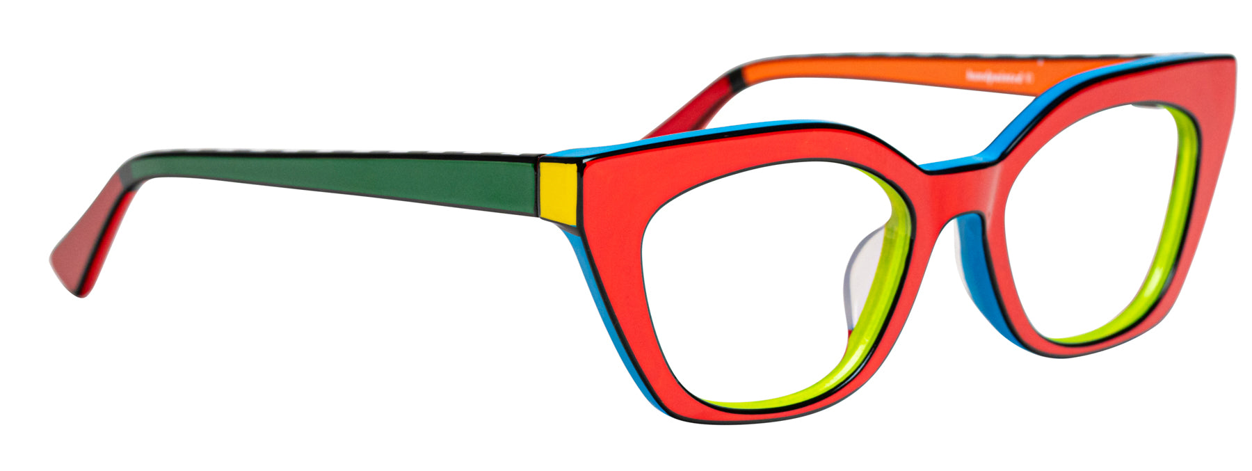 Vibrant Red front with a Black contour outline, Lime Green inner angle and temples in Bright Orange/hot Pink on the inner side, and Forest Green/Electric Purple on the outer side.