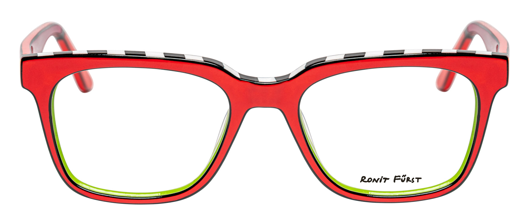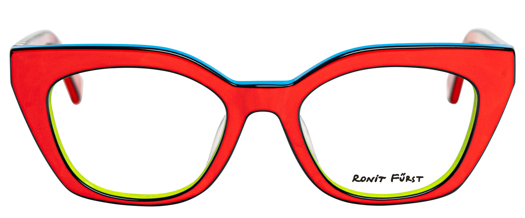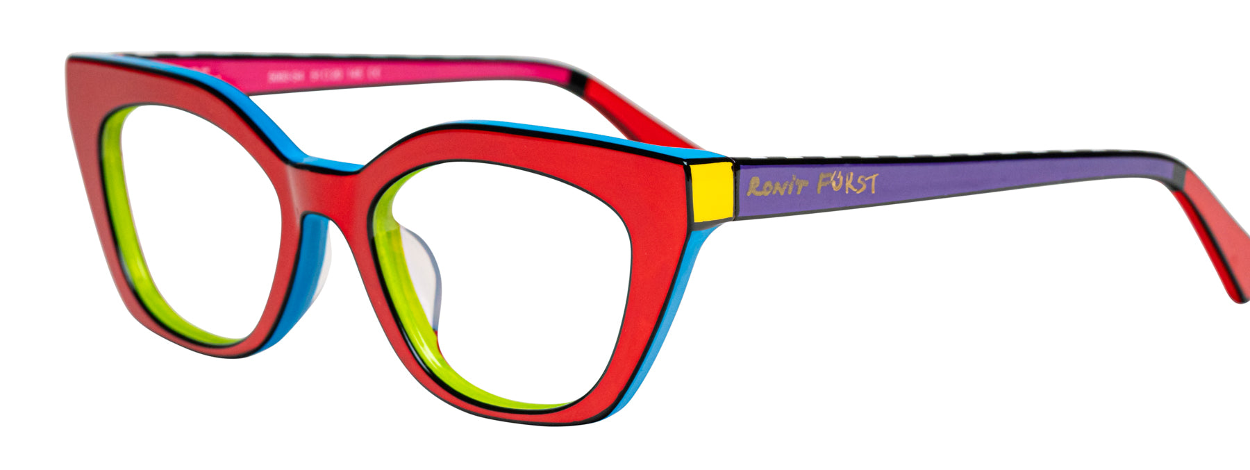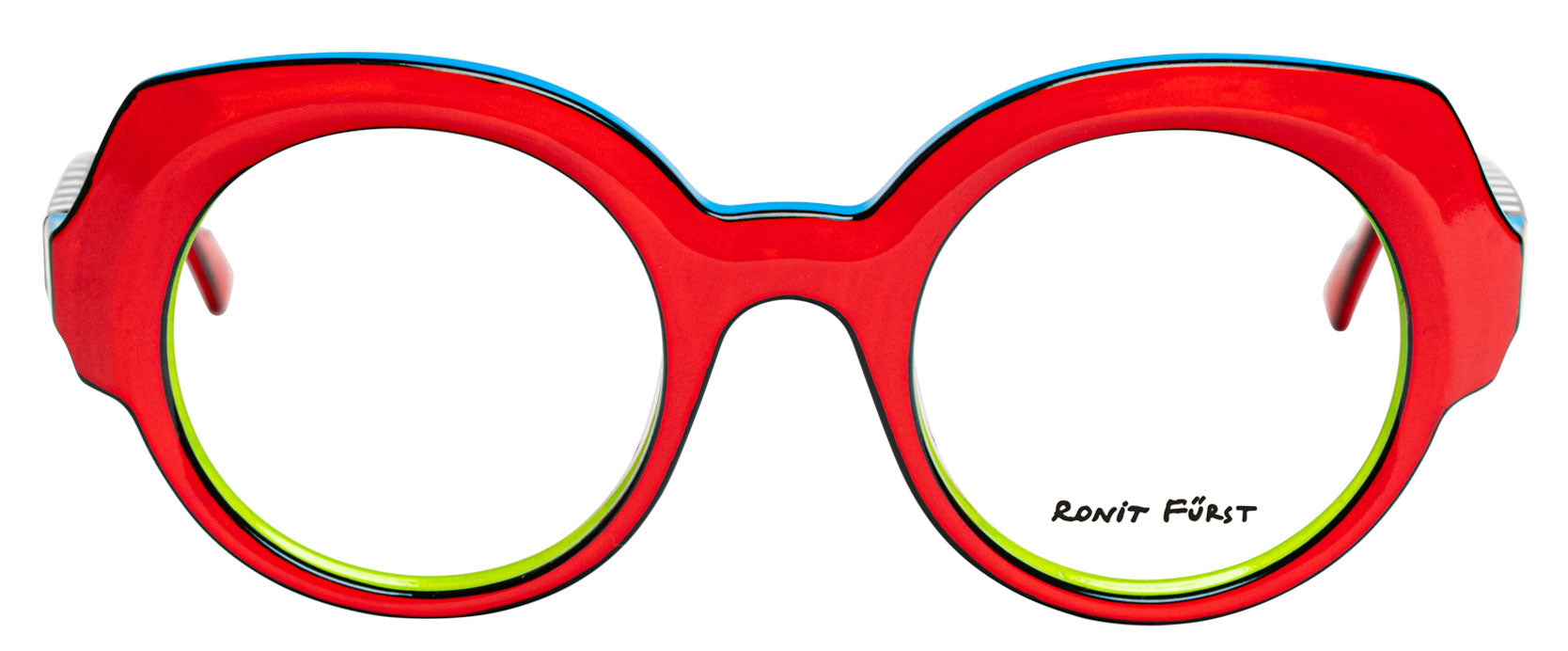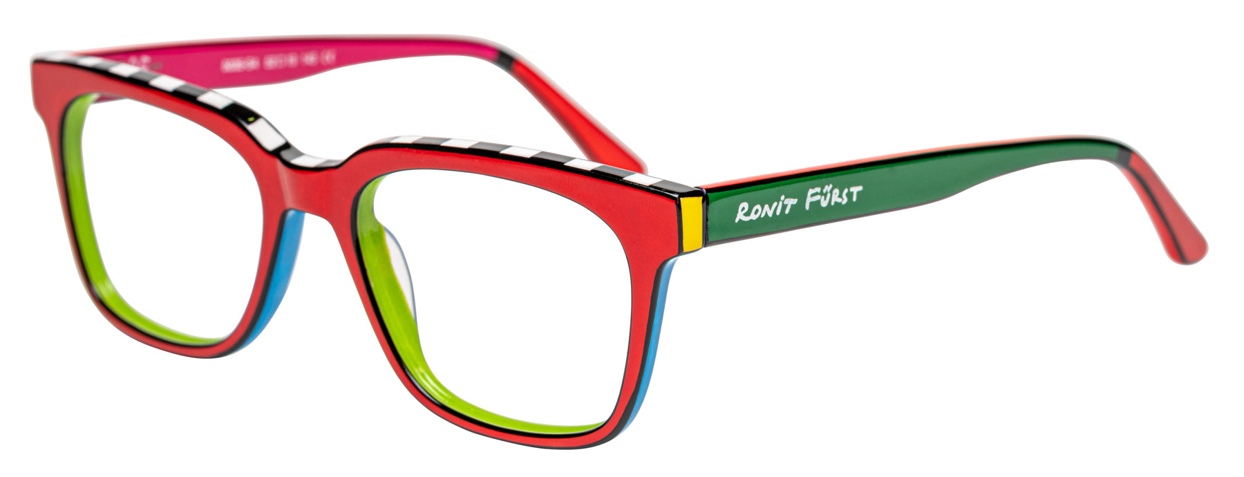 Vibrant Red front with a Black contour outline, Lime Green inner angle and temples in Bright Orange/hot Pink on the inner side, and Forest Green/Electric Purple on the outer side.