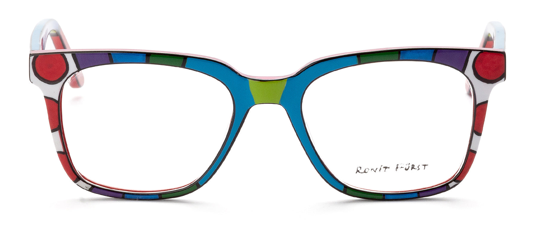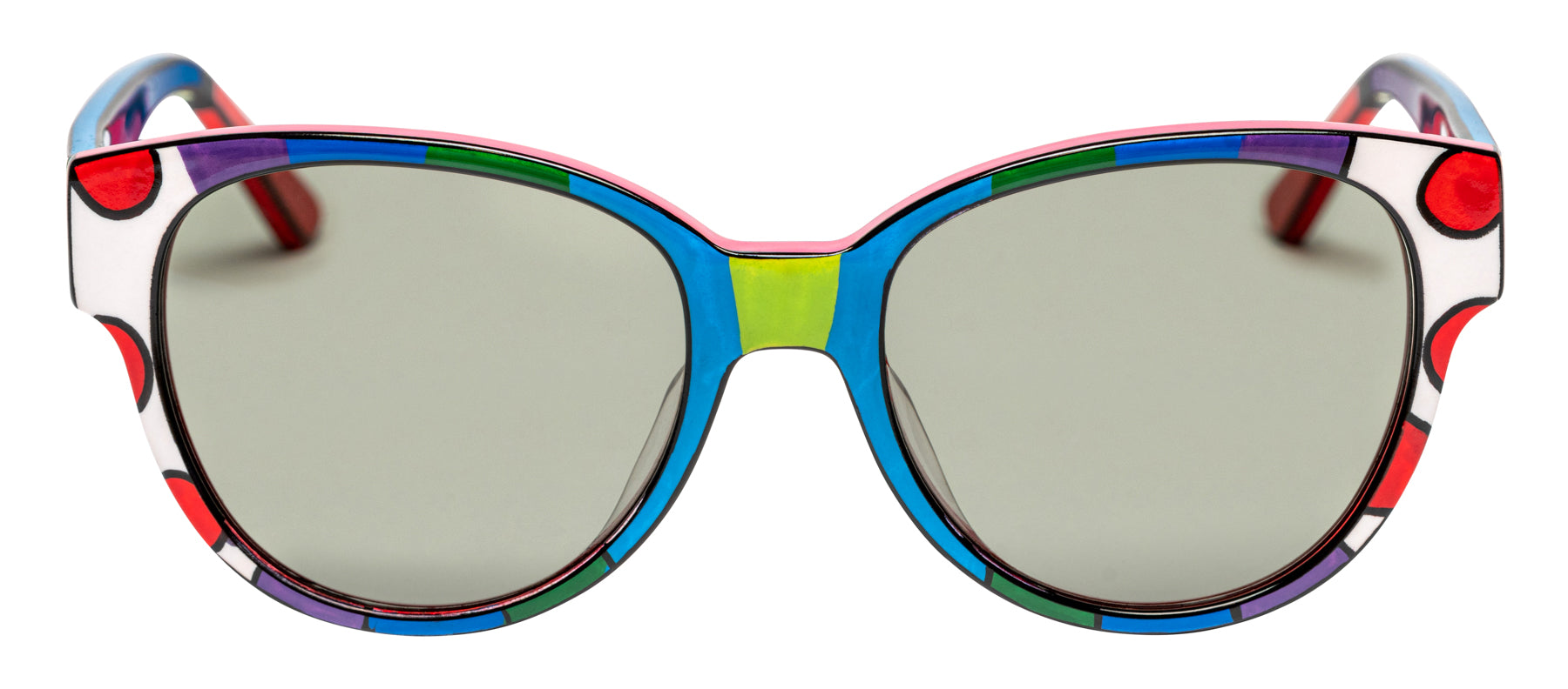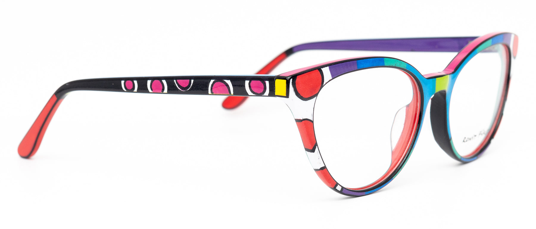 Cobalt Blue, Electric Purple, Forest Green and Angelic White front with vibrant Red dots. Lime Green bridge and Black contour outline.