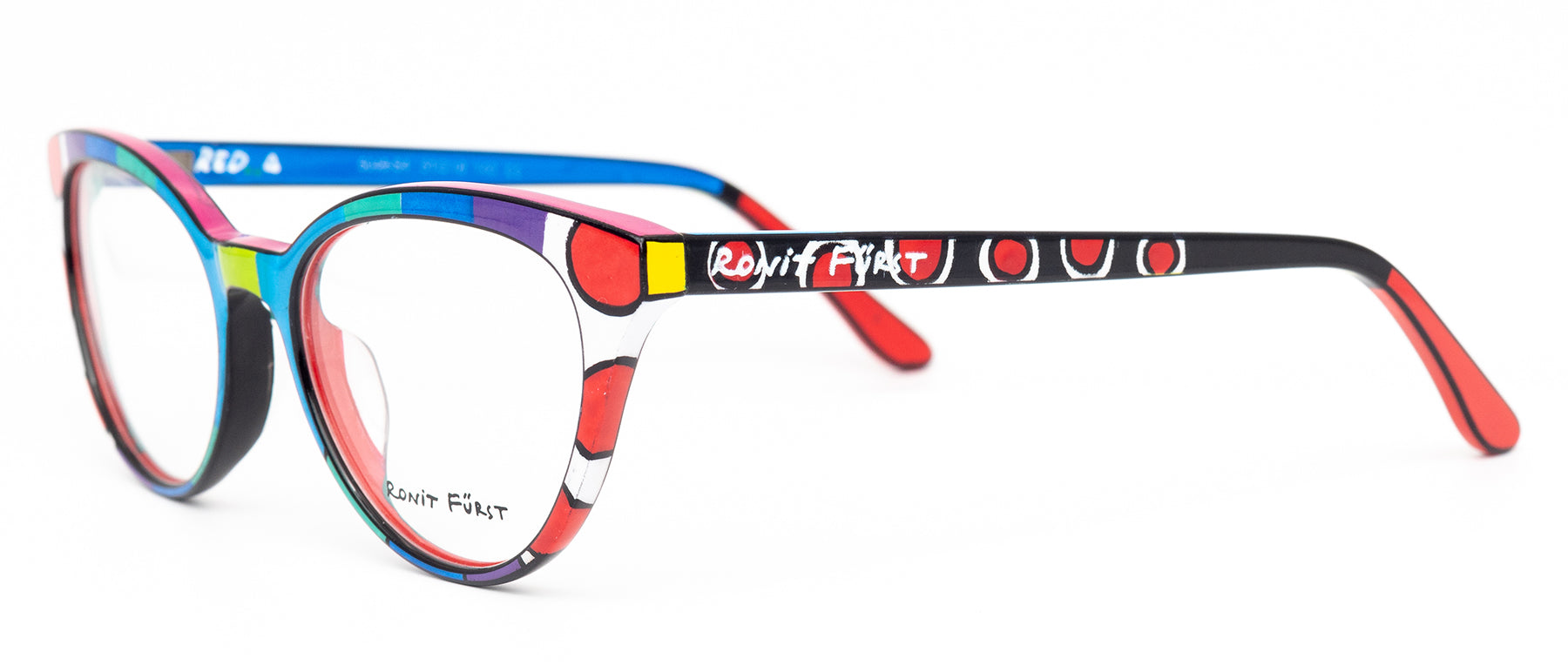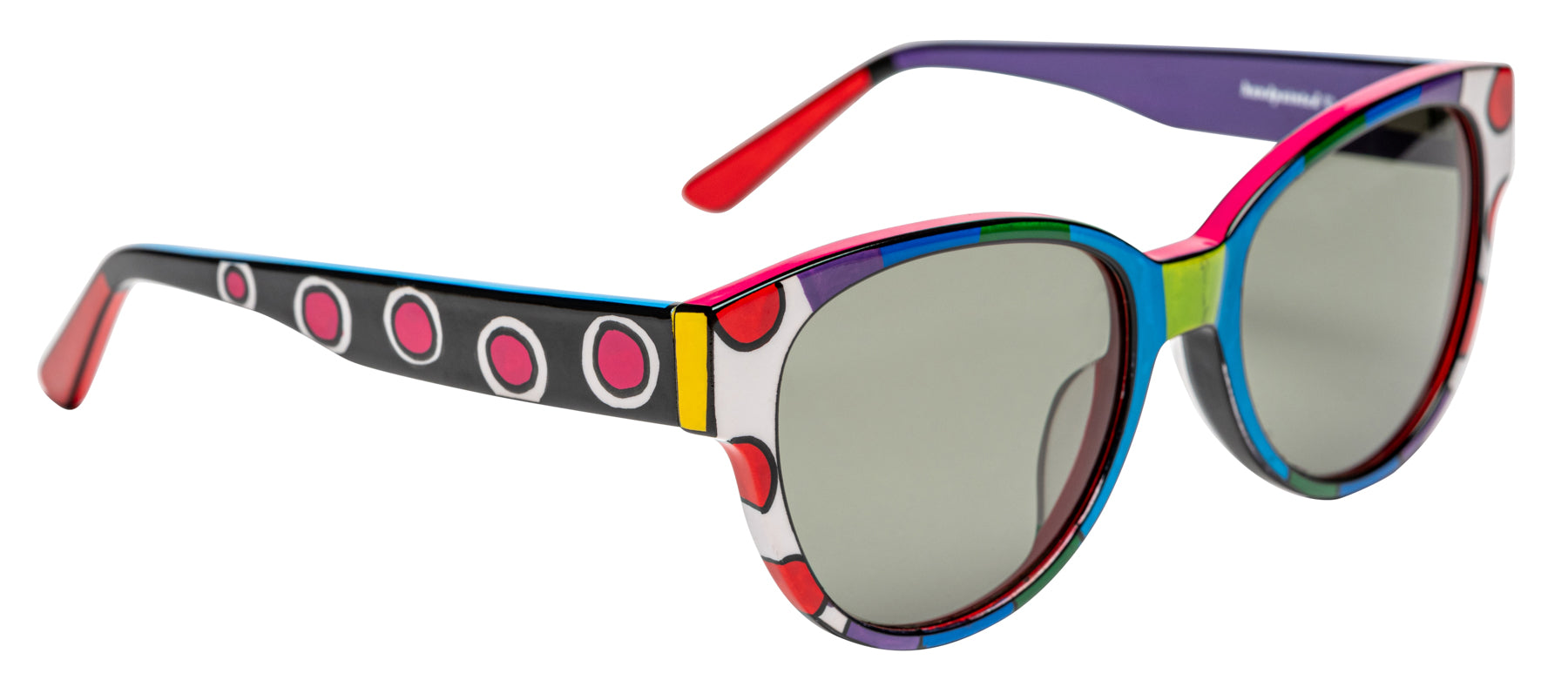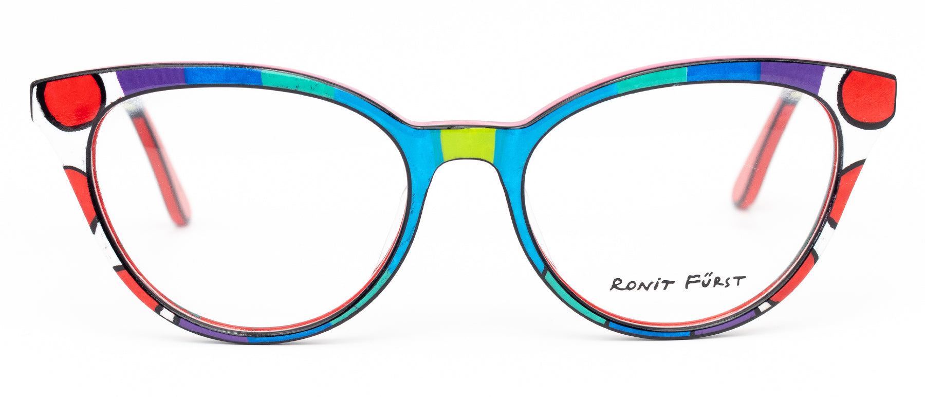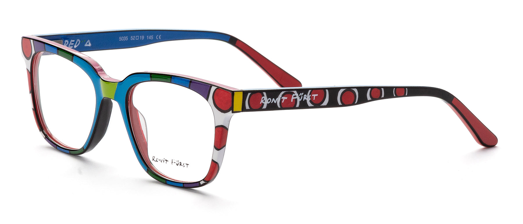 Cobalt Blue, Electric Purple, Forest Green and Angelic White front with vibrant Red dots. Lime Green bridge and Black contour outline.