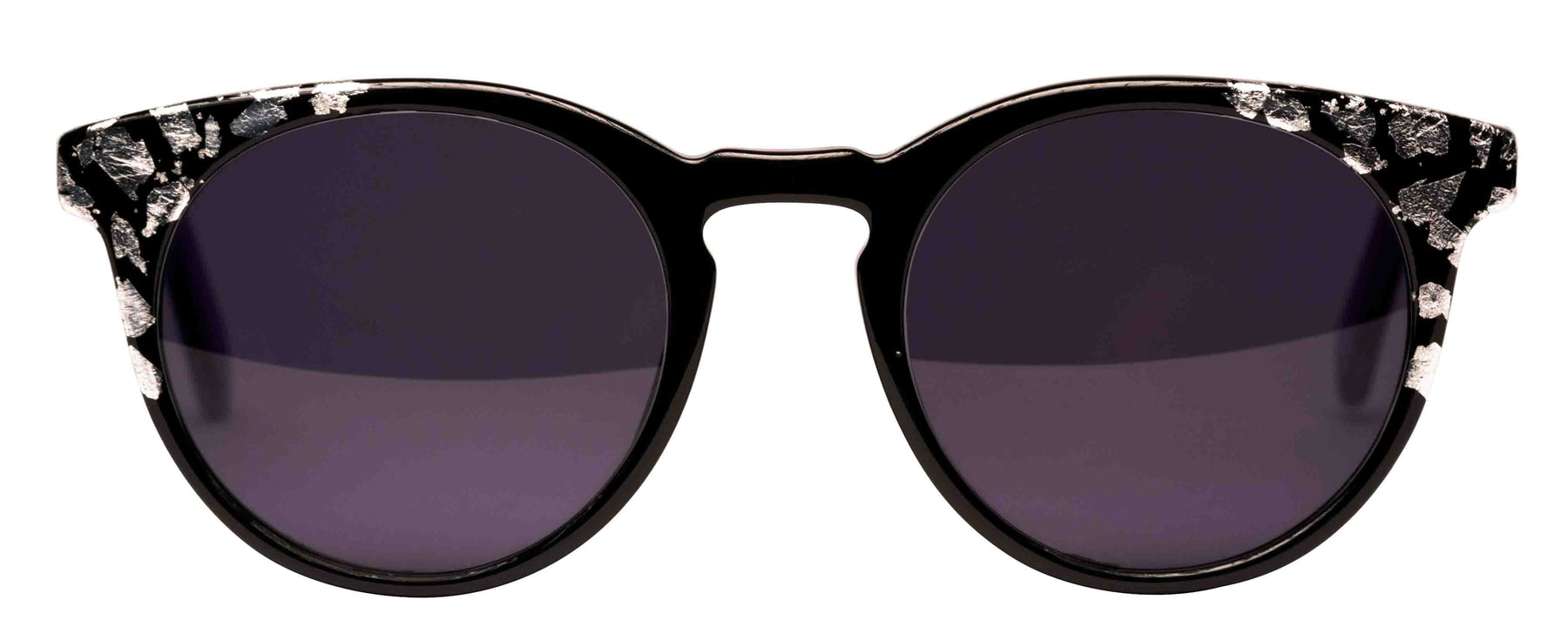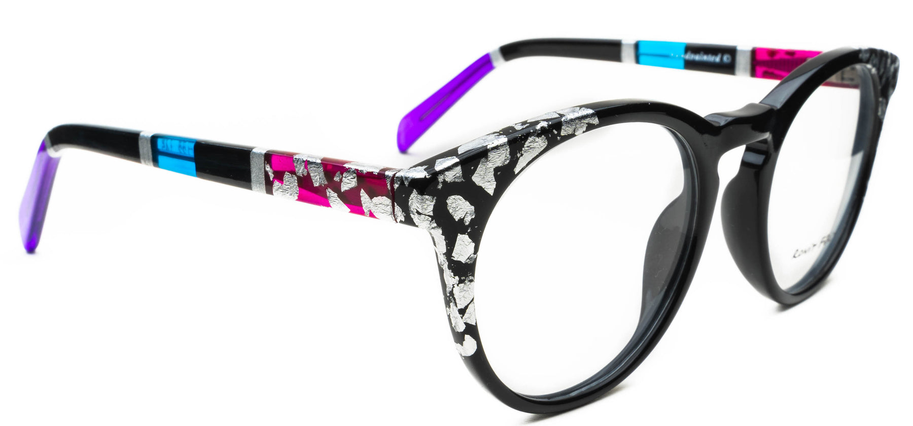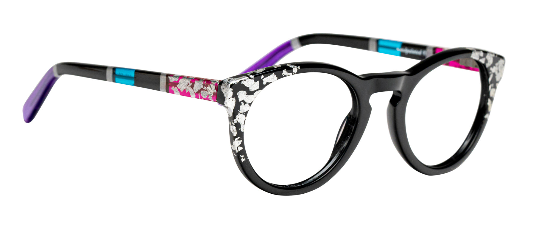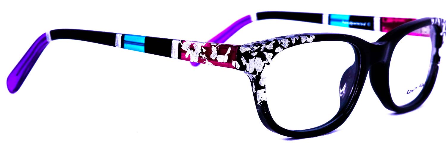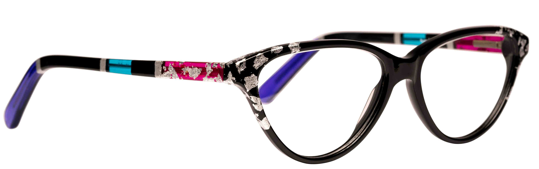 Opaque Black front with Silver leaf applique. Temples in Transparent/Opaque color blocking with Silver leaf applique.