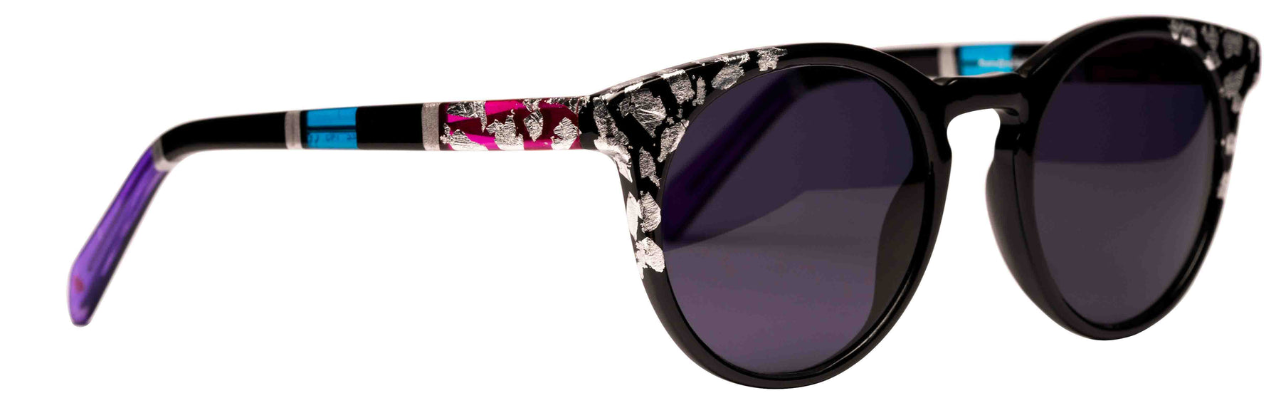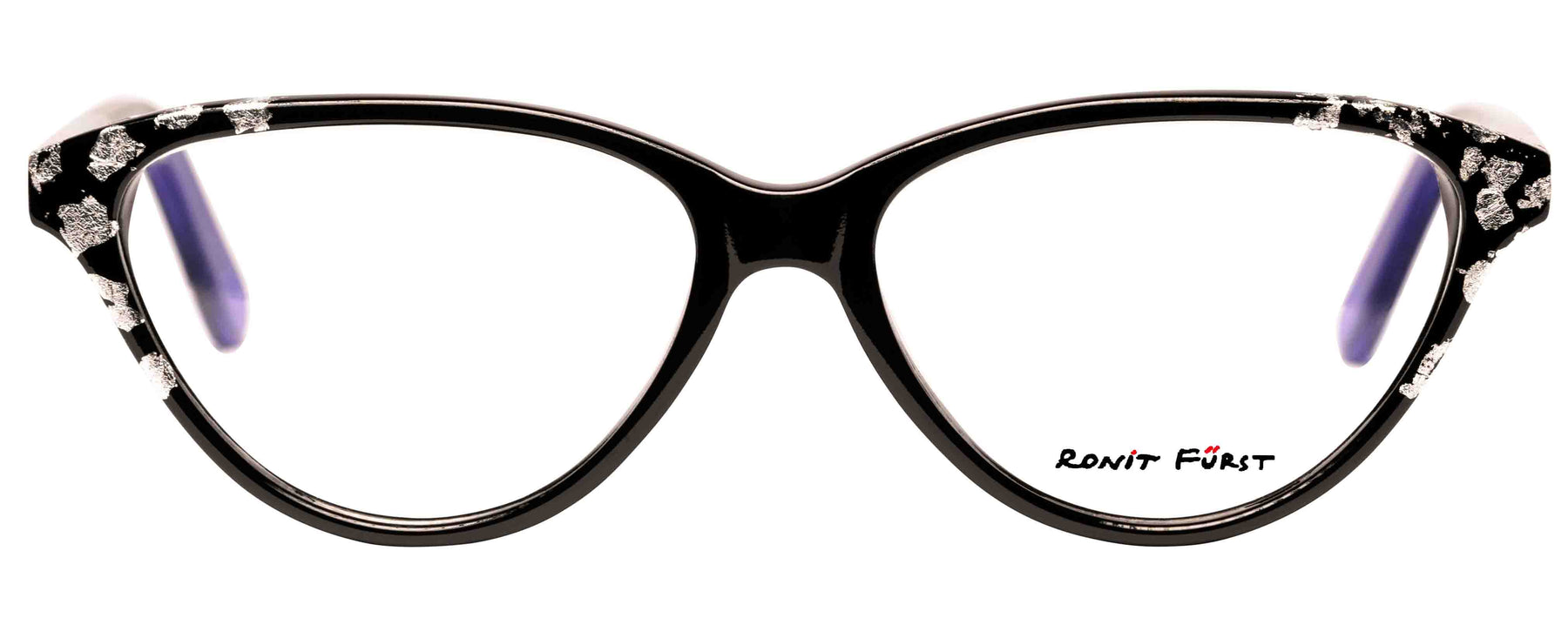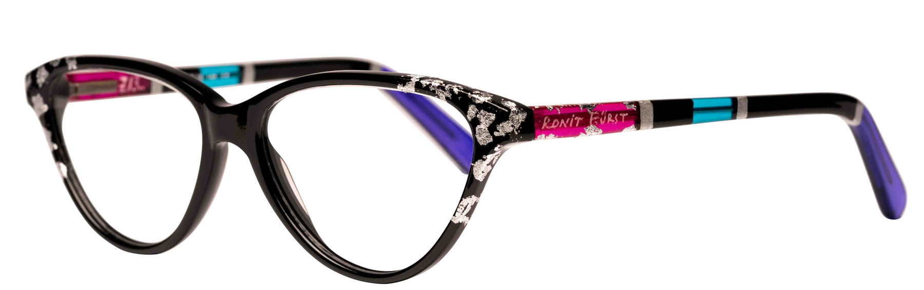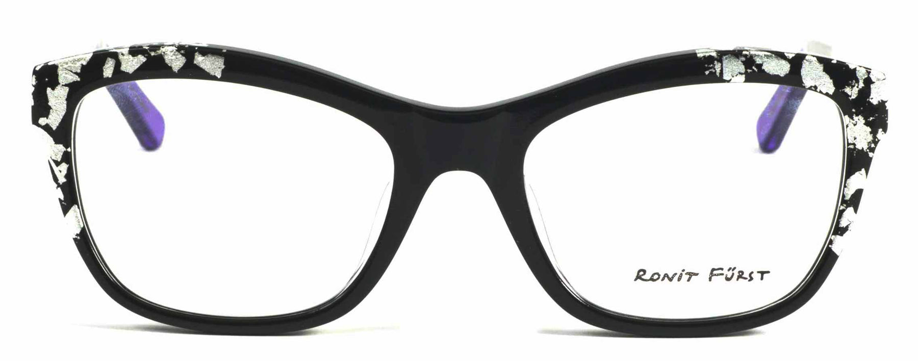 Opaque Black front with Silver leaf applique. Temples in Transparent/Opaque color blocking with Silver leaf applique.