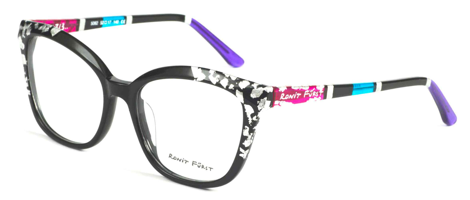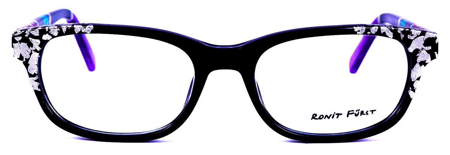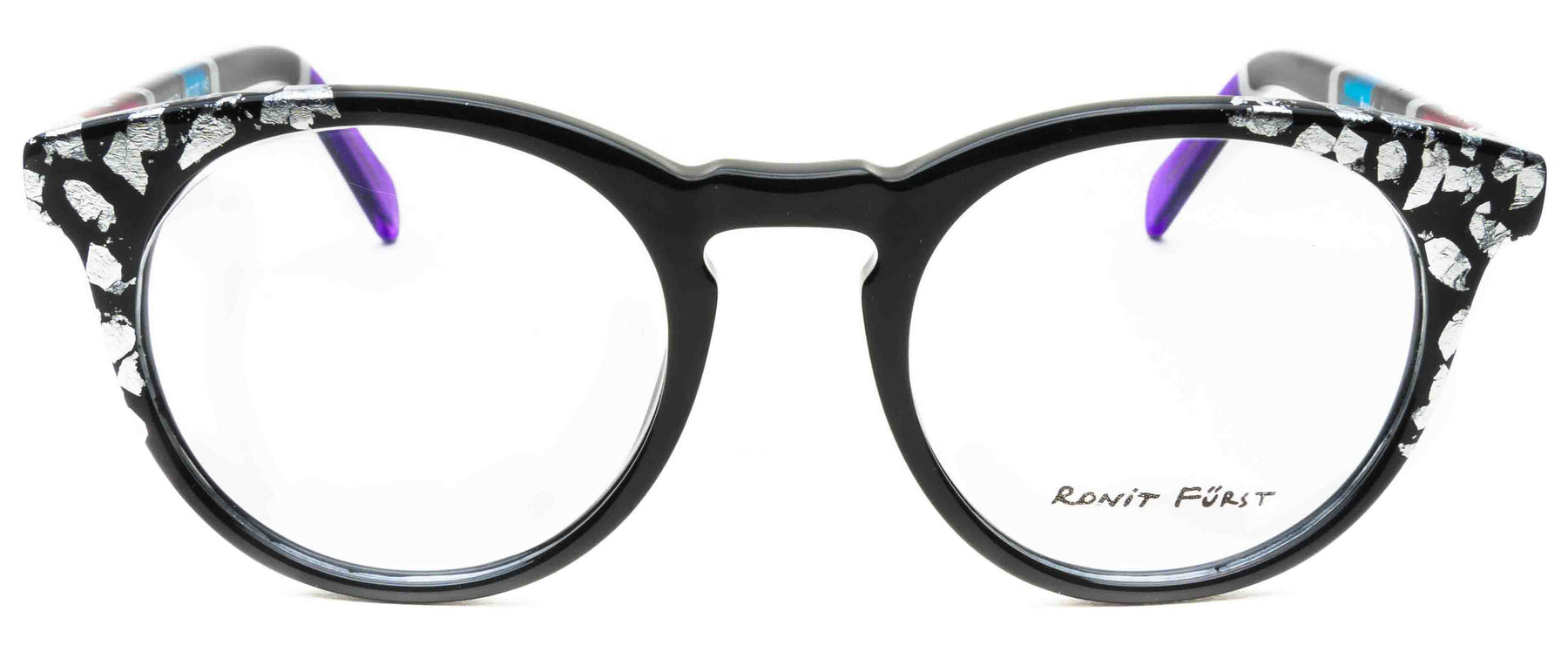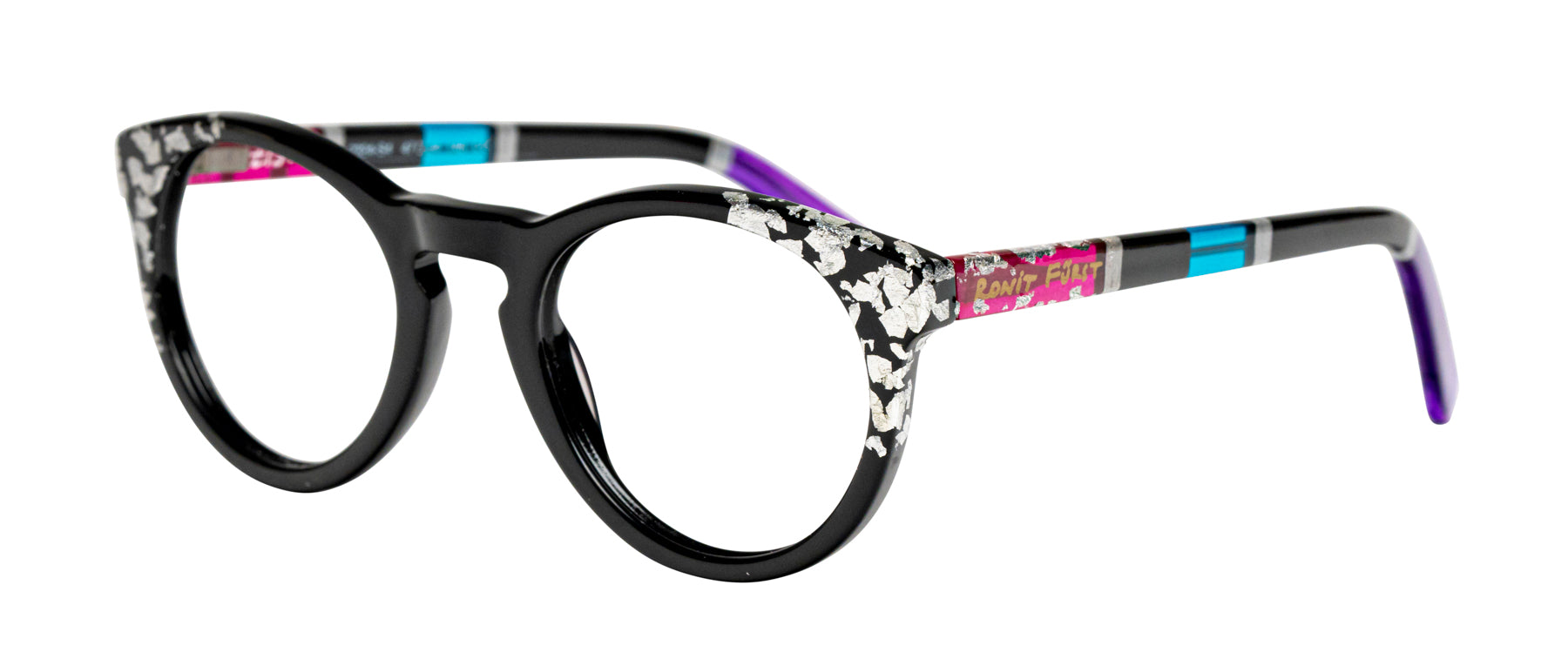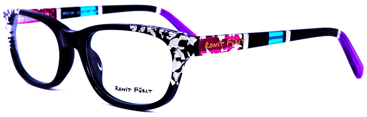 Opaque Black front with Silver leaf applique. Temples in Transparent/Opaque color blocking with Silver leaf applique.