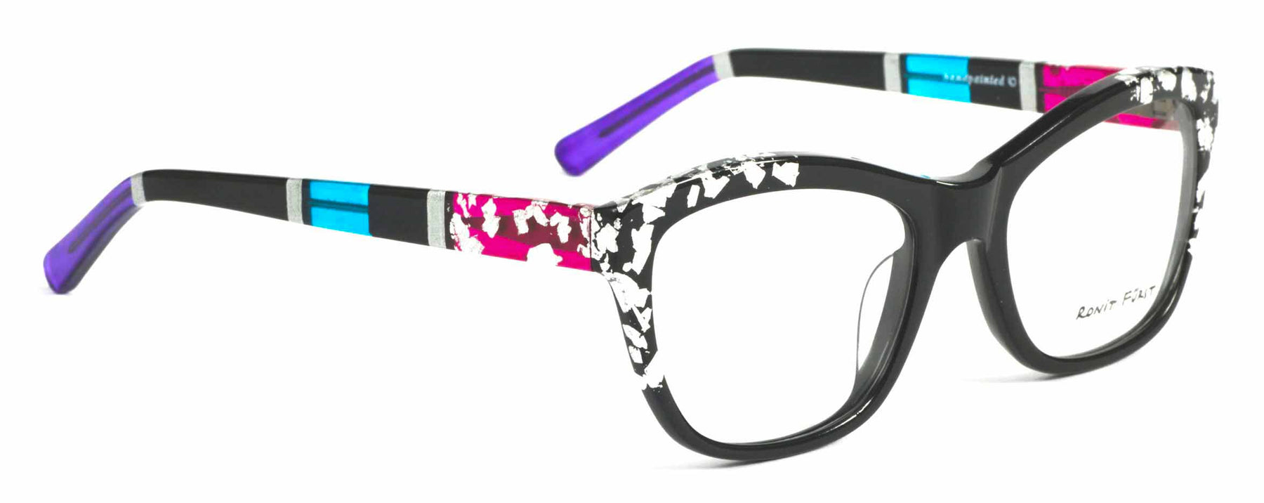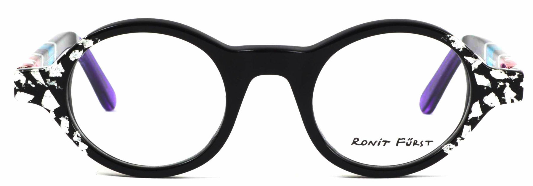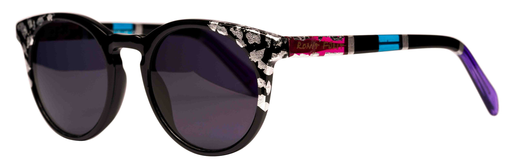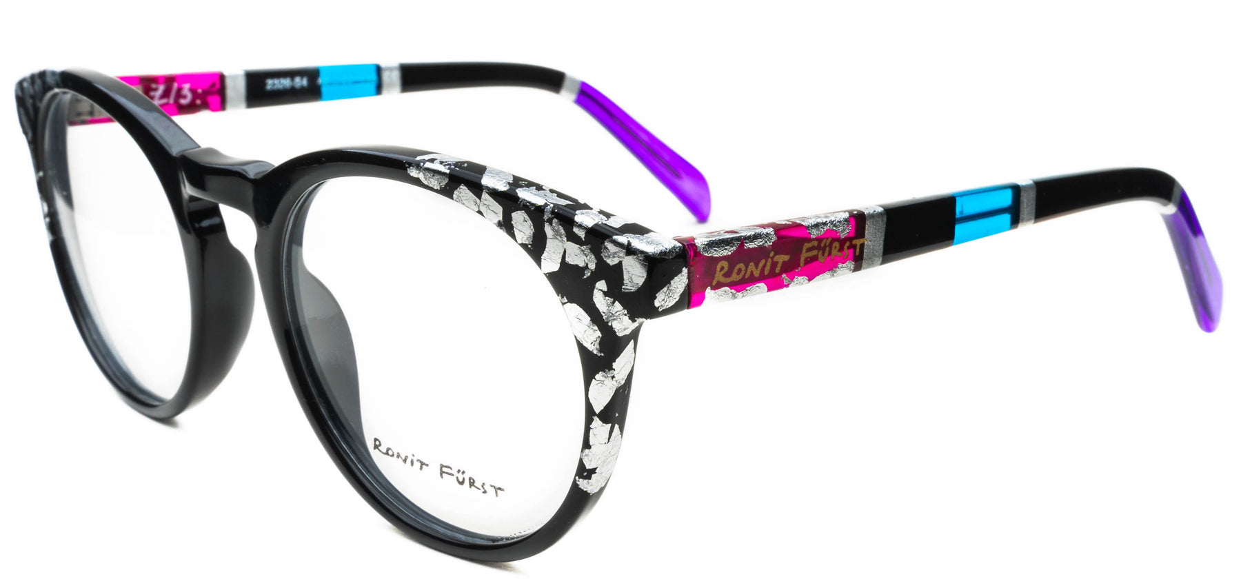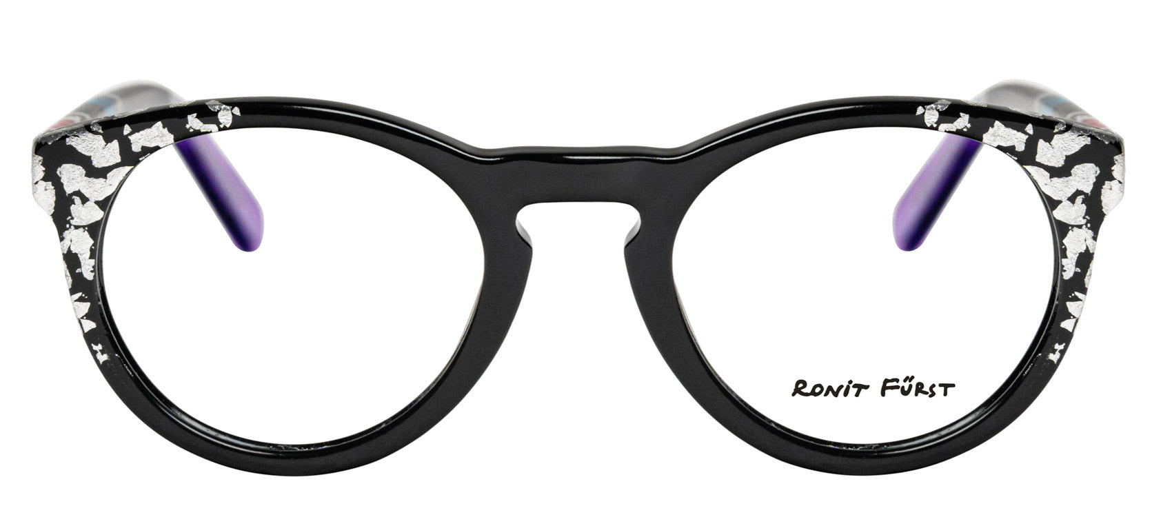 Opaque Black front with Silver leaf applique. Temples in Transparent/Opaque color blocking with Silver leaf applique.