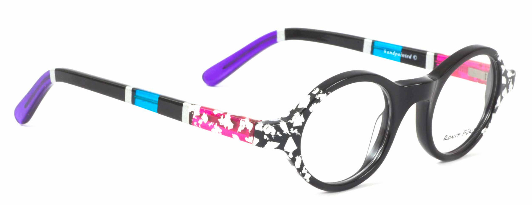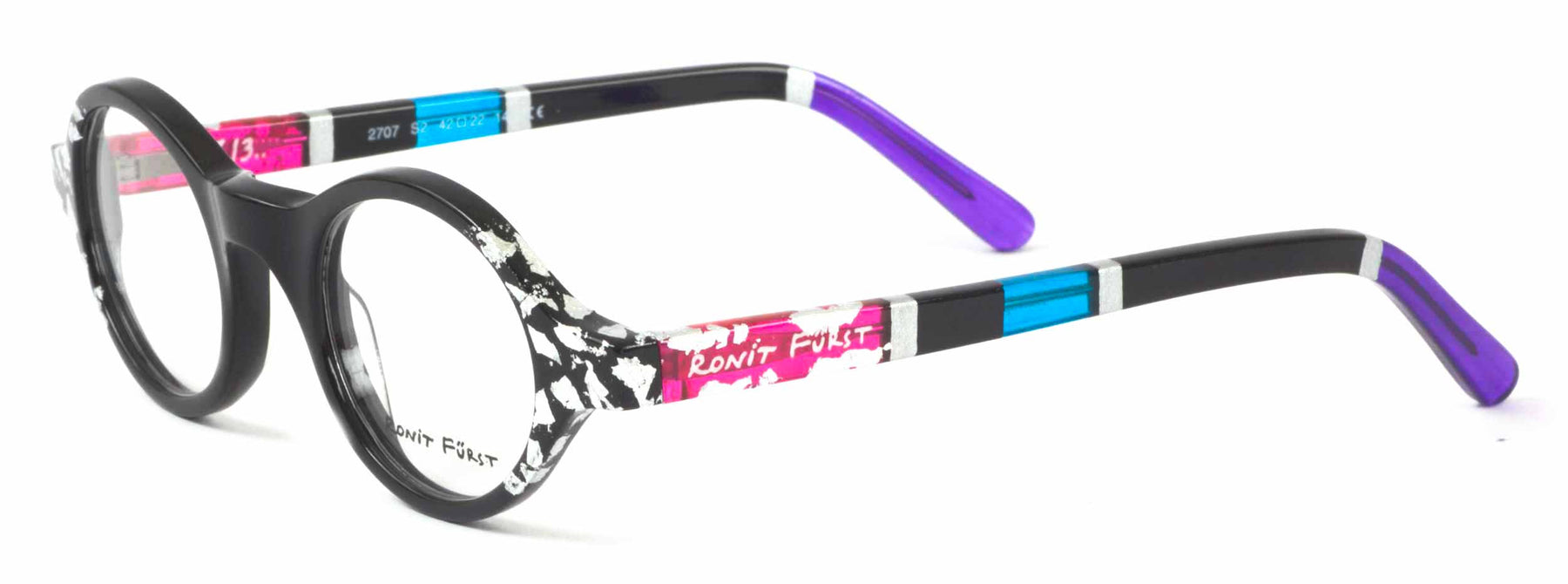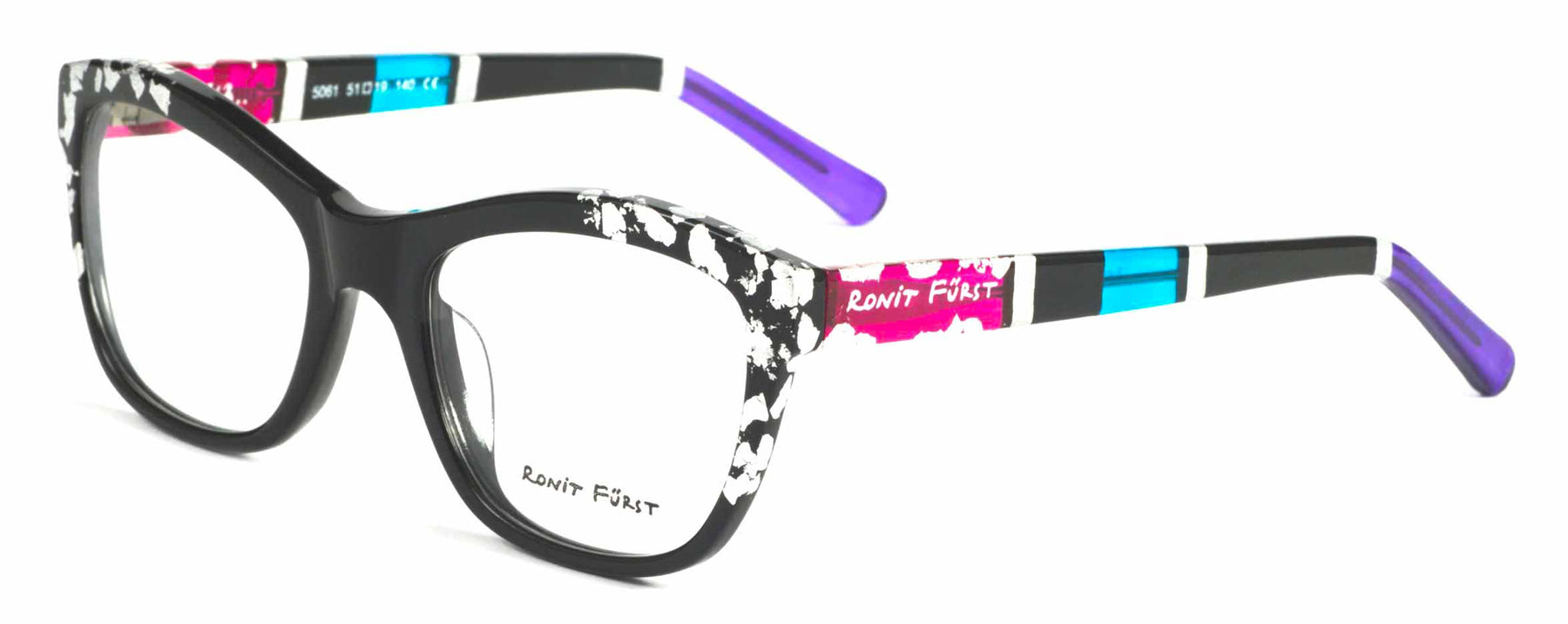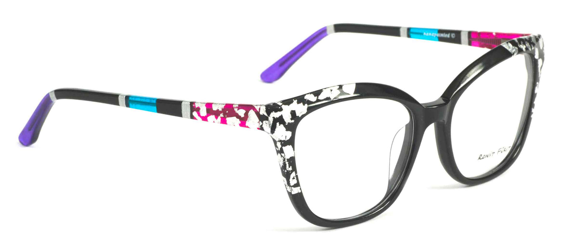 Opaque Black front with Silver leaf applique. Temples in Transparent/Opaque color blocking with Silver leaf applique.