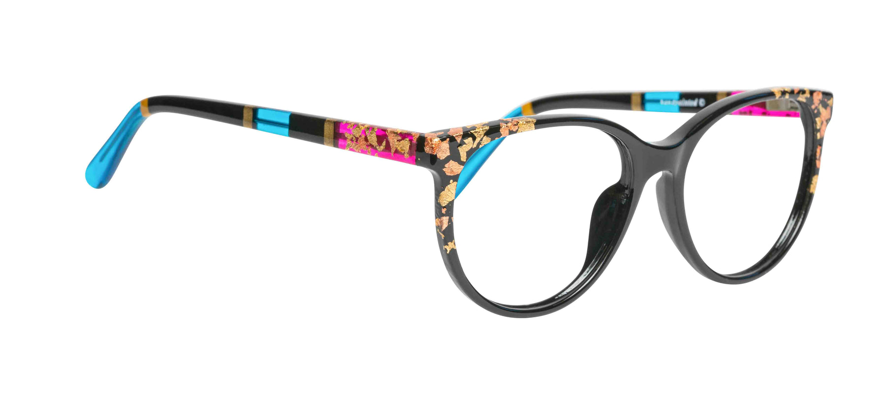 Color Z3, Opaque Black front with Yellow and Rose Gold leaf applique'. Temples in Transparent/Opaque color blocking with Gold leaf applique'.