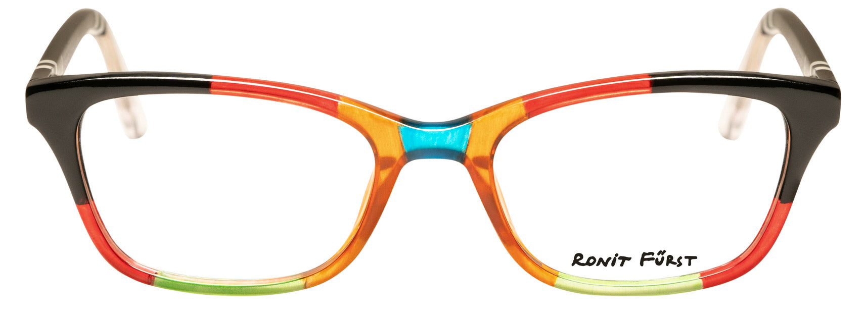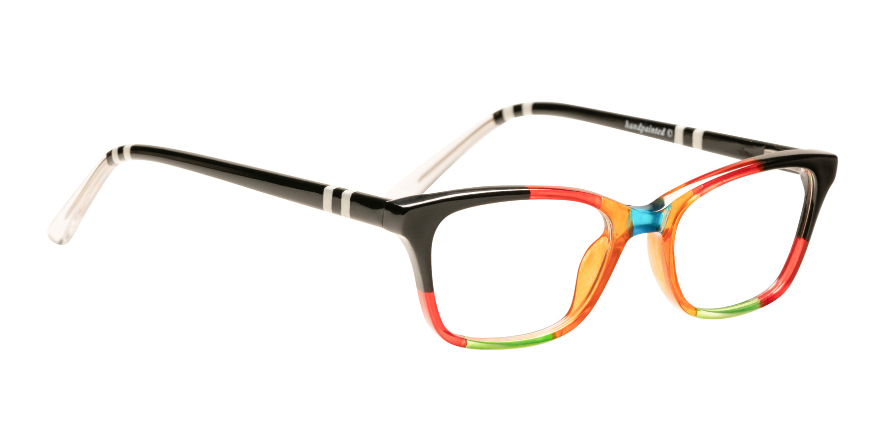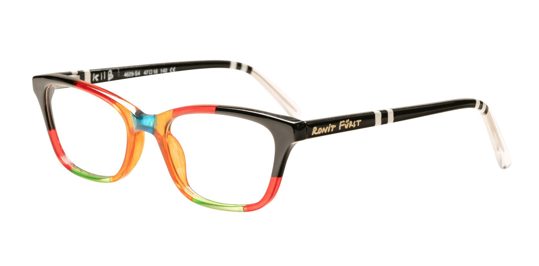 Color K11B, Multicolor Opaque Black and Transparent Orange, Red and Green front. Temples in Opaque Black with Opaque White stripes.