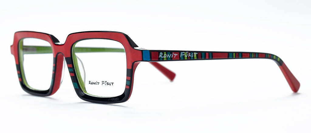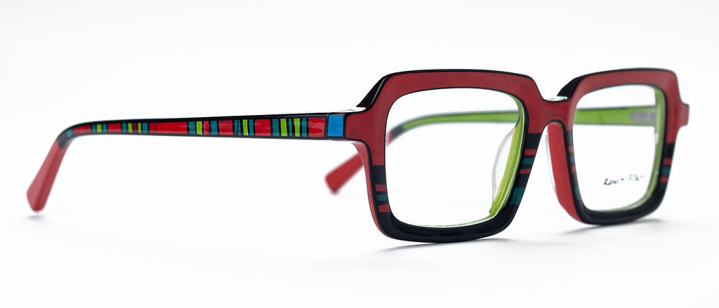 Color SP1, Vibrant Red frame contrasted with Black edges and Green and Black striped accentst. The temples continue the lively striped pattern in shades of Red, Green, and Teal, adding a playful and dynamic touch to the design.