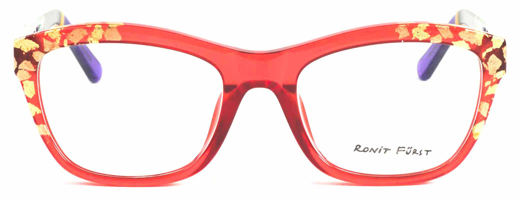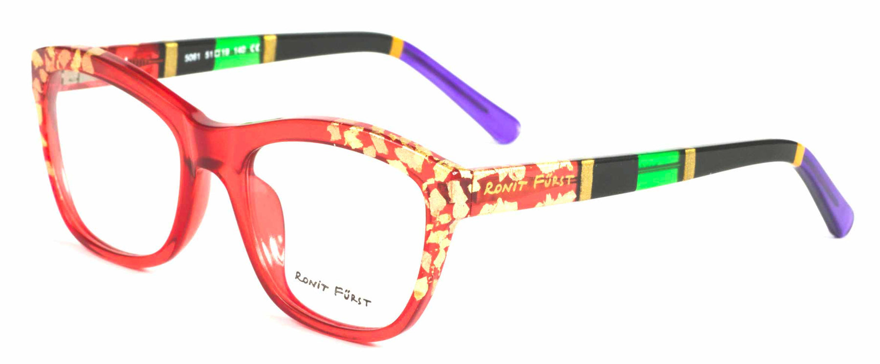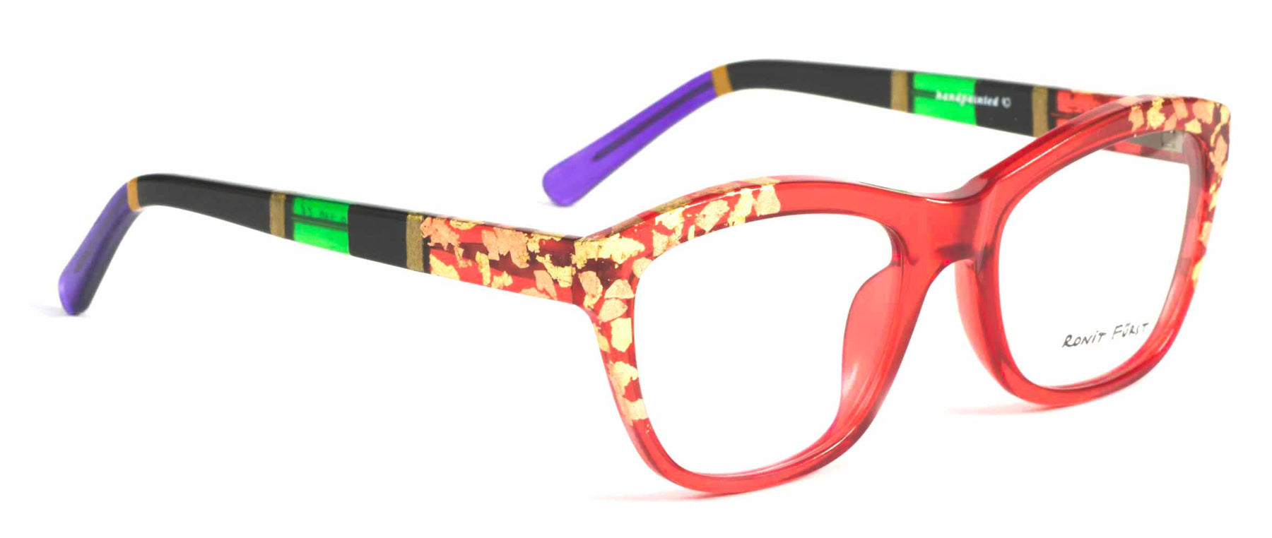 Color Z1, Transparent Red front with Yellow and Rose Gold leaf applique'. Temples in Transparent/Opaque color blocking with Gold leaf applique'.