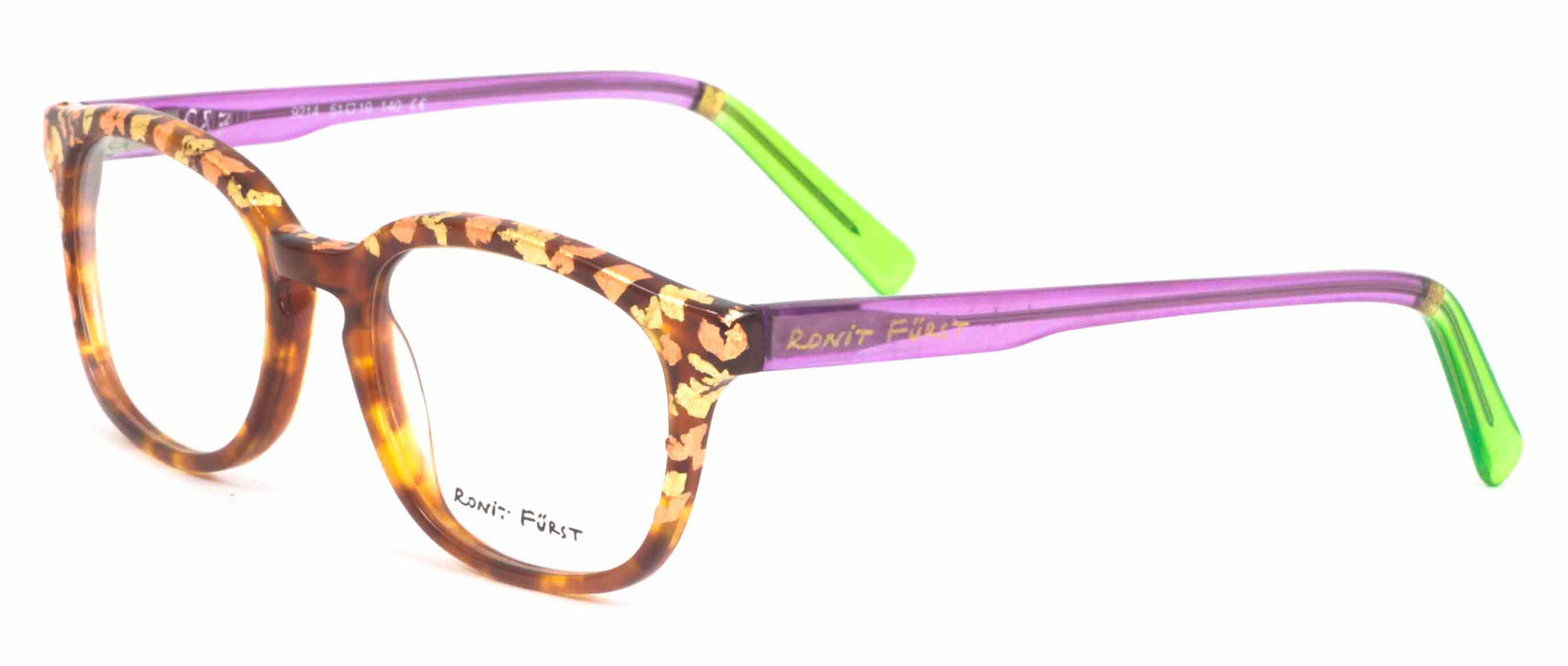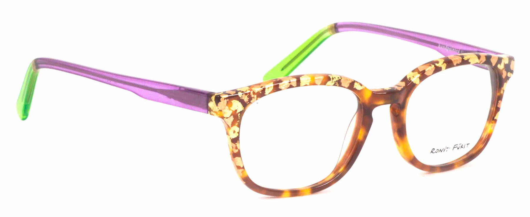 Color G8Z, Tortoiseshell front with Yellow and Rose Gold leaf applique'. Temples in Transparent Purple and Green.
